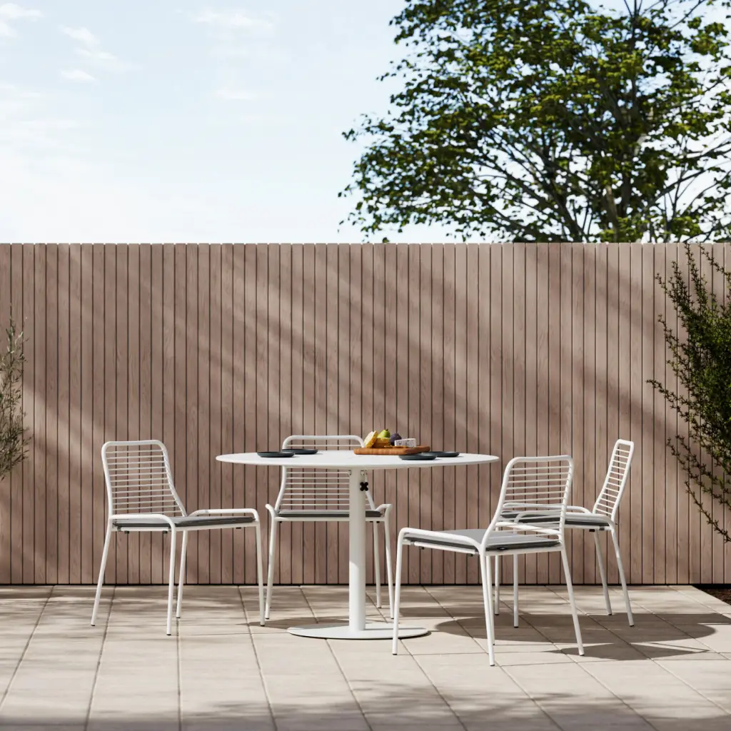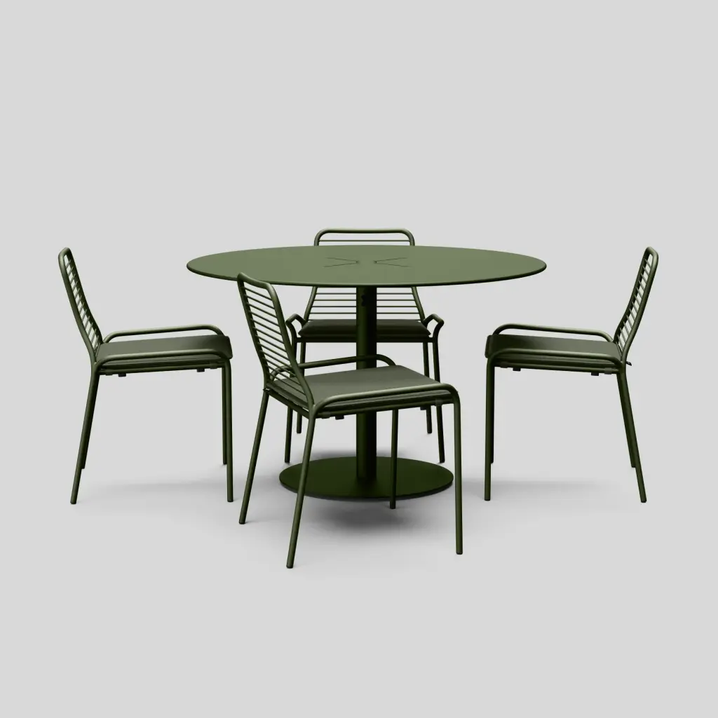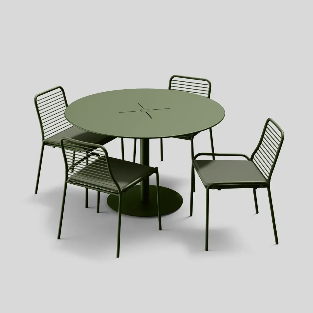 Made of steel and cast aluminum with a durable powder-coated finish, the XY Dining Set is minimal, airy, and functional. The 48” round table is the ideal size for shared meals and meetings. Stackable chairs feature a removable cushion made with quick-dry foam and Sunbrella® fabric. Table base also acts as a secure all-weather umbrella base.
