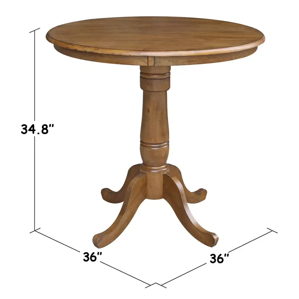 For those who appreciate high quality wood furniture with a traditional and elegant look. International Concepts home furnishings will complement any décor. This Table is made of solid wood ensuring years of use. The table features a butcher block top and a pedestal base with four feet for maximum support. It has a beautiful pecan finish. The round table top measures 36" W x 36" D, and is available in standard dining height, counter height, and bar height options. The standard dining height table is for use with dining chairs and is 28.9" H. The counter height table is used with counter height stools and is 34.9" H. The bar height table is 40.9" H and is used with bar stools. This Solid Wood table ships ready to assemble.