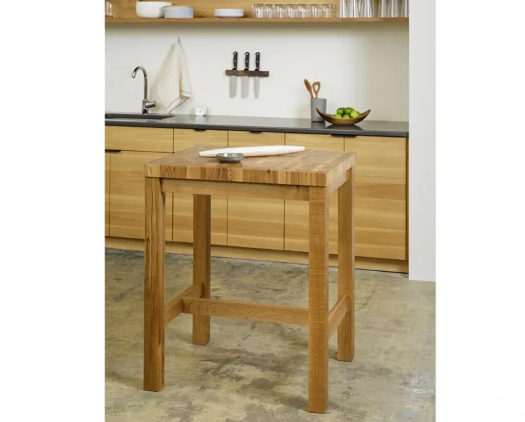 The Joinery Butcher Block Islands can be used for food preparation or double as a kitchen table. This lovely and versatile kitchen utility table adds warmth, character and storage space to any kitchen. They come in three sizes – and can be made from any of our six standard wood species in either edge grain or end grain.The bottom stretcher makes for a convenient footrest and allows stools to be tucked in under the table to further maximize space.