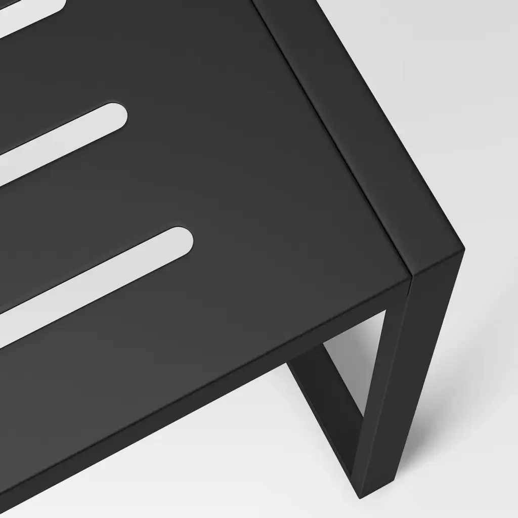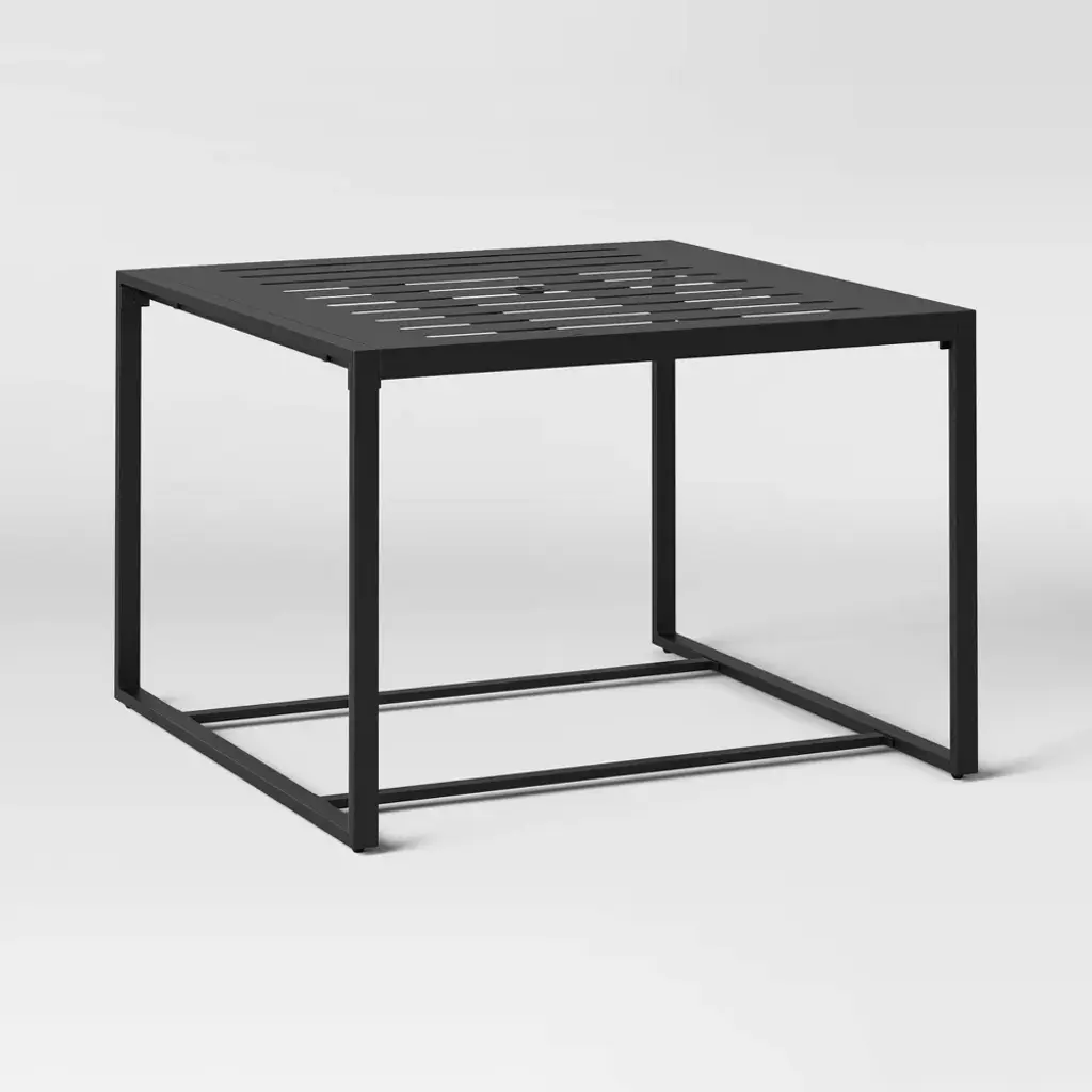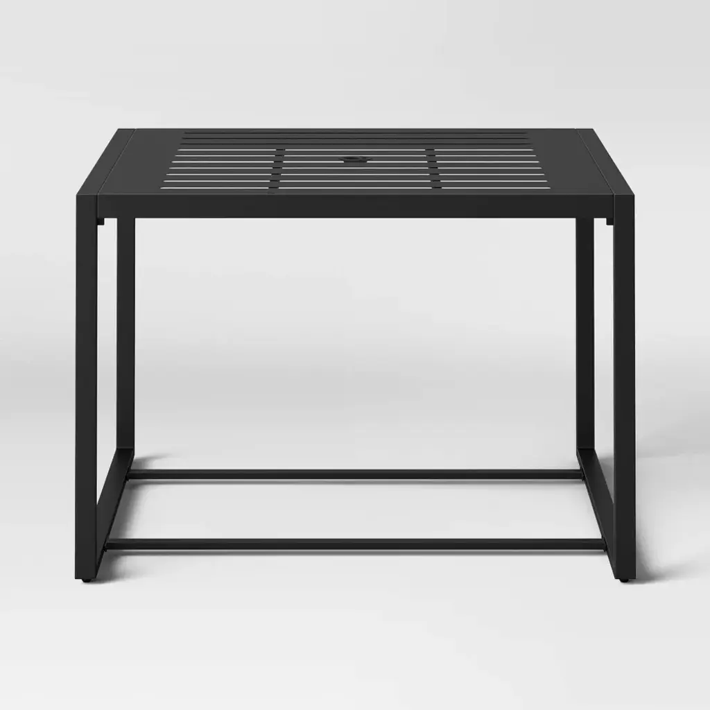 Create a beautiful outdoor dining setup with the Henning 4-Person Rectangle Patio Dining Table from Project 62™. Made with metal, this rectangular dining table features slatted design on top for an appealing look. It comes with an umbrella hole to help provide a little shade when needed. Boasting an all-weather design and rust resistance, this black dining table complements a variety of outdoor settings and accommodates up to four people. Simply add coordinating chairs to enjoy conversations with family or friends outdoors. Project 62™: Modern pieces made for everyday living.