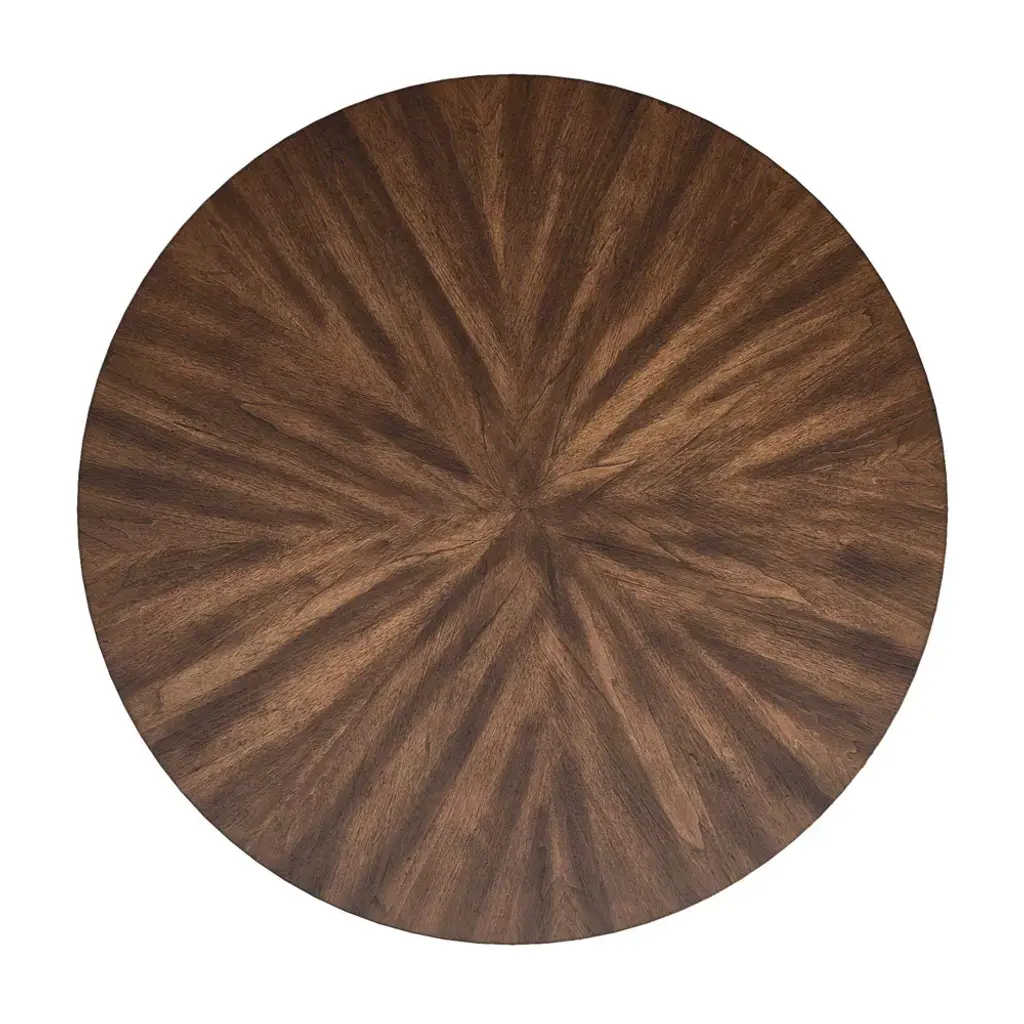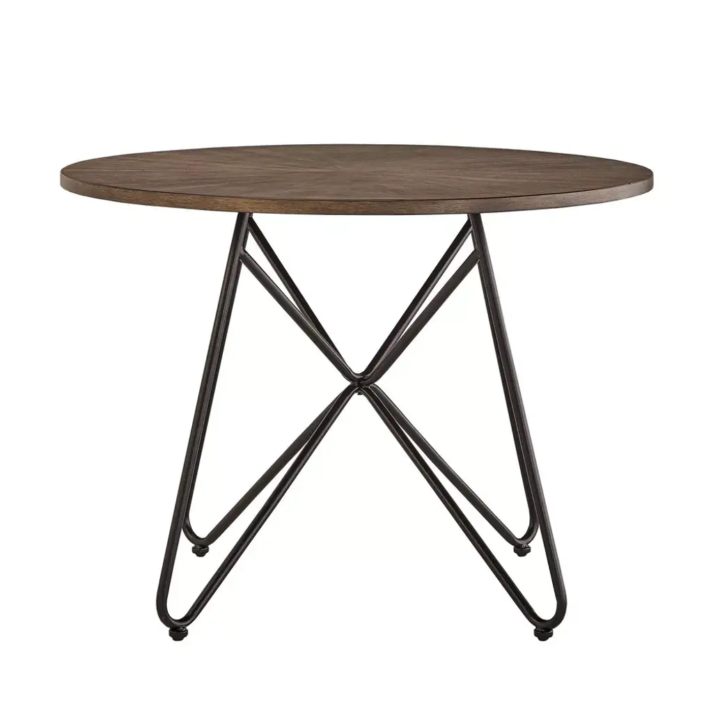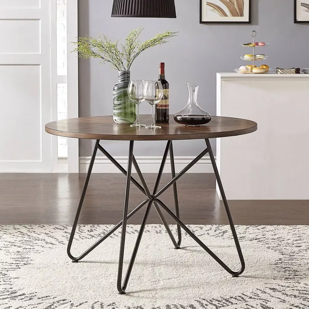 Simple yet transitional, the Leonard Walnut Finish Round Dining Table With Black Iron Legs from Inspire Q is perfect for your eat-in kitchen or casual dining setting. Gather your closest friends around the smooth, round table top for happy hour, game night, or Sunday brunch. An industrial look is created from the black iron pedestal-like base while the walnut finished table top offers some traditional charm for a beautiful contrast.