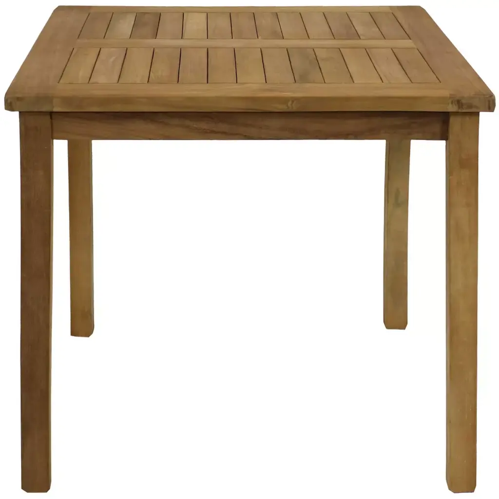 Use this elegant, square table in any outdoor living space to enjoy its classic style. Great for game nights with friends and family, snacks during parties and barbecues, and cozy dinners on a nice night, this table can be used in a variety of indoor or outdoor locations. The dining table features premium teakwood construction to keep a natural, wooden look and has a brown wood stain for increased weather resistance and long-lasting strength. The table features a wooden plank design on the top and four, sturdy legs in each corner to keep it steady. This table is wonderful for putting in the corner or used as a focal point in any area in need of an elegant and functional piece. Place it on the patio, deck, terrace, garden, or yard.• STYLISH PATIO DINING TABLE: The square outdoor table measures 31.5" square x 29.5" H and weighs 39 lbs. The weight capacity is 200 lbs.• DESIGNED FOR LASTING BEAUTY: This square patio table features solid premium teak construction with a light brown wood stain finish.• TABLE CAN ACCOMMODATE 1-4 CHAIRS: Several people can sit around this stylish table (chairs not included).• MULTIPLE USES: Use on the patio, in the backyard, on the deck, on the porch for dining al fresco.• WORRY-FREE PURCHASING: Sunnydaze Decor backs its products with a 1-year manufacturer's warranty.