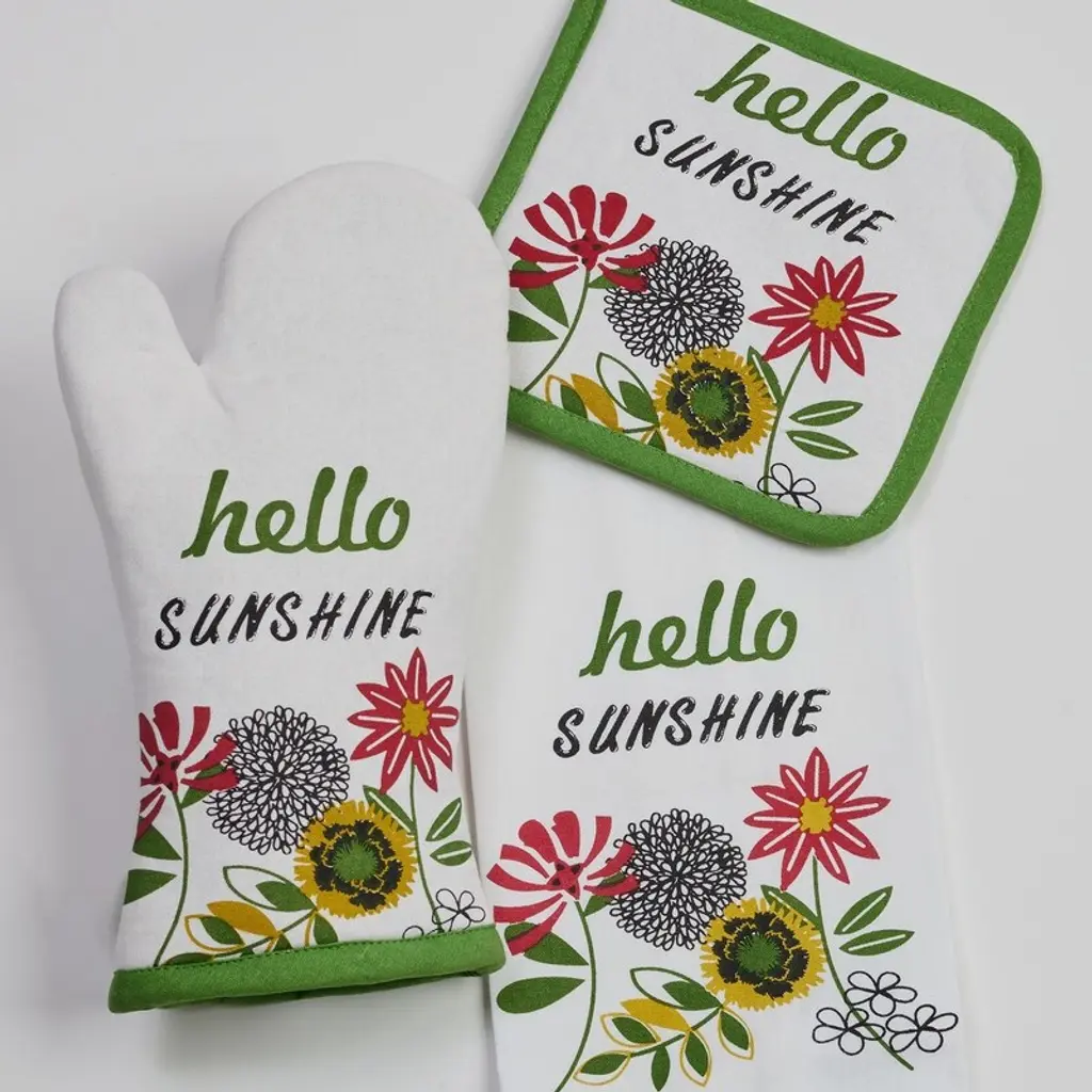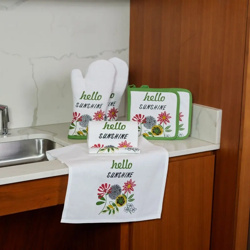 Brighten up your kitchen with the cheerful Hello Sunshine Kitchen Set. This 6-piece set features a vibrant floral pattern and the uplifting phrase "Hello Sunshine" on each piece. Crafted from soft, durable 100% cotton, this set is both functional and stylish. Perfect for adding a touch of sunshine to your daily cooking and baking routine. 6-piece set: Includes 2 kitchen towels, 2 pot holders, and 2 oven mitts. Vibrant floral design: Features a colorful floral pattern with the phrase "Hello Sunshine." Soft and durable: Made from 100% cotton for a comfortable and long-lasting feel. Functional and stylish: Ideal for protecting your hands and surfaces while cooking and baking. Machine washable: Easy care Made in India: High-quality craftsmanship from India.