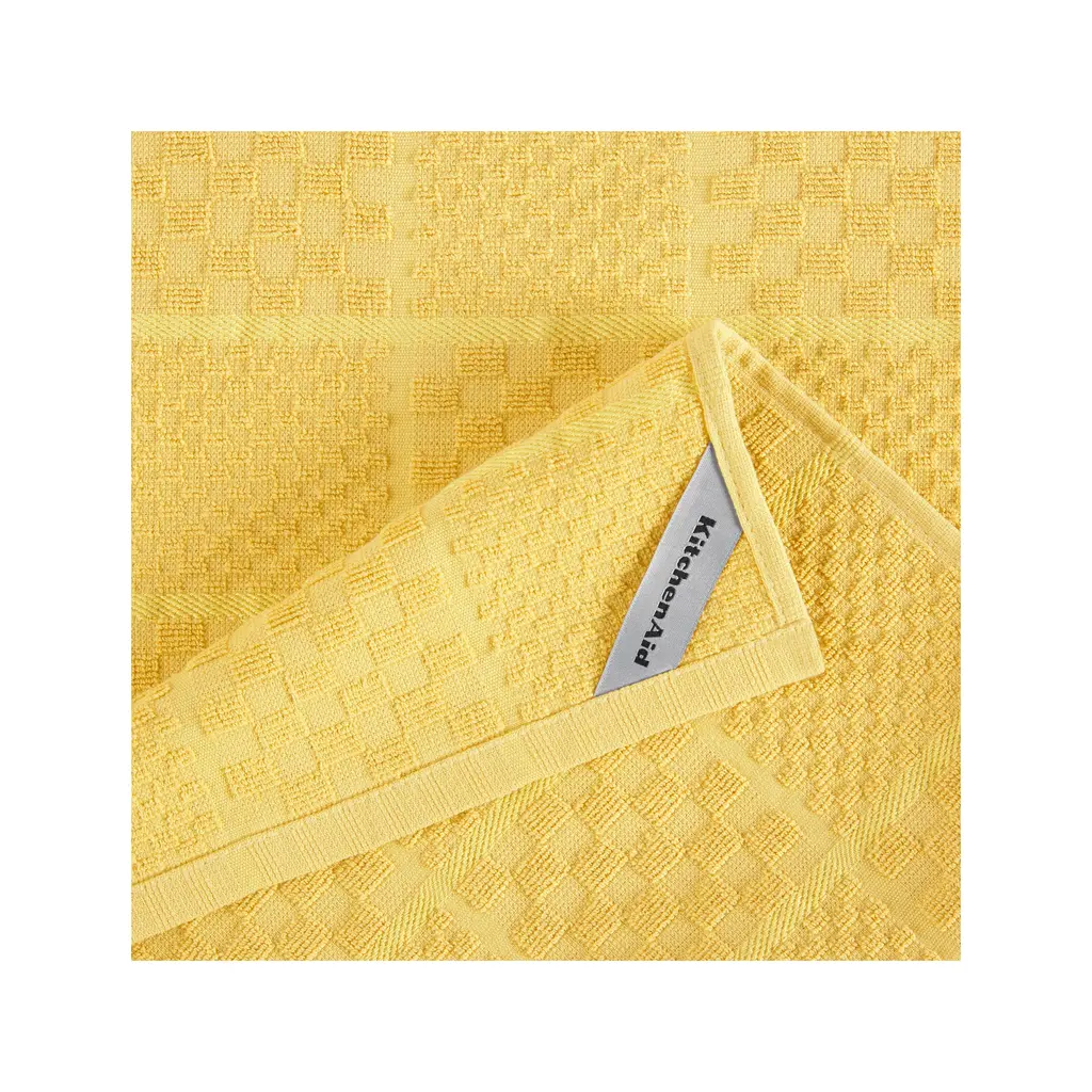 Get kitchen tasks done with the help of the KitchenAid Onion Quilt 4-Pack in Aqua Sky. This set includes two terry dobby kitchen towels, a pot holder, and an oven mitt, all with a combination of a modern solid and trellis design. The oven mitt and pot holder offer heat protection while handling hot pots, pans, dishes, and cookware. The kitchen towels are soft and absorbent. This set is machine washable for easy care. KitchenAid Quilted Cotton Terry Cloth Oven Mitt, Pot Holder, Kitchen Towel 4-Pack Set, 2025 Color of the Year Butter Dimensions: large kitchen towels 16”x26”, long oven mitt 7”x13”, wide rectangular pot holder 7”x10” Set includes two absorbent, textured terrycloth kitchen towels, one dual-layered quilted pot holder, and one dual-layered oven mitt with a non-slip silicone grip and high heat resistance Made of insulated, heat resistant cotton, this oven mitt and pot holder set protects hands, forearms, and countertops from heat while cooking and baking Printed silicone provides a strong non-slip grip while handling hot pots, and and dishes Kitchen towels are absorbent and dual purpose for cleaning spills and drying dishes lint-free Easy care set: kitchen towels, machine wash cold, gentle cycle with like colors, only non-chlorine bleach, tumble dry low, remove promptly, do not iron - oven mitt & pot holder, machine wash cold, gentle cycle with like colors, only non-chlorine bleach, lay flat to dry, do not iron. Hang all pieces using decorative loop to dry or store