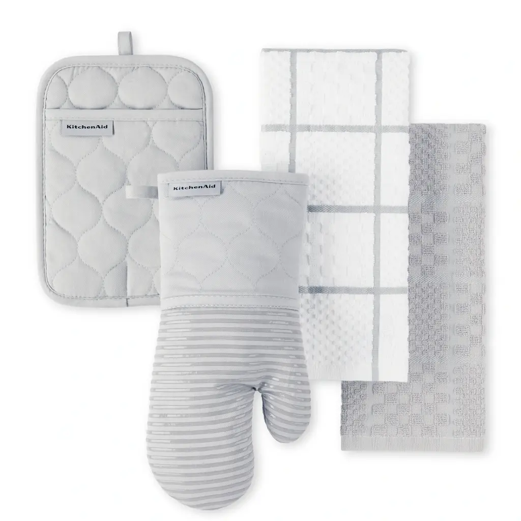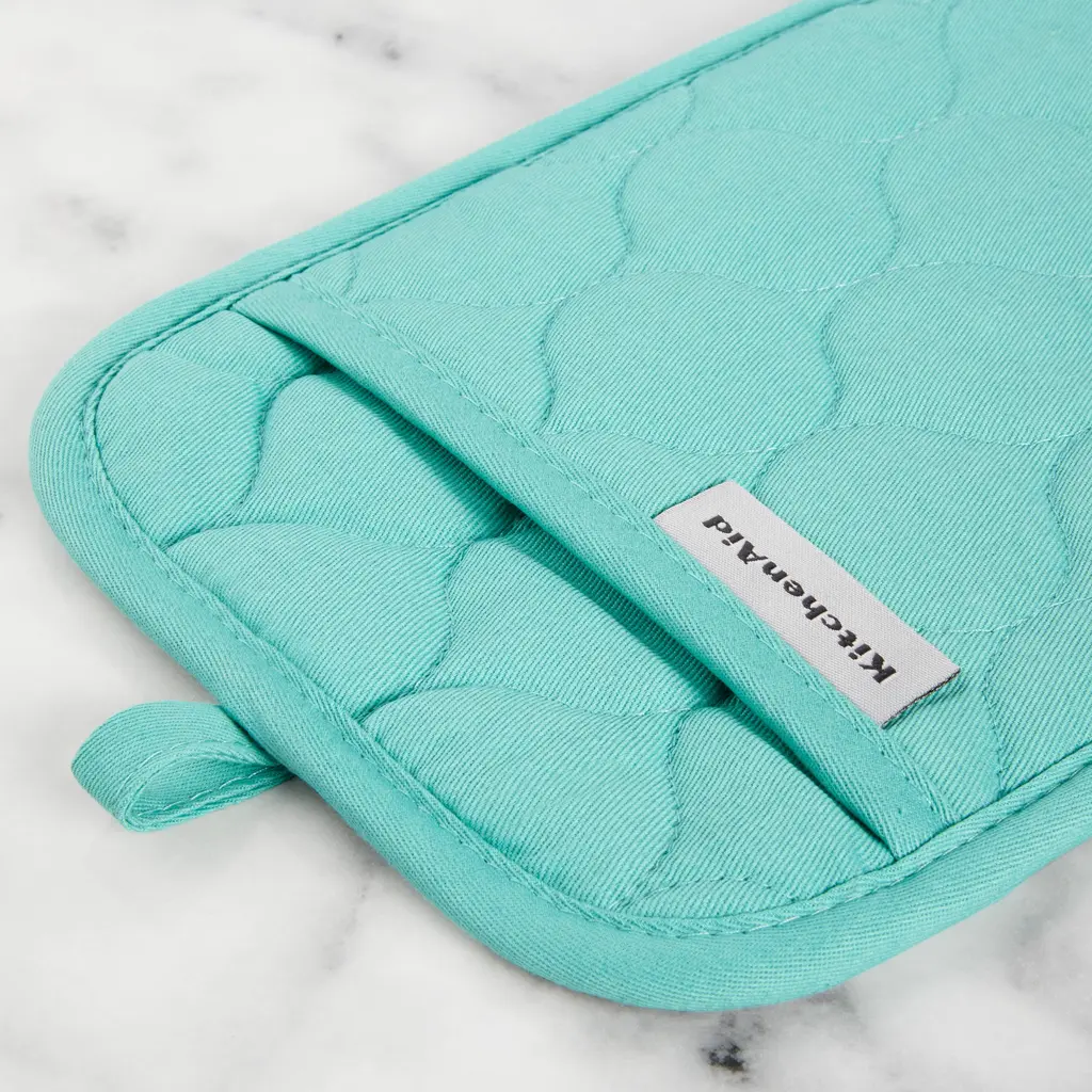 Get kitchen tasks done with the help of the KitchenAid Onion Quilt 4-Pack in Aqua Sky. This set includes two terry dobby kitchen towels, a pot holder, and an oven mitt, all with a combination of a modern solid and trellis design. The oven mitt and pot holder offer heat protection while handling hot pots, pans, dishes, and cookware. The kitchen towels are soft and absorbent. This set is machine washable for easy care. KitchenAid Quilted Cotton Terry Cloth Oven Mitt, Pot Holder, Kitchen Towel 4-Pack Set, 2025 Color of the Year Butter Dimensions: large kitchen towels 16”x26”, long oven mitt 7”x13”, wide rectangular pot holder 7”x10” Set includes two absorbent, textured terrycloth kitchen towels, one dual-layered quilted pot holder, and one dual-layered oven mitt with a non-slip silicone grip and high heat resistance Made of insulated, heat resistant cotton, this oven mitt and pot holder set protects hands, forearms, and countertops from heat while cooking and baking Printed silicone provides a strong non-slip grip while handling hot pots, and and dishes Kitchen towels are absorbent and dual purpose for cleaning spills and drying dishes lint-free Easy care set: kitchen towels, machine wash cold, gentle cycle with like colors, only non-chlorine bleach, tumble dry low, remove promptly, do not iron - oven mitt & pot holder, machine wash cold, gentle cycle with like colors, only non-chlorine bleach, lay flat to dry, do not iron. Hang all pieces using decorative loop to dry or store