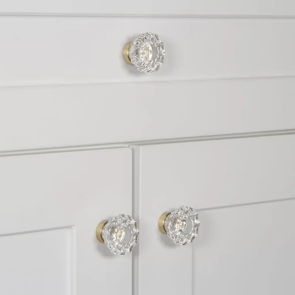 A clear glass ribbed knob with a brass stem is a stunning blend of texture and elegance. The ribbed glass design catches the light, creating a sparkling effect, while the warm brass stem adds a vintage touch. This knob is perfect for adding a sophisticated and classic accent to cabinets, drawers, or furniture. Its timeless appeal complements both modern and traditional décor styles.