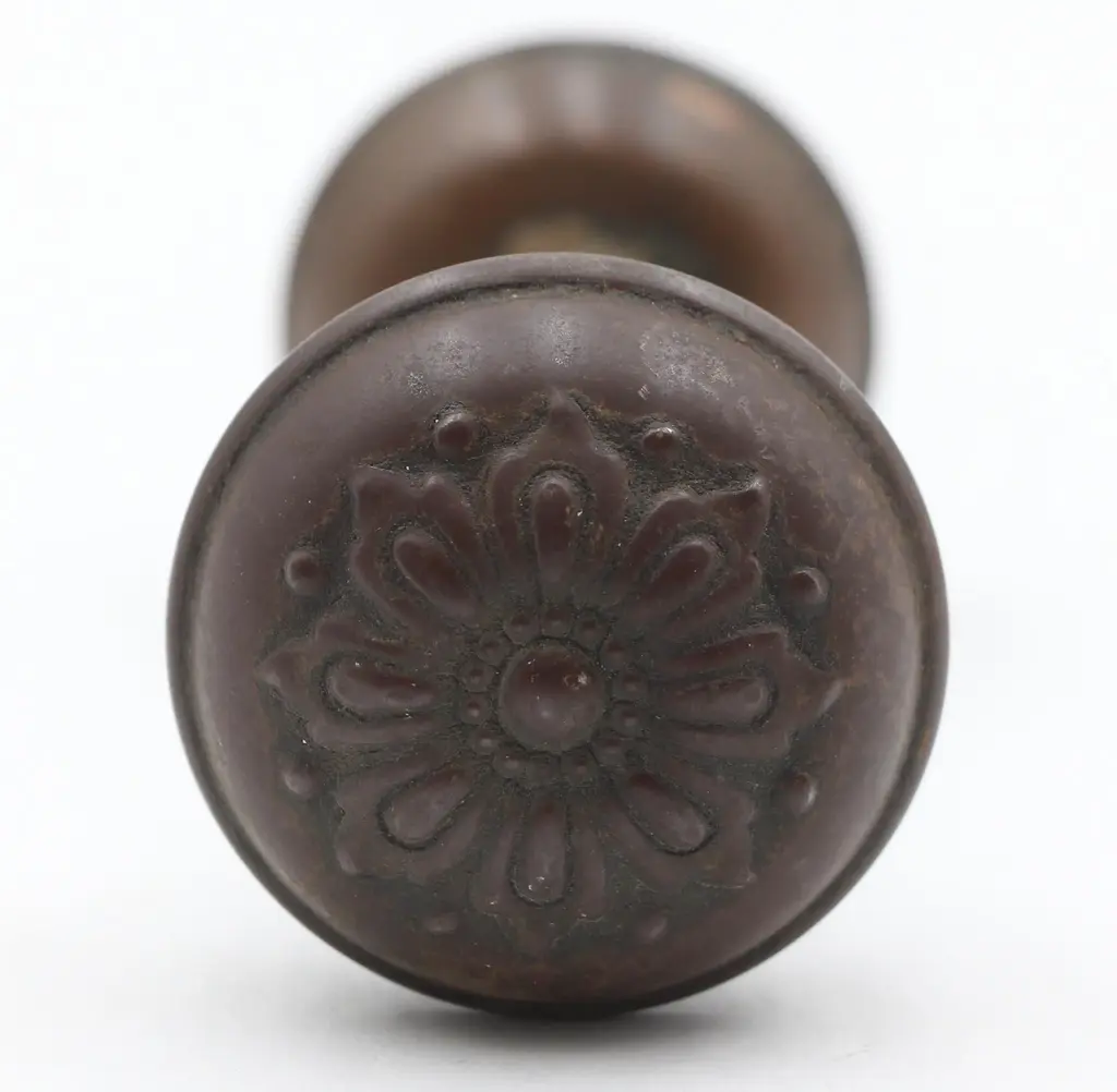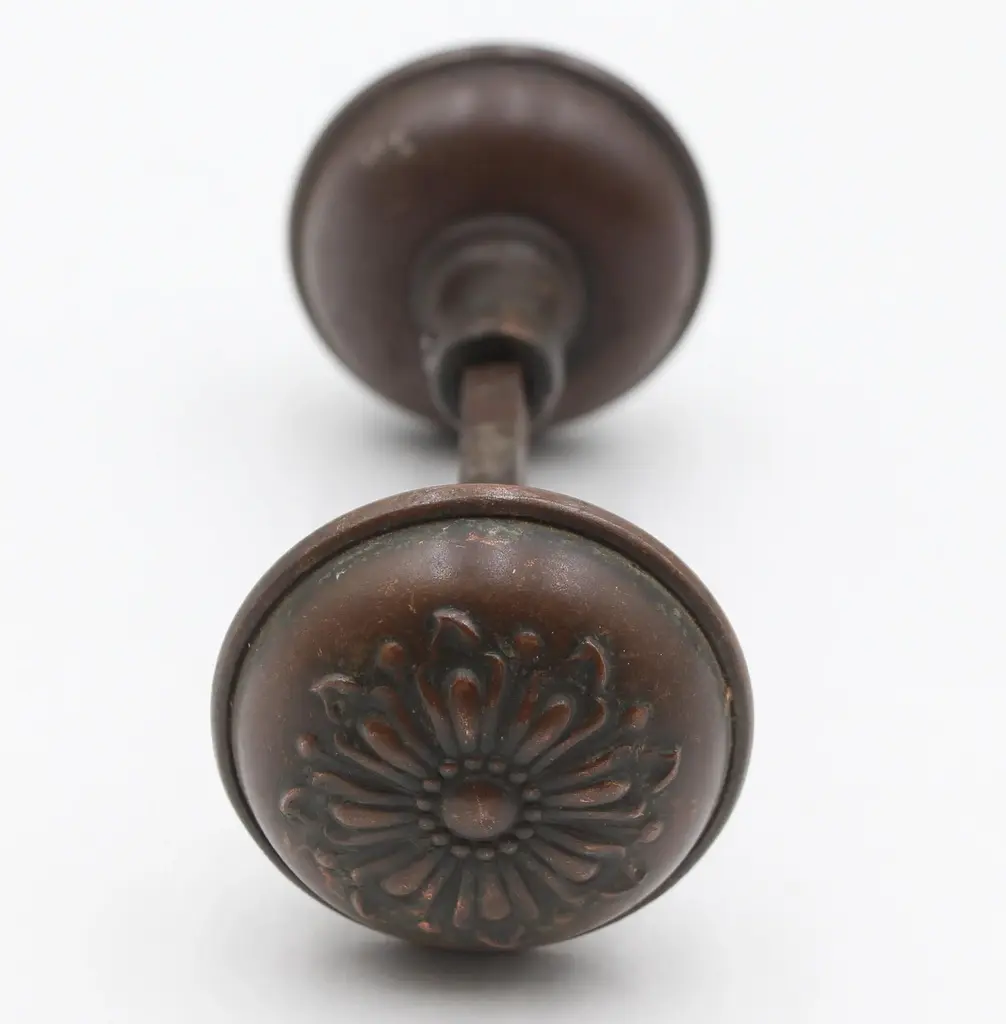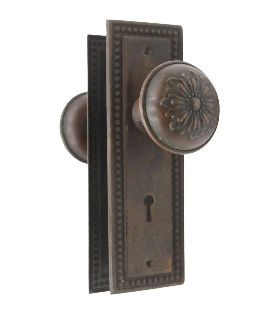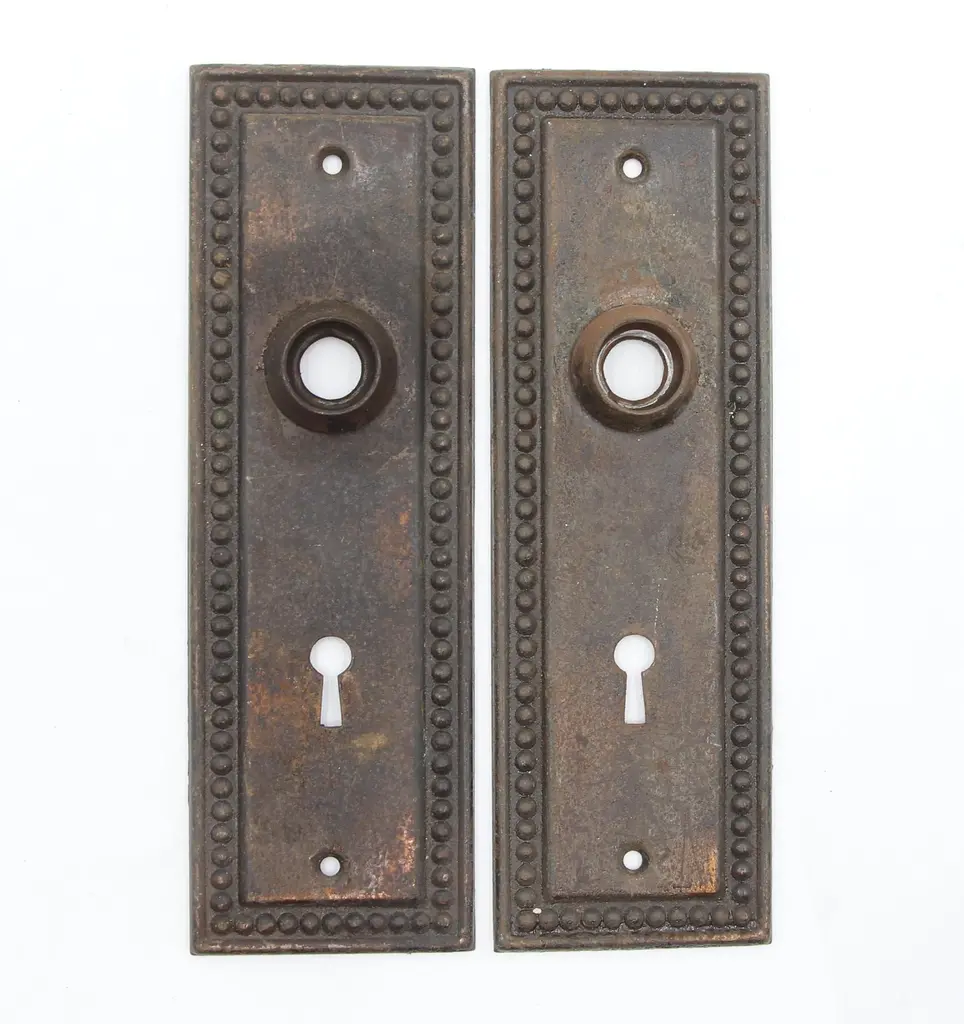 These antique eight fold door knobs were made by Sargent in the 1901 catalog. They are part of the K-31100 'RD' Design. The back plates are made of steel in a rectangular shape with a beaded design. The original mounting screws are not available. Good condition with surface wear and rust from prior use. Priced as two door knobs, two back plates, and a spindle. Priced each. The manufacturer and exact date of creation are unknown. The dimensions are Knob 2.25 in. diameter x 2.375 in. D, plate 7 in. H x 2.25 in. W x 0.375 in. D, drop 2.25 in.
