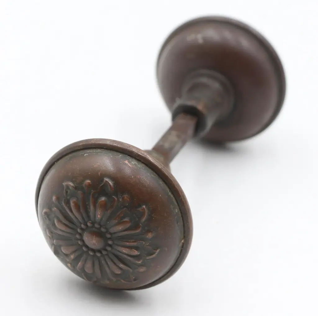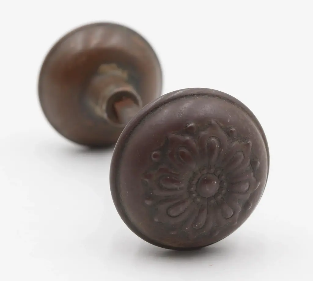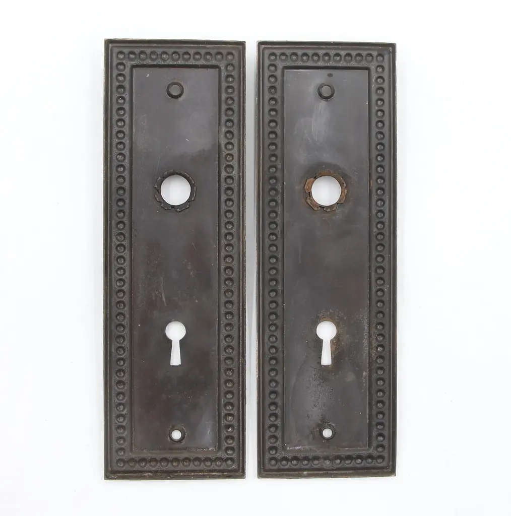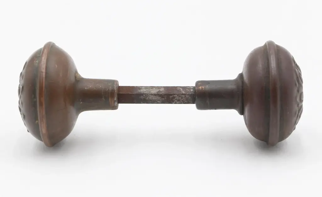 These antique eight fold door knobs were made by Sargent in the 1901 catalog. They are part of the K-31100 'RD' Design. The back plates are made of steel in a rectangular shape with a beaded design. The original mounting screws are not available. Good condition with surface wear and rust from prior use. Priced as two door knobs, two back plates, and a spindle. Priced each. The manufacturer and exact date of creation are unknown. The dimensions are Knob 2.25 in. diameter x 2.375 in. D, plate 7 in. H x 2.25 in. W x 0.375 in. D, drop 2.25 in.