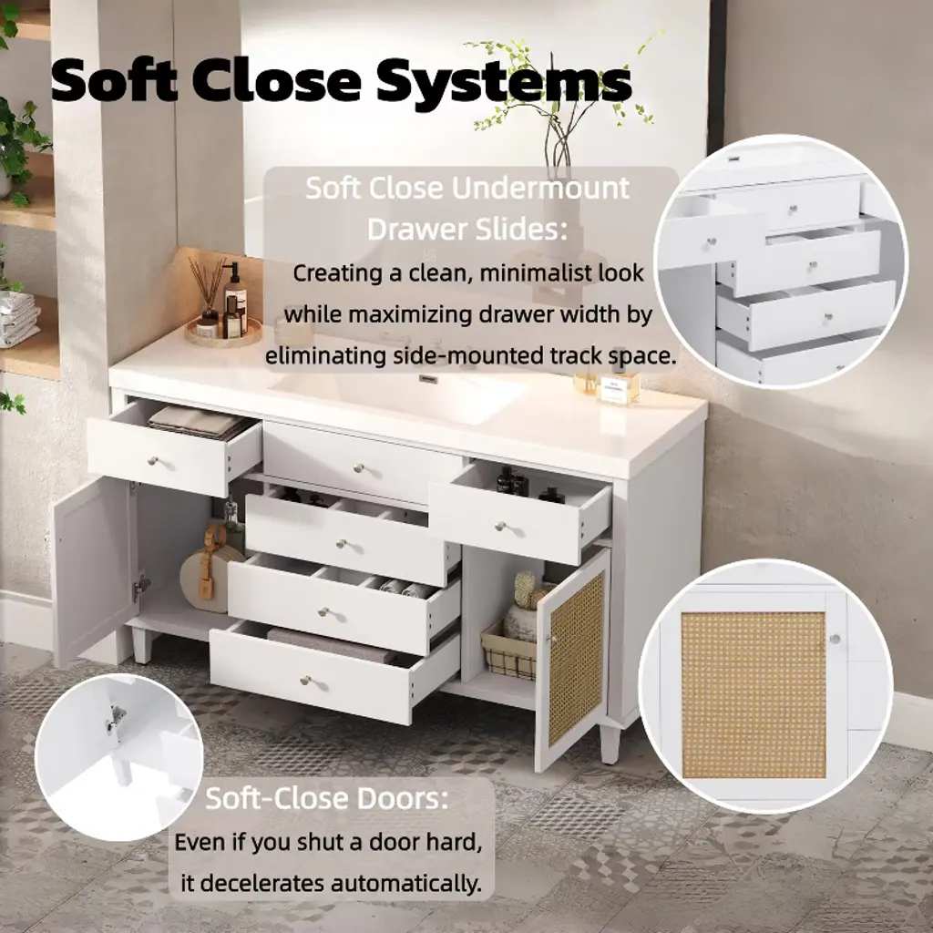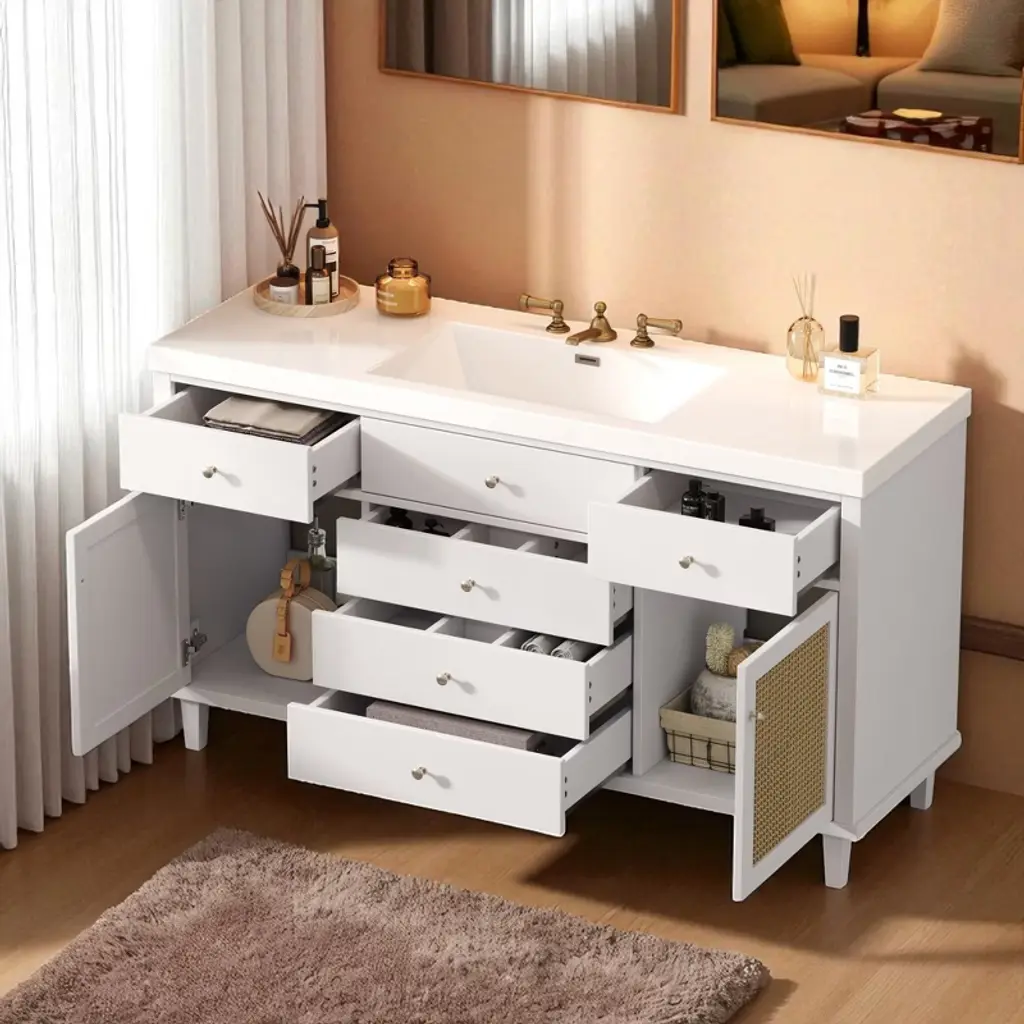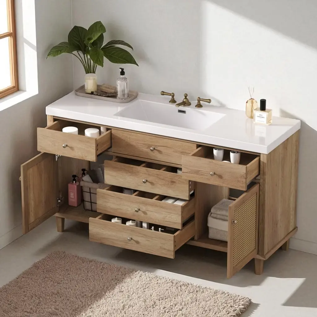 Product Overview This 60-inch bathroom vanity combines modern functionality with a touch of natural elegance. Featuring a full-width SMC sink, rattan cabinet doors, and multiple soft-close drawers, it provides ample storage for daily essentials while enhancing your bathroom with a sleek and sophisticated design. The freestanding construction with pine legs ensures durability and stability, making it a practical and stylish addition to any bathroom. Specifications Product Type: Bathroom Vanity Main Material: Solid Wood + MDF Assembled: Unassembled Assembly Required: Yes Faucet Hole Spacing: 8 in Faucet Included: No Hardware Finish Family: Silver Included: Drawers Mirror Included: No Number of Sinks: Single Sink Sink Location: Center Sink Shape: Rectangular Sink Type: Undermount Sink Material: SMC Vanity Features: Adjustable Hinges, Fully Extendable Drawers, Soft Close Doors, Soft Close Drawers, Rattan Doors, Pine Legs Vanity Type: Freestanding Product Features Spacious Modern Design: Expansive 60-inch countertop with a full-width sink provides plenty of room for daily grooming and essentials. Durable SMC Sink: Resistant to scratches and stains, the SMC sink ensures long-lasting performance in humid bathroom environments. Smart Storage Solutions: Includes 5 soft-close drawers in various sizes and 2 rattan-front cabinets for flexible organization. Premium Soft-Close Mechanism: High-quality glides ensure quiet drawer operation, protecting the cabinet structure. Sturdy & Elevated Base: Supported by 5 pine legs, including a central leg for reinforcement, ensuring durability and easy floor cleaning. Product Dimensions Overall Size: 60"L × 20"W × 34.07"H Separate SMC Sink: 60"L × 20"W × 5.25"D Cabinet Size: 60"L × 20"W × 32.07"H 2 Upper Drawers: 15.2"L × 14.2"W × 3.25"H 2 Middle Upper Drawers (Side Part): 15.2"L × 8.6"W × 3.25"H 2 Middle Upper Drawers (Middle Part): 6.7"L × 3.66"W × 3.25"H 1 Middle Bottom Drawer: 22.04"L × 15.2"W × 3.25"H Suitable Scenarios Perfect for master bathrooms, guest suites, or apartment spaces. Ideal for homeowners seeking a blend of modern design, durable performance, and abundant storage. The natural rattan details add warmth, making it a stylish focal point in contemporary, boho, or transitional bathrooms. Notes 1. Real product color may slightly differ due to lighting or monitor settings. 2. Manual measurement has been used; slight dimensional variations may occur. Care & Maintenance Guide Wipe up water, steam, or spills immediately to prevent warping or staining. Ensure proper bathroom ventilation to minimize humidity exposure. Quickly wipe surfaces with a dry cloth after use to maintain a pristine finish.