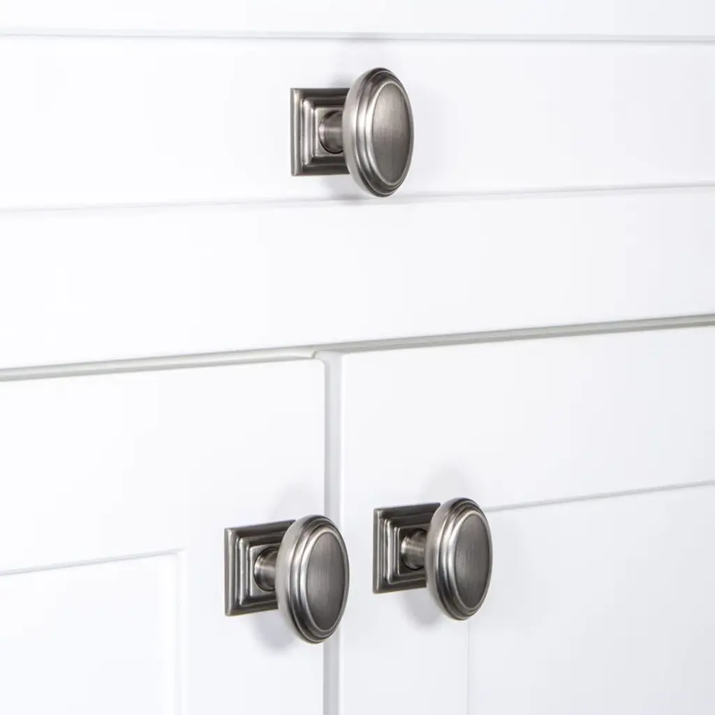 The Anneau Cabinet Knob has a traditional oval shape but with a unique twist—a pair of concentric rings precisely carved into its outer edge. With its stepped edges and square shape, the Carré Square Cabinet Knob and matching rosette add a touch of sophistication to any cabinet.