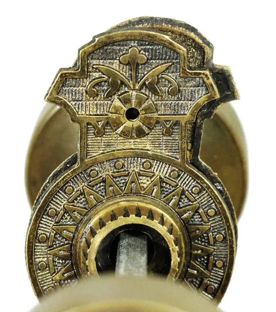 This four fold door knob set was made by Reading in the 1881 catalog. Vernacular style. Part of the H-2320 group. Original mounting screws are not included. Good condition with appropriate wear from age. Priced as two door knobs, two back plates, and a spindle. Priced per set. patinas may vary. The dimensions are Knob 2.25 in. diameter x 2.25 in. D, plate 6 in. H x 2.125 in. W x 0.375 in. D, collar 0.625 in. diameter, drop 2.25 in.