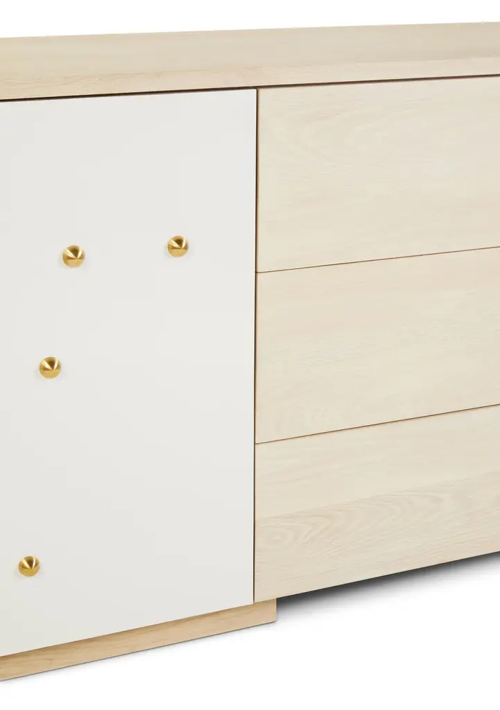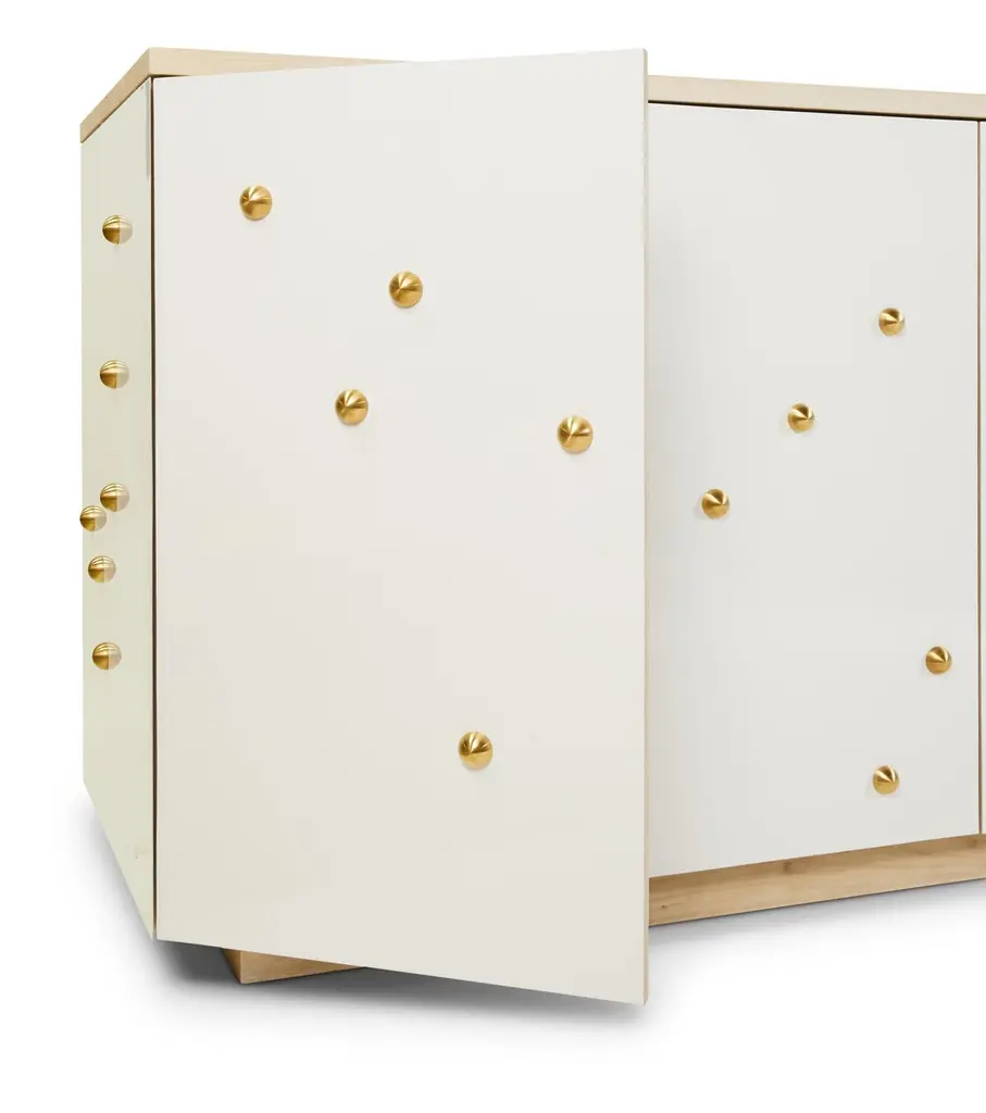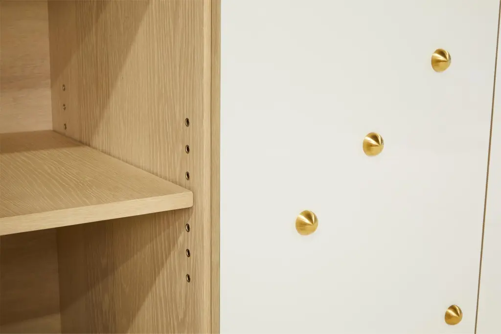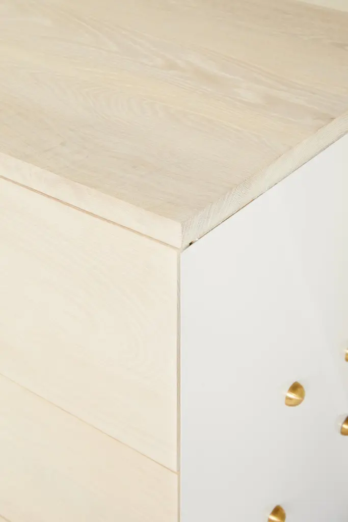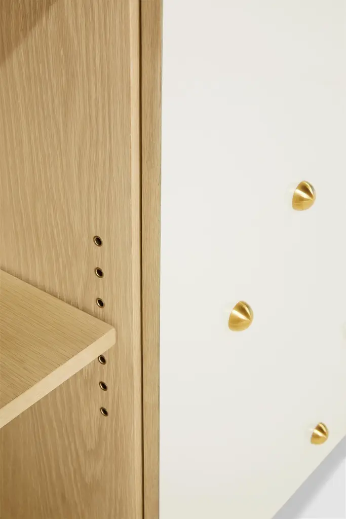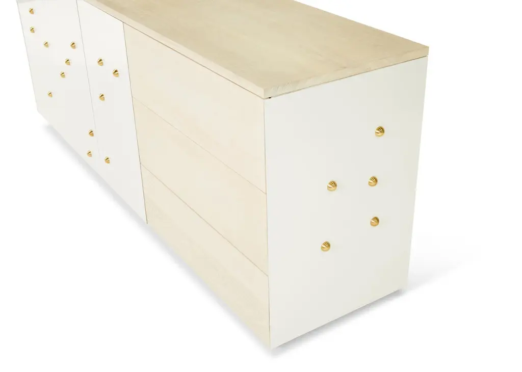 C-210WB is a variation on the studio's popular C-210 model. The counter-top, drawers and interior are made from white oak with a bleached and white stained oil finish. The remainder of the piece is clad in powder-coated white aluminum and features machined brass protrusions/knobs. The cabinet door hardware is Blum tip-on and the drawers are Blumotion Movento slides with soft-close action. The piece rests on a white oak weighted base that provides for the cantilever.This is a bespoke piece so custom dimensions, materials, colors and finishes can be accommodated. All Stefan Rurak studio pieces are designed and handcrafted in Brooklyn, New York.