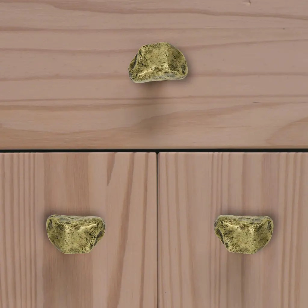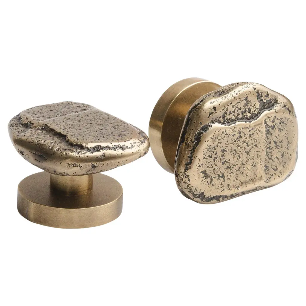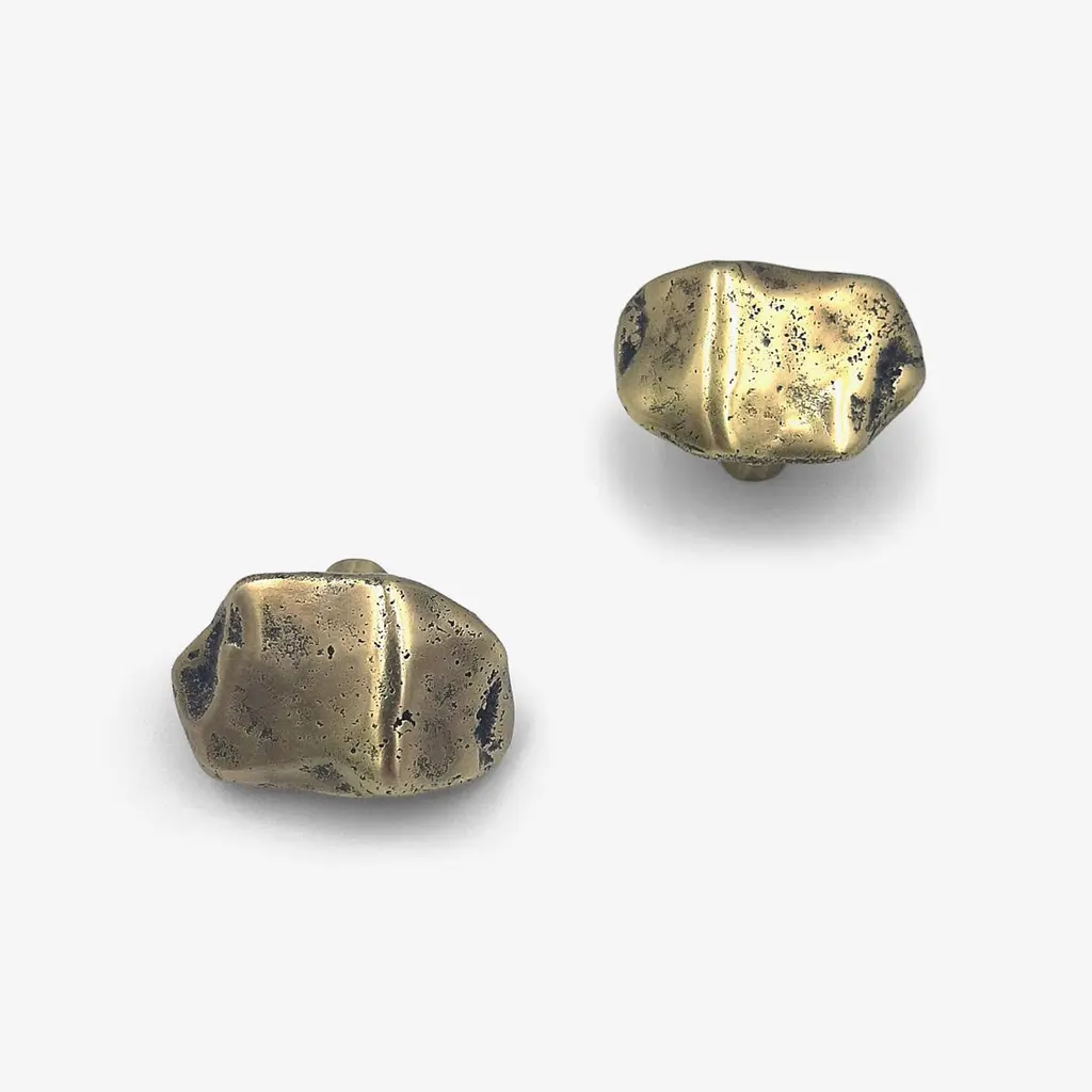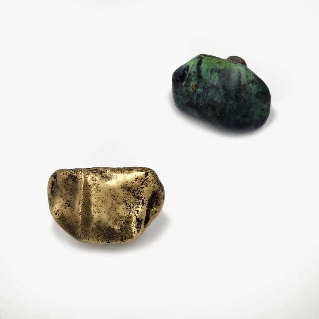 Part of the Earth Prints collection, this cabinet knob in solid brass is inspired by mineral forms and natural textures. Crafted using traditional sand casting techniques, it features an irregular, pebble-like silhouette with softened contours. The gently convex surface retains traces of the manual process—subtle indentations, asymmetries, and non-geometric edges.With its compact 5 x 3 cm size, this cabinet knob is suited for drawers, cabinet doors, or built-in furniture. It is available in three patinated finishes: aged gold, bronze, or green verdigris. Each finish reveals shifting tones that enhance the material’s relief and texture.Mounted with a through-bolt system, the piece ensures solid, long-term installation. The untreated brass is intended to evolve over time, gradually developing a natural patina that gives each knob its own distinctive character.note: Differences from the sample/photo provided should not be considered manufacturing defects, but rather a characteristic of the manual process, which may result in variations in color and uniformity.Brass is a living material that gradually develops a patina over the years.