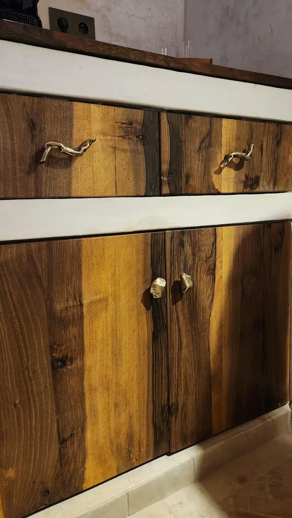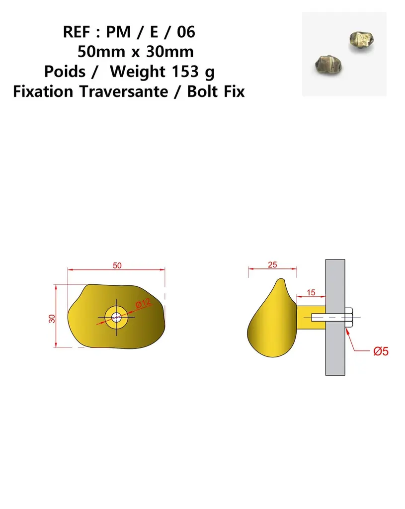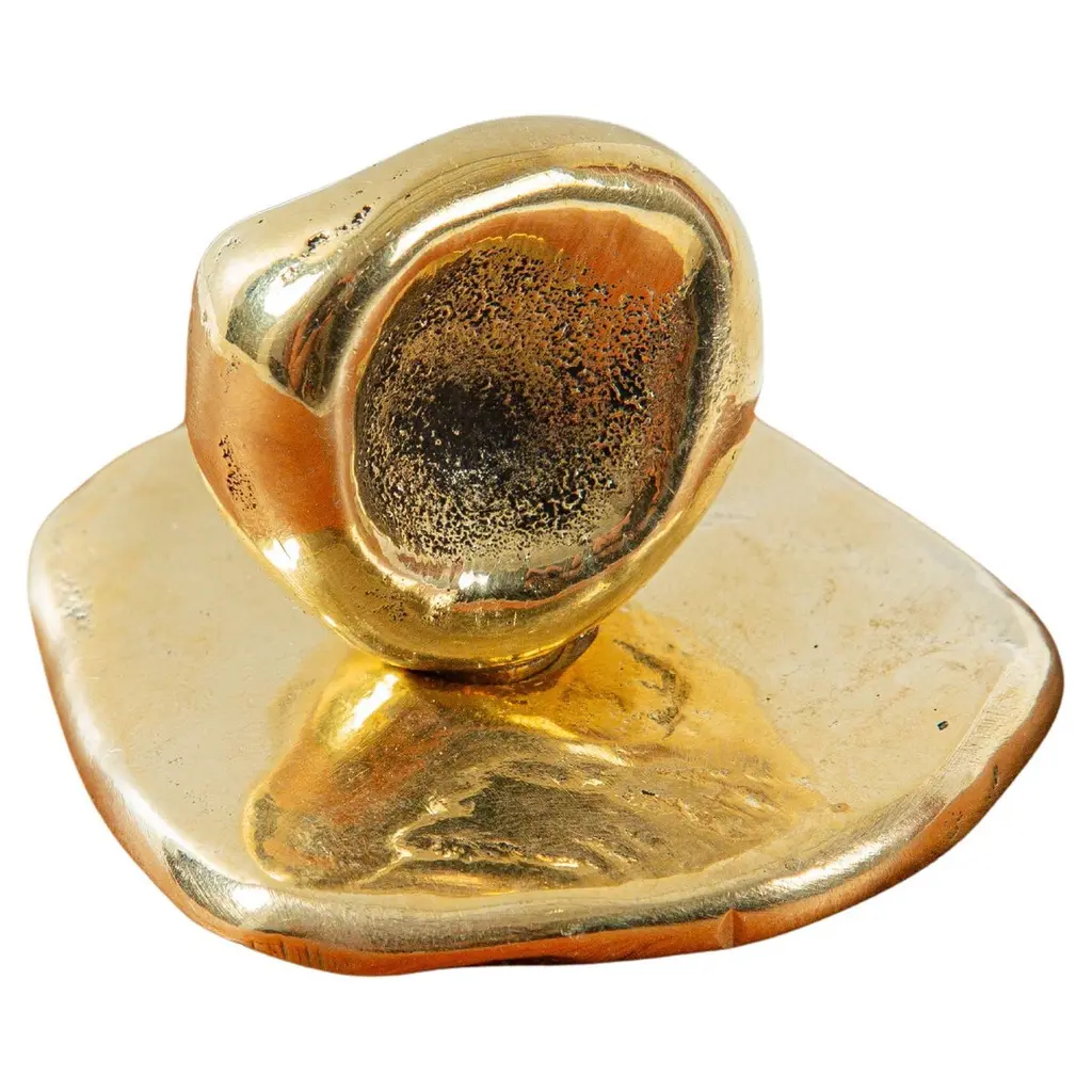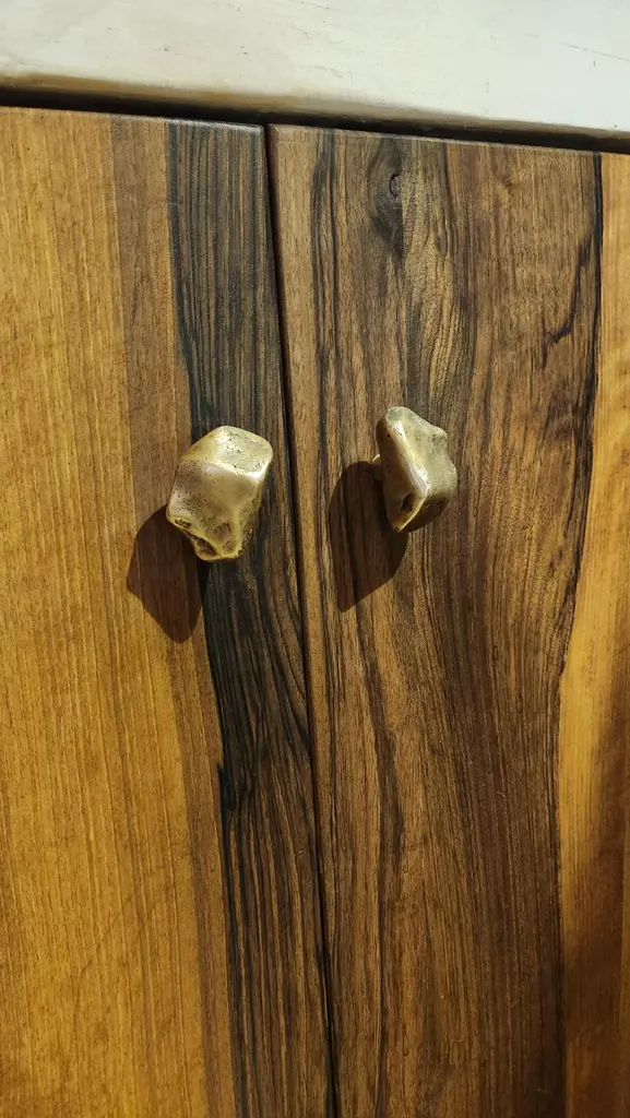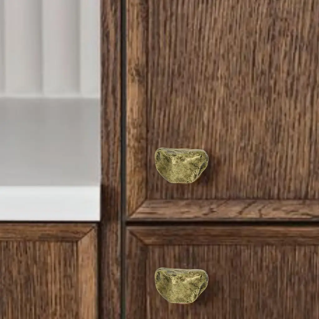 Part of the Earth Prints collection, this cabinet knob in solid brass is inspired by mineral forms and natural textures. Crafted using traditional sand casting techniques, it features an irregular, pebble-like silhouette with softened contours. The gently convex surface retains traces of the manual process—subtle indentations, asymmetries, and non-geometric edges.With its compact 5 x 3 cm size, this cabinet knob is suited for drawers, cabinet doors, or built-in furniture. It is available in three patinated finishes: aged gold, bronze, or green verdigris. Each finish reveals shifting tones that enhance the material’s relief and texture.Mounted with a through-bolt system, the piece ensures solid, long-term installation. The untreated brass is intended to evolve over time, gradually developing a natural patina that gives each knob its own distinctive character.note: Differences from the sample/photo provided should not be considered manufacturing defects, but rather a characteristic of the manual process, which may result in variations in color and uniformity.Brass is a living material that gradually develops a patina over the years.