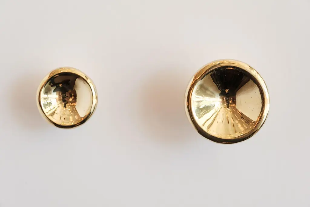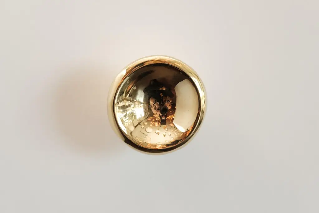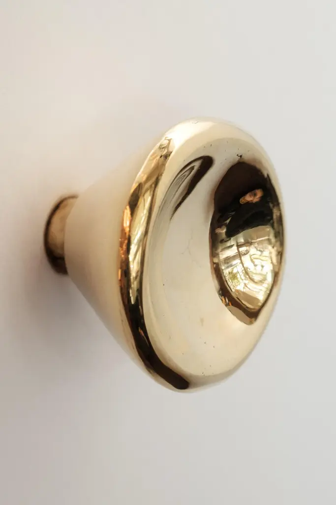 Carl Auböck Model #8040-1 polished brass knob.Designed in the 1950s, this versatile and Minimalist Viennese knob is executed in polished brass by Werkstätte Carl Auböck, Austria. Its minimalist design combines clean form with functionality.Produced by Carl Auböck IV in the original Auböck workshop in the 7th district of Vienna using the same exacting standards, high-quality materials, original molds and techniques of his legendary namesake. Auböck's design career was long and varied, reaching its pinnacle of prestige at the Triennale di Milano in 1954, where he received four gold medals in recognition of his iconic work.Price is per item. Available in unlimited quantities in choice of polished brass, patinated brass, or nickel. Also available in a larger size. This listing is for the small sized knob in polished brass.1 in stock and ready to ship. Out of stock lead time 2-3 weeks or more. Inventory availability is subject to change at any time without notice.Please note that only one representative example of each item is shown in the images. Finish varies from item to item due to the handmade nature of their fabrication.Made to order. All sales are final.