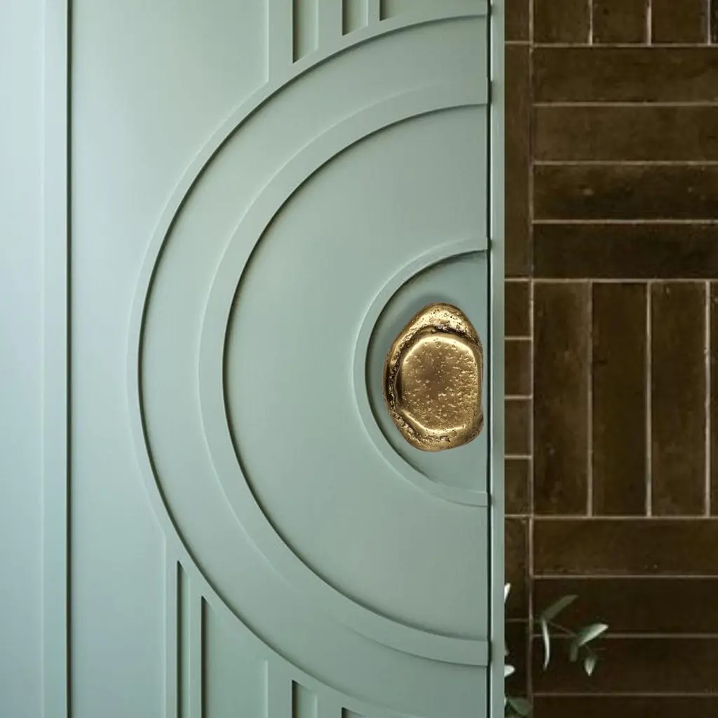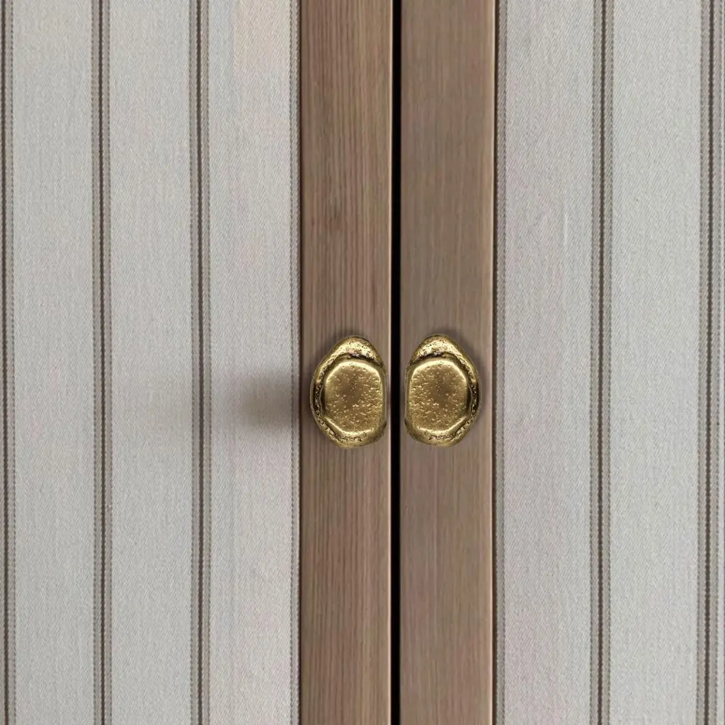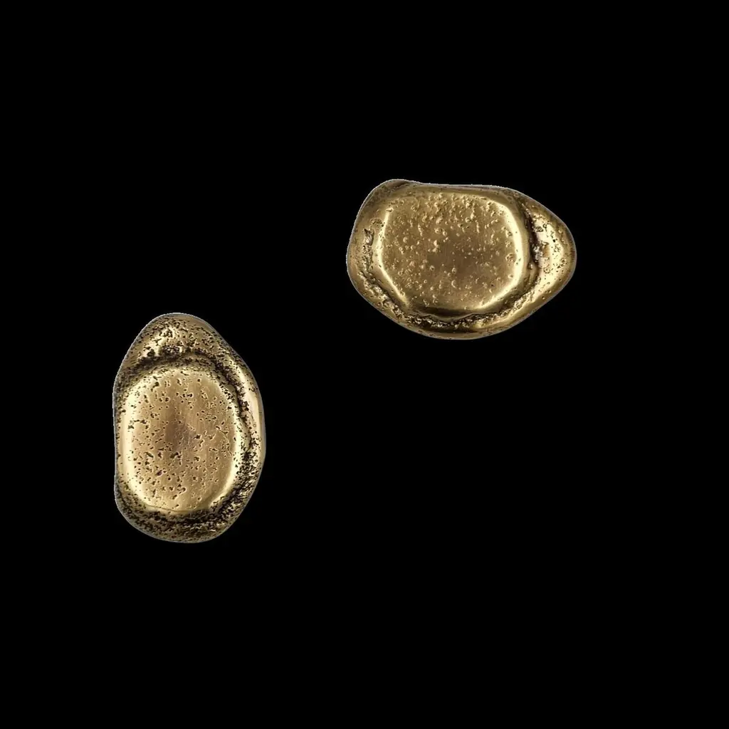 This cabinet knob in solid brass is part of the Earth Prints collection. Its freeform outline evokes the natural shape of a weathered stone.Each piece is cast using traditional foundry techniques and finished by hand. The brass is manually patinated to reveal irregular textures, unique to each handle.Three finishes are available: aged gold, bronze, or green grey patina. Each option highlights the surface details and the contrast within the metal.This cabinet knob features a through-mount system, ensuring long-lasting and secure attachment to doors or drawers.With dimensions of 5.5 x 4 cm, this cabinet handle is suitable for various furniture types. Compact and tactile, it brings out the material’s character through careful craftsmanship.note: Differences from the sample/photo provided should not be considered manufacturing defects, but rather a characteristic of the manual process, which may result in variations in color and uniformity.When placed outdoors, finishes may undergo color changes, which should not be considered a defect. Brass is a living material that gradually develops a patina over the years.
