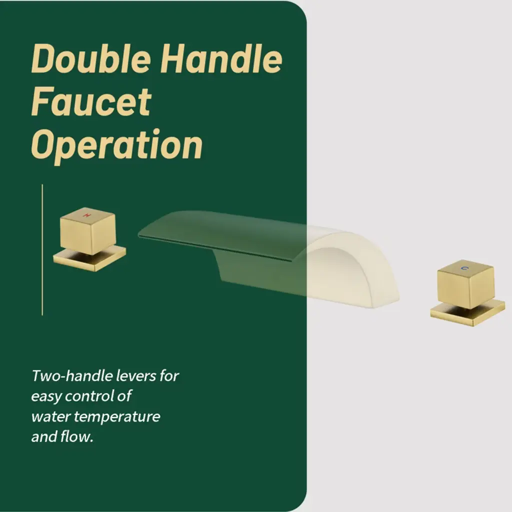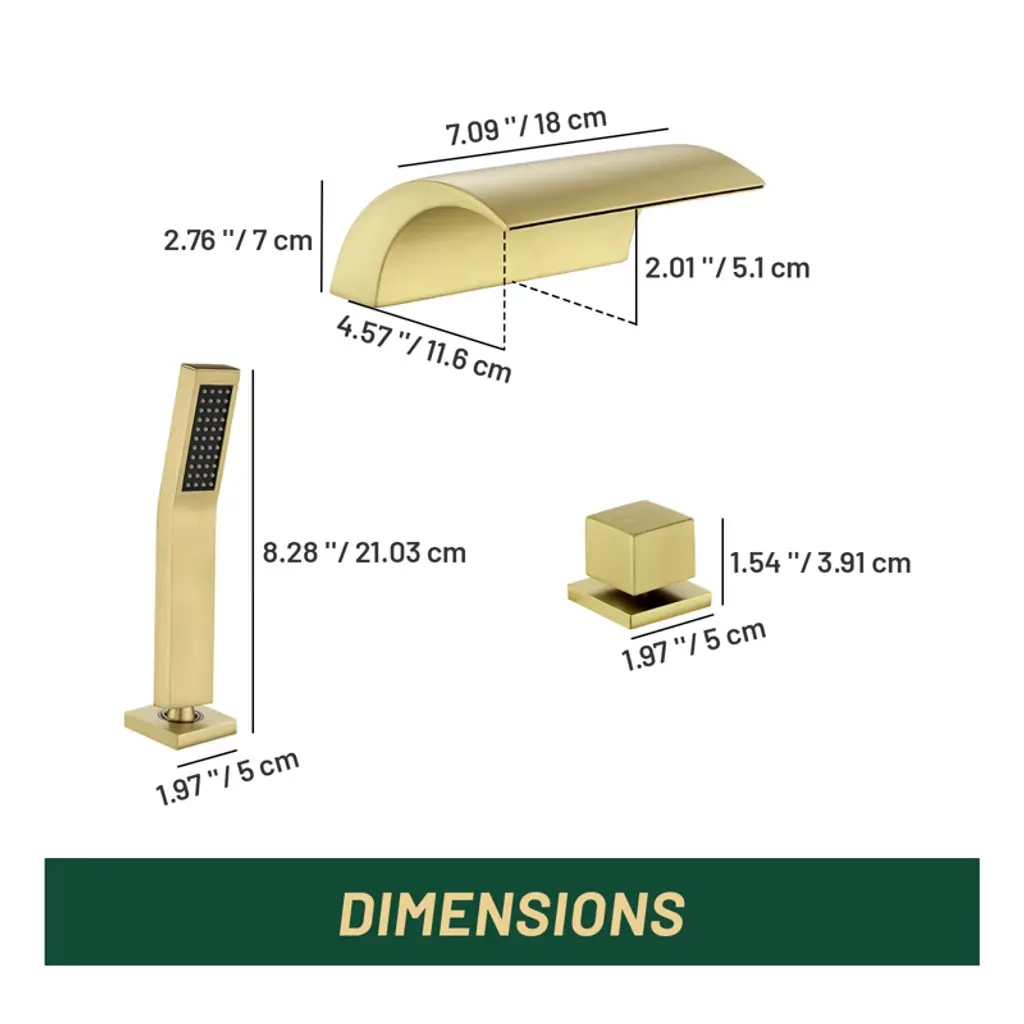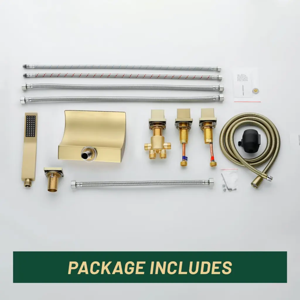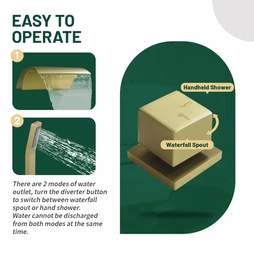 Cobbe 5-hole Installation Tub Faucet Kit With 7.09-inch Wide Waterfall Spout, Hand Shower, 2 Switches And 1 Diverter Knob Brushed Gold