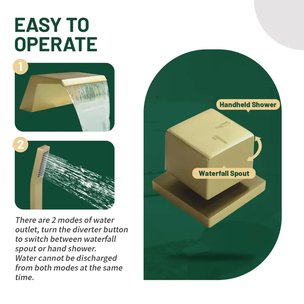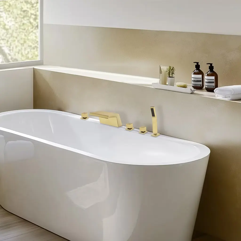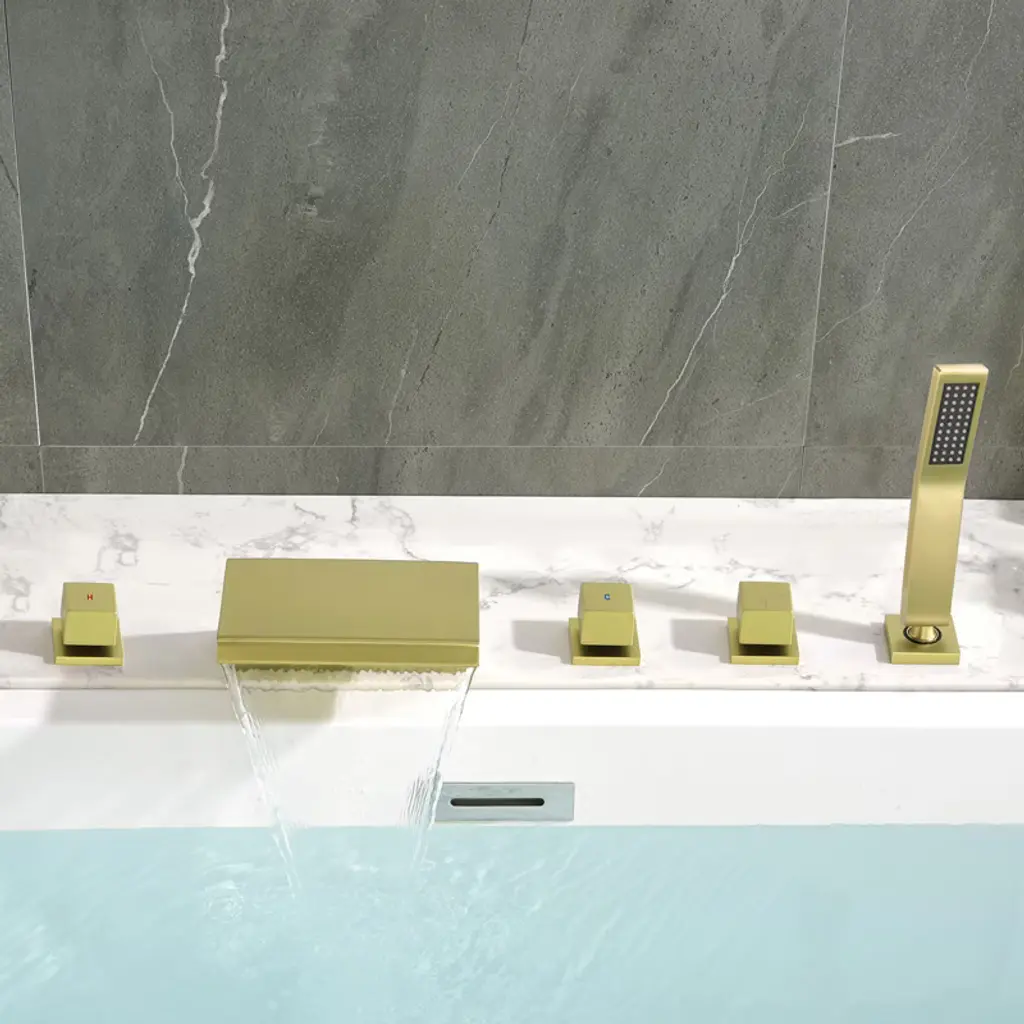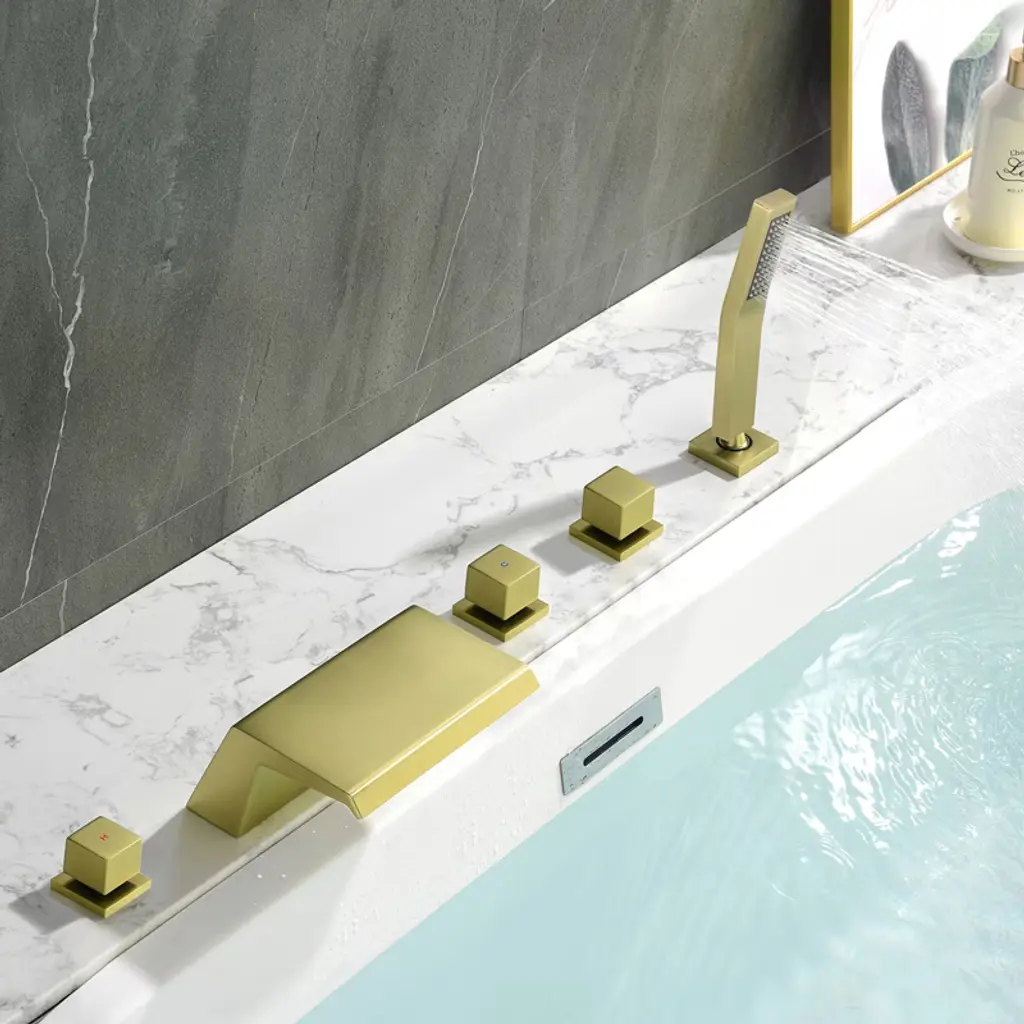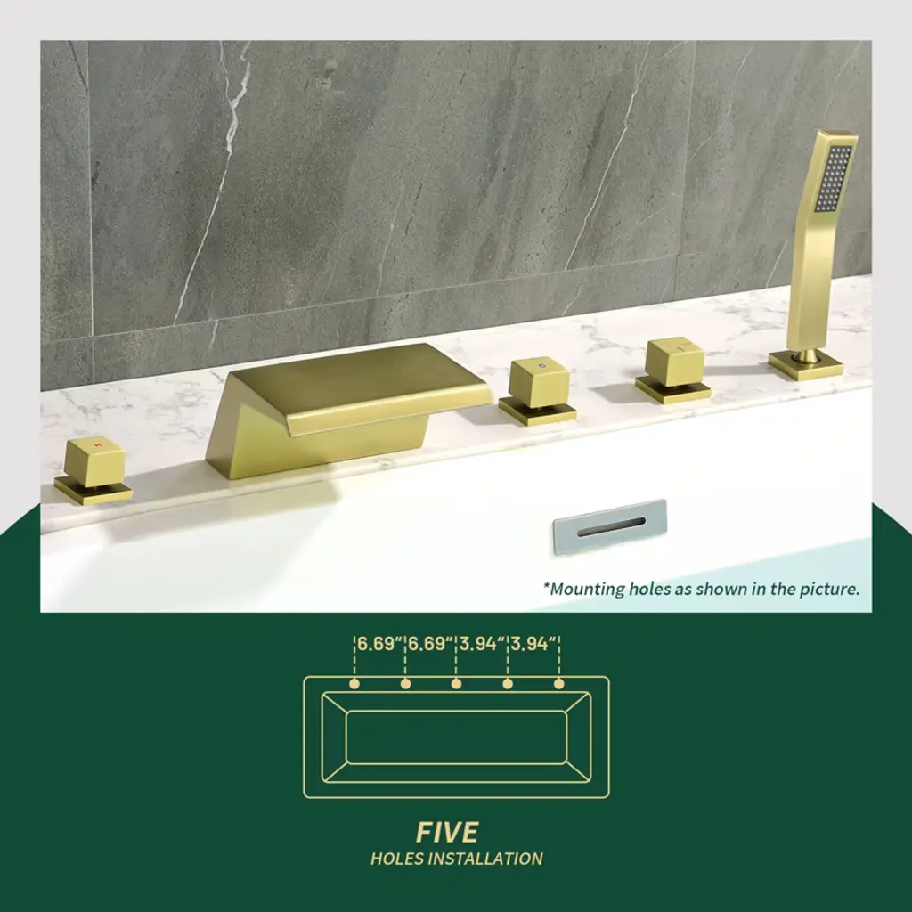 Cobbe Brushed Gold 5-hole Bathtub Faucet Kit With Hot Water Switch, 7.09-inch Wide Tub Spout, Cold Water Switch, Diverter Knob Hand Shower
