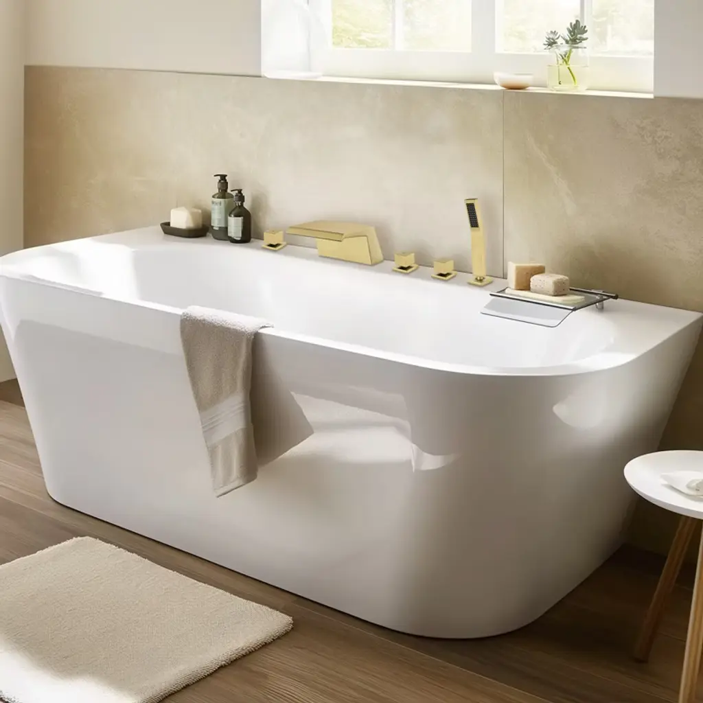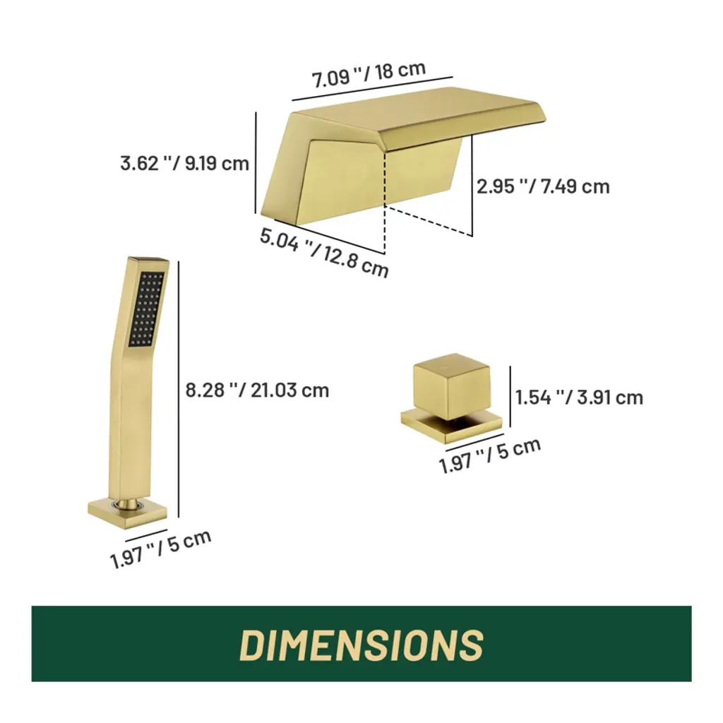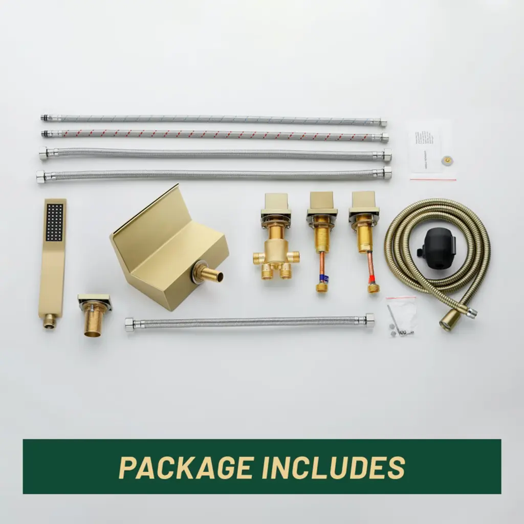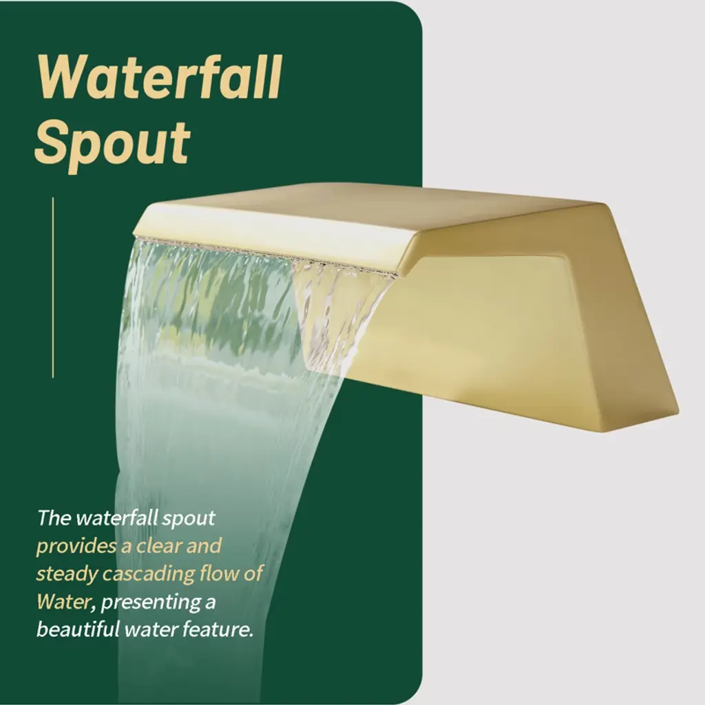 This bathtub faucet is mainly made of copper and SUS304 stainless steel, which has good corrosion resistance and durability, and can prolong the service life of the product.At the same time, the product presents a simple and fashionable design style, its classic shape design makes it able to adapt to most of the bathroom space with a bathtub, smooth lines and common bathroom fixtures and decorative styles complement each other.While ensuring practical functionality, this combination of materials enhances durability and extends product life while adding a touch of elegance to the bathroom space, making it ideal for both value and function. The bathtub shower faucet comes with includes 2 switches and 1 diverter knob, 7.09-inch wide waterfall bathtub spout, hand shower and 6 hoses.The bathtub spout is designed with dual handles, you can easily adjust the hot and cold temperature and water flow, easy to operate, not only provide you with a stable water flow experience, but also practical functions and comfort, can meet a variety of bathing needs. The hand shower is equipped with a 59-inch hose with a gravity ball, which extends the shower's range of motion.At the same time, when the shower is finished, the gravity ball guides the hose to retract and return to its place in an orderly fashion, keeping your bathroom neat and tidy, and providing you with a convenient and efficient experience. The product is also equipped with a diverter knob, which can be switched between the bathtub faucet and the hand shower with a simple turn.Whether you are immersed in the gentle embrace of the bathtub, or enjoy the hand shower to bring the smooth and easy to realize, for you to create an efficient and comfortable bathing environment, so that the body and mind in the water under the caress of the ultimate relaxation. This product adopts 5-hole installation method, reasonable layout is convenient for daily shower use. We have a professional after-sales team ready to support you with a two-year warranty to ensure your peace of mind.