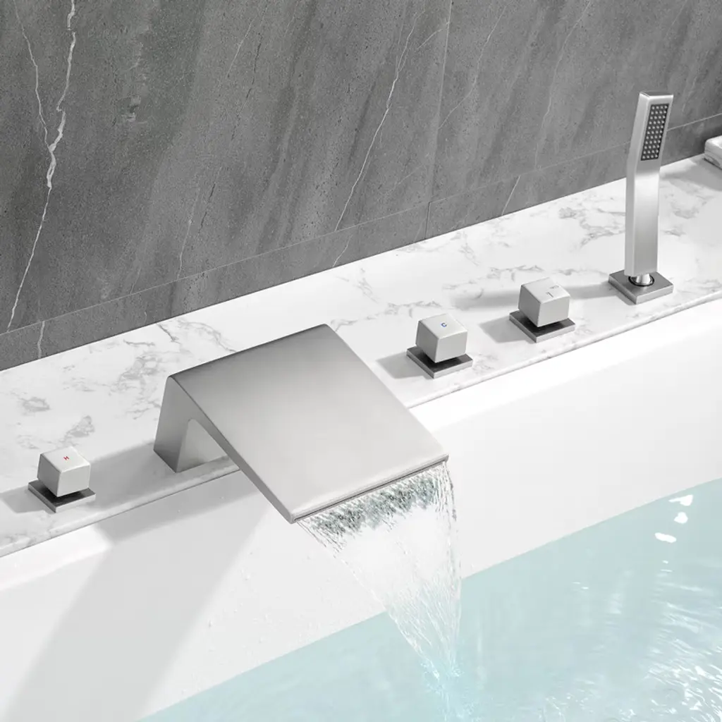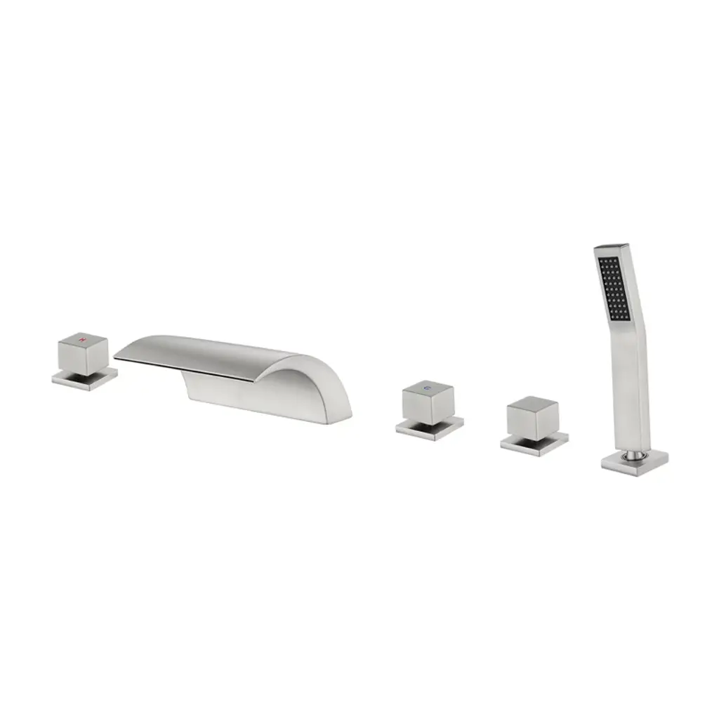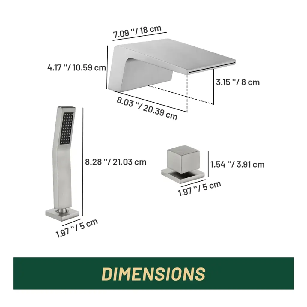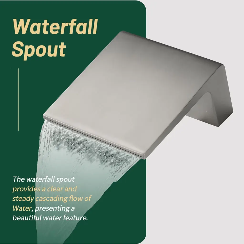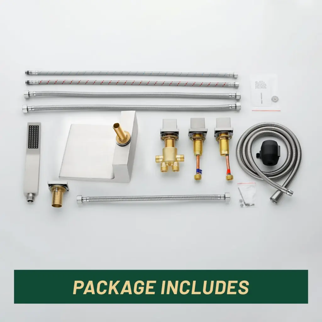 This bathtub faucet is mainly made of copper and SUS304 stainless steel, which has good corrosion resistance and durability, and can prolong the service life of the product.At the same time, the product presents a simple and fashionable design style, its classic shape design makes it able to adapt to most of the bathroom space with a bathtub, smooth lines and common bathroom equipment and decorative styles complement each other.While ensuring practical functionality, this combination of materials enhances durability and extends product life while adding a touch of elegance to the bathroom space, making it ideal for both value and function. The bathtub shower faucet comes with includes 2 switches and 1 diverter knob, 7.09-inch wide waterfall bathtub spout, hand shower and 6 hoses.The bathtub spout is designed with dual handles, you can easily adjust the hot and cold temperature and water flow, easy to operate, not only provide you with a stable water flow experience, but also practical functions and comfort, can meet a variety of bathing needs. The hand shower is equipped with a 59-inch hose with gravity ball, and the longer length of the hose effectively extends the shower's range of motion.At the same time, when the shower is finished, the gravity ball uses its own gravity to guide the hose to automatically retract and return to its place in an orderly fashion, keeping your bathroom clean and beautiful, and providing you with a convenient and efficient experience. The product is also equipped with a diverter knob, which can be switched between the bathtub faucet and the hand shower with a simple turn.Whether you are immersed in the gentle embrace of the bathtub or enjoying the pleasure of the hand shower, it is easy to realize, creating a highly efficient and comfortable bathing environment for you, and letting your body and mind get the ultimate relaxation under the caress of the water. This product adopts 5-hole installation method, reasonable layout is convenient for daily shower use. We have a professional after-sales team ready to support you with a two-year warranty to ensure your peace of mind.