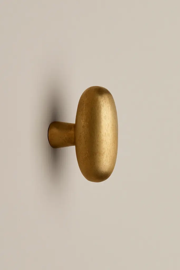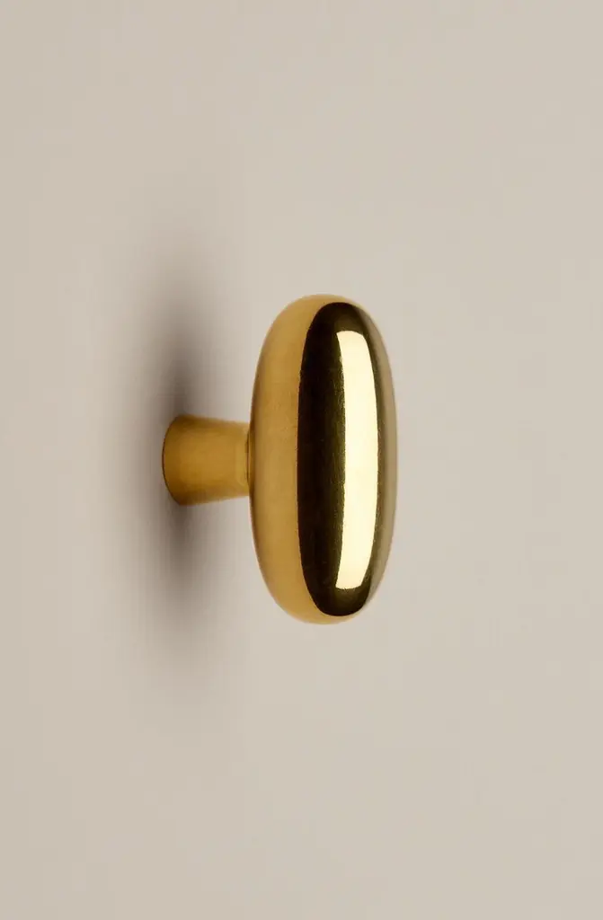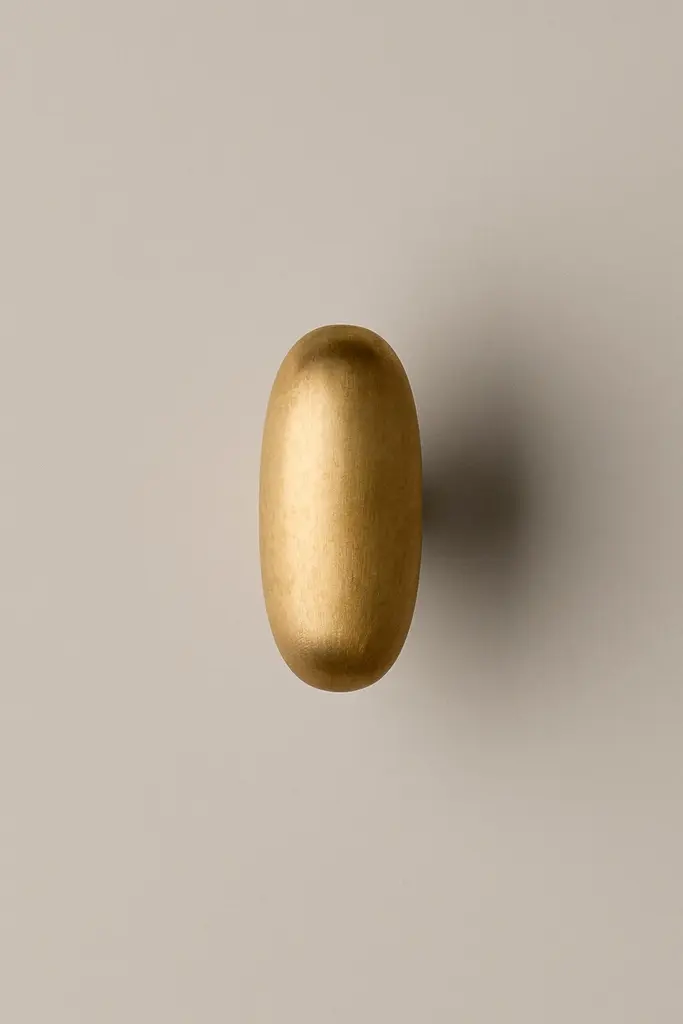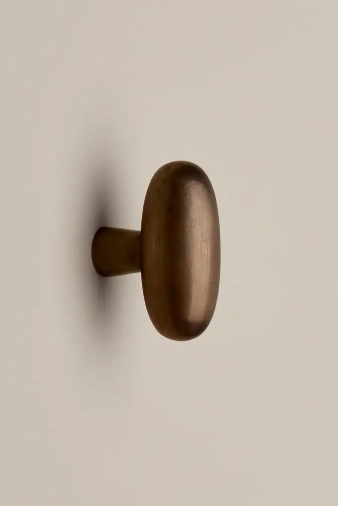 Door Handle / Knob 'Blunt' by Spaces Within, Dark BrassDimensions mm: 40 x 20 x 32Weight: 98 gA harmoniously balanced oval, BLUNT is pure, essential and confident. A classical yet refined knob with a sense of ease that will suit many spaces. The matte finish has a natural looking aged appearance in a warm amber tone. Beautiful placed vertically on cabinets and horizontally on drawers. Works perfectly as a pair of two on long drawers.The products may show small variations and imperfections due to the artisanal processing technique involved in making each of our pieces.Brass and Nickel finishes are intentionally natural and are therefore subject to a slight variation and opacification which gives them the beauty and patina of time.Only a moist fabric has to be used to clean the brass parts.Spaces Within JEWELRY FOR SPACESSPACES WITHIN is a Stockholm-based label, crafting sculptural cabinet hardware with sensual forms, textural finishes and unique proportions. The pieces we make explore themes of refinement, elegance and poetic expressions. Each SPACES WITHIN piece bears an aesthetic identity of its own, that can be used singularly or as part of a combination of hardware within a space. The collection as a whole allows for playful parings and rich combinations of materials and finishes, jewelry for spaces in every sense.We make our collection from solid brass, in a second-generation foundry in Florence that shares our passion for quality. Working closely with its artisans, each piece is developed slowly and with great care and love. Our intention is that this collective method of crafting leads to an energy and soul within each piece that you can sense with every touch.This is a label founded on the belief that beauty is a function in its own right – a healing frequency. And that visual poetry in functional objects draws you closer to your surroundings. The late Frank Lloyd Wright said 'Space is the breath of art.' What we do is sculpt the whispers within.- Nadja & Karin