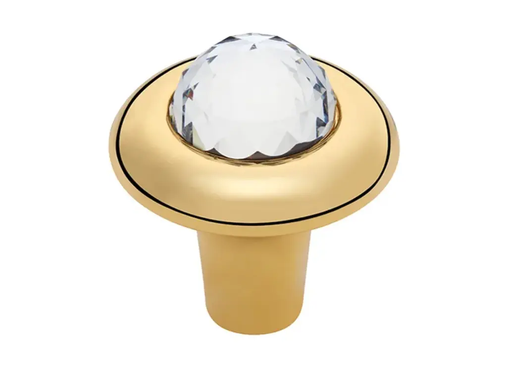 Elika Crystal is a circular brass furniture knob with insert.Available in different finishes:CR - Polished chromeCS - Satin chromeOZ - Gold platedVE - Matt blackElusive lines give an unexpected dynamic to the formal shapes, made even more surprising by the light released by the Swarovski elements crystal.