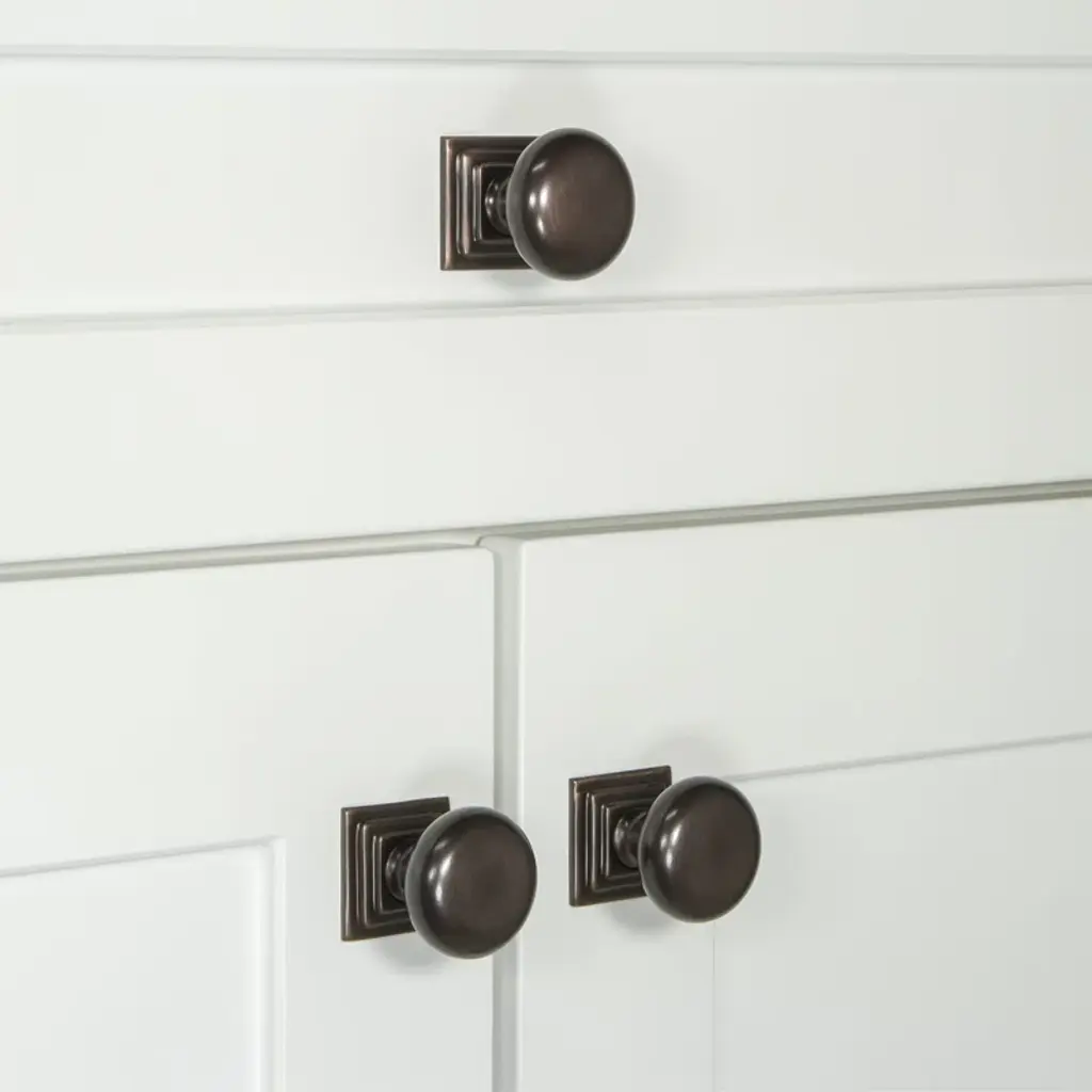 Upgrade your cabinetry with the timeless and versatile Fifth Avenue Cabinet Knob and elegant Carré Square Rosette. This round knob juxtaposed with the angular rosette, adds a touch of sophistication to cabinets and furniture while providing practical functionality.