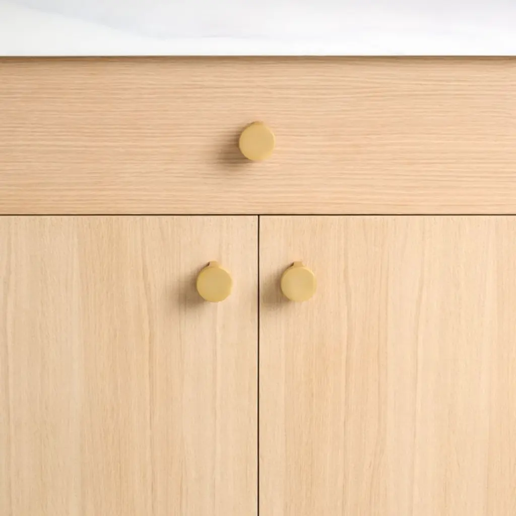 Sometimes it's the small things that pull a room together. That's why we've designed a hardware collection with modern silhouettes, clean lines and a touch of tradition to give your kitchen and bathroom that perfect finishing touch. This sculptural knob carves out a cylinder with flattened sides for a comfortable grip. Crafted of brass, the knob has a chic brushed finish. Hardware is included to make it easy to refresh the look of dresser drawers, cabinet doors and vanities.