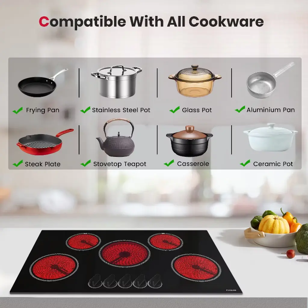 Enhance your cooking experience with GASLAND's ceramic cooktops. The GASLAND's CH90BS Ceramic Electric Cooktop is a 36-inch 5-burner, ETL Certified, built-in electric indoor cooktop intended for AC220-240V, and rated power of 1000-8200W for quick cooking. Total output of 8200W with 7 heat levels. Our traditional mechanical knob design combines classical style with stable and reliable performance, which is easier to use. The built-in design seamlessly blends into your kitchen, ensuring a modern and uncluttered space. Works with any cookware and boasts powerful coils for high-temperature heating, providing dynamic options for all your cooking needs.
