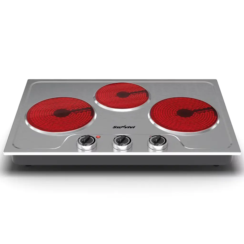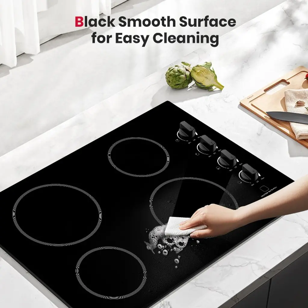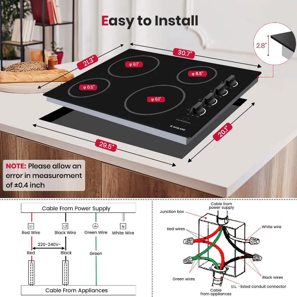 The GASLAND's Pro CH77BS Ceramic Electric Cooktop is a 30-inch 4-burner, ETL Certified, built-in electric indoor cooktop intended for AC220-240V, and rated power of 1000-7000W for quick cooking. All burners feature 7 heating level settings and knob controls for precise, easy temperature change at the rotating of a knob. Heating levels range from a light simmer to a rapid boil. Crafted with a durable microcrystalline surface and classic bakelite knob, our ceramic cooktop is engineered with heating coils to ensure even heat distribution, making it compatible with any flat-bottomed cookware. This model also has a smooth vitro ceramic glass surface for durable use and quick, easy cleaning.