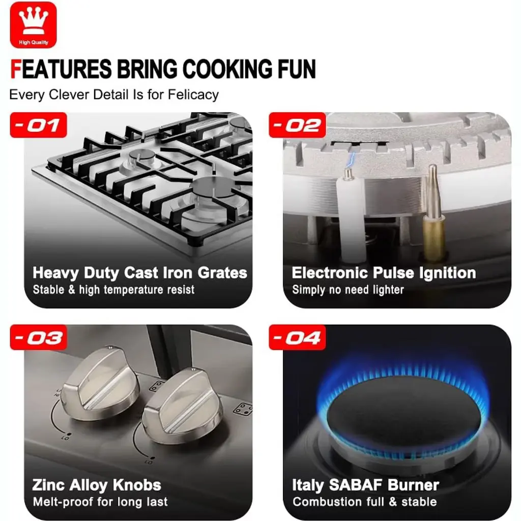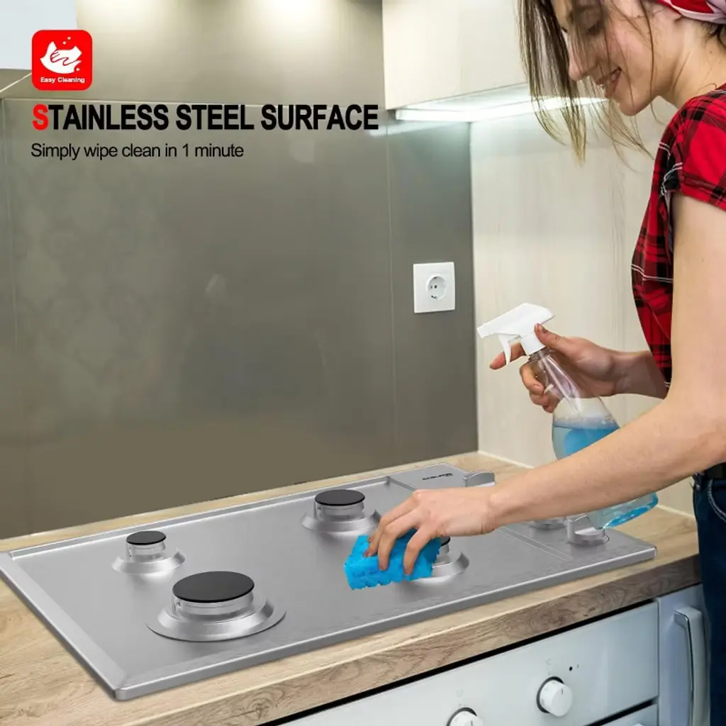 The GASLAND built-in gas cooker comes in a 30-inch width with a powerful 4,000 BTU auxiliary burner, double 7,000BTU semi-rapid burners and a 10,300 BTU triple ring burner. Easy to clean, sealed burners reduce cleanup by preventing food from falling into the burners. Stain and heat discoloration resistant stainless-steel finish will provide you with a stovetop that is built to last. Metal construction knobs are mounted on the side of the cooktop for easy control of cooking temperature. Dishwasher-safe, durable knobs and laser-cut full-width edge-to-edge heavy-duty cast iron grates are dishwasher safe for effortless cleaning and maintenance with the quality material to enhance the premium look.