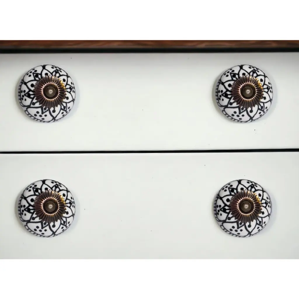 Give your drawers or cabinets a facelift with this set of eight black and white ceramic and metal drawer pull knobs. Improve the look of your old boring or builder grade furniture and cabinetry with these high quality round knob traditional style knobs. Hand-painted by talented artisans, these knobs will add a touch of artisanal design. 1.5-inch h x 1.5-inch w x 1.5-inch d.