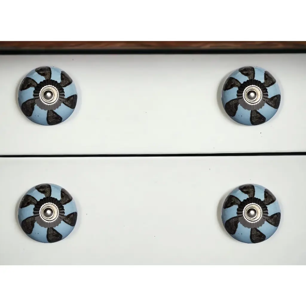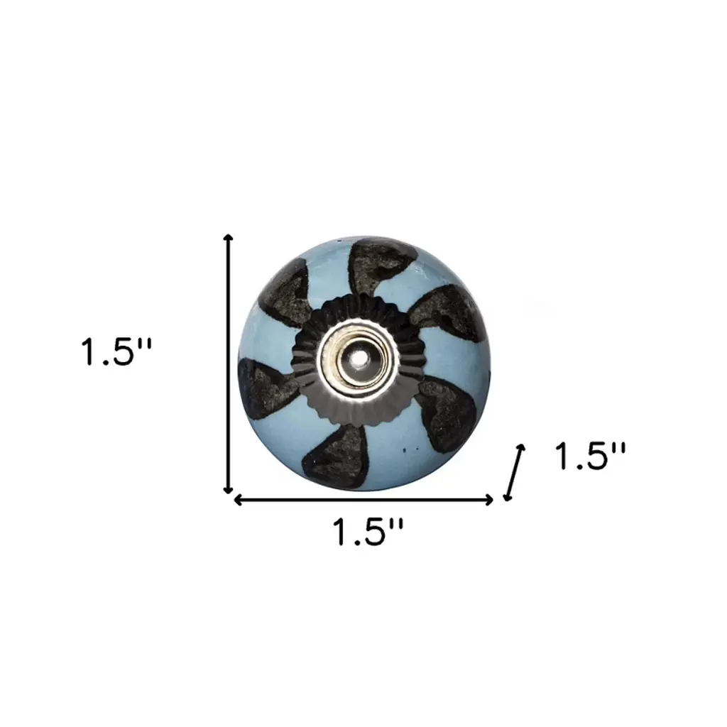 Give your drawers or cabinets a facelift with this set of eight blue and gray ceramic and metal drawer pull knobs. Improve the look of your old boring or builder grade furniture and cabinetry with these high quality round knob traditional style knobs. Hand-painted by talented artisans, these knobs will add a touch of artisanal design. 1.5-inch h x 1.5-inch w x 1.5-inch d.