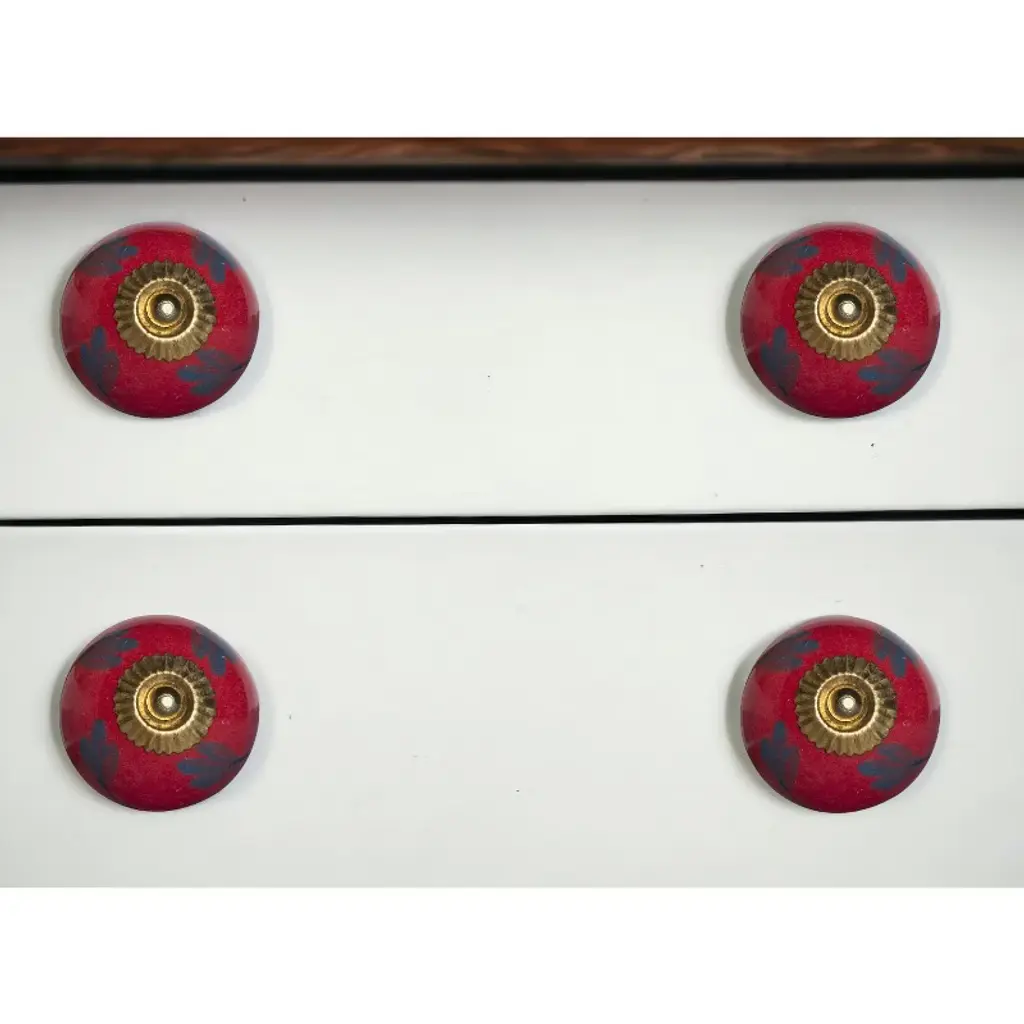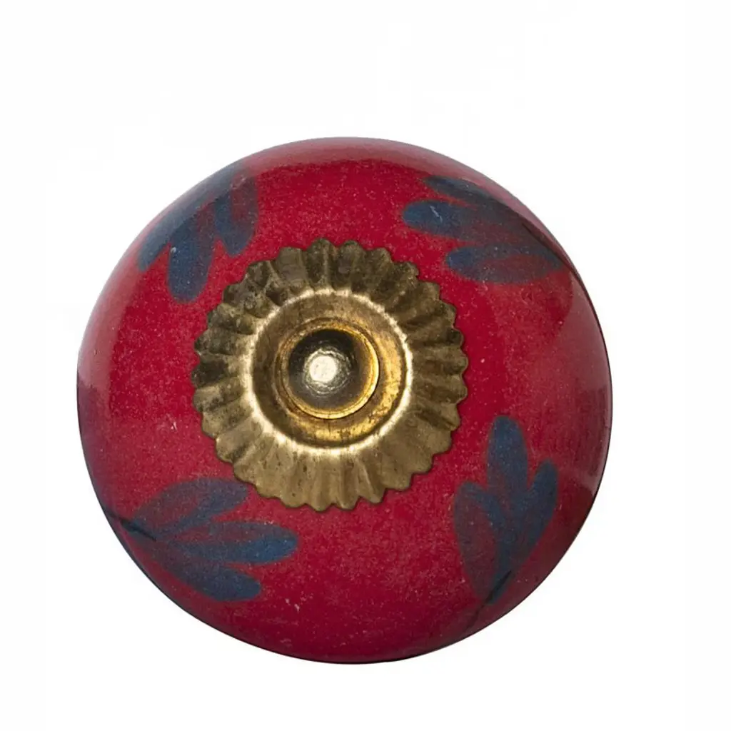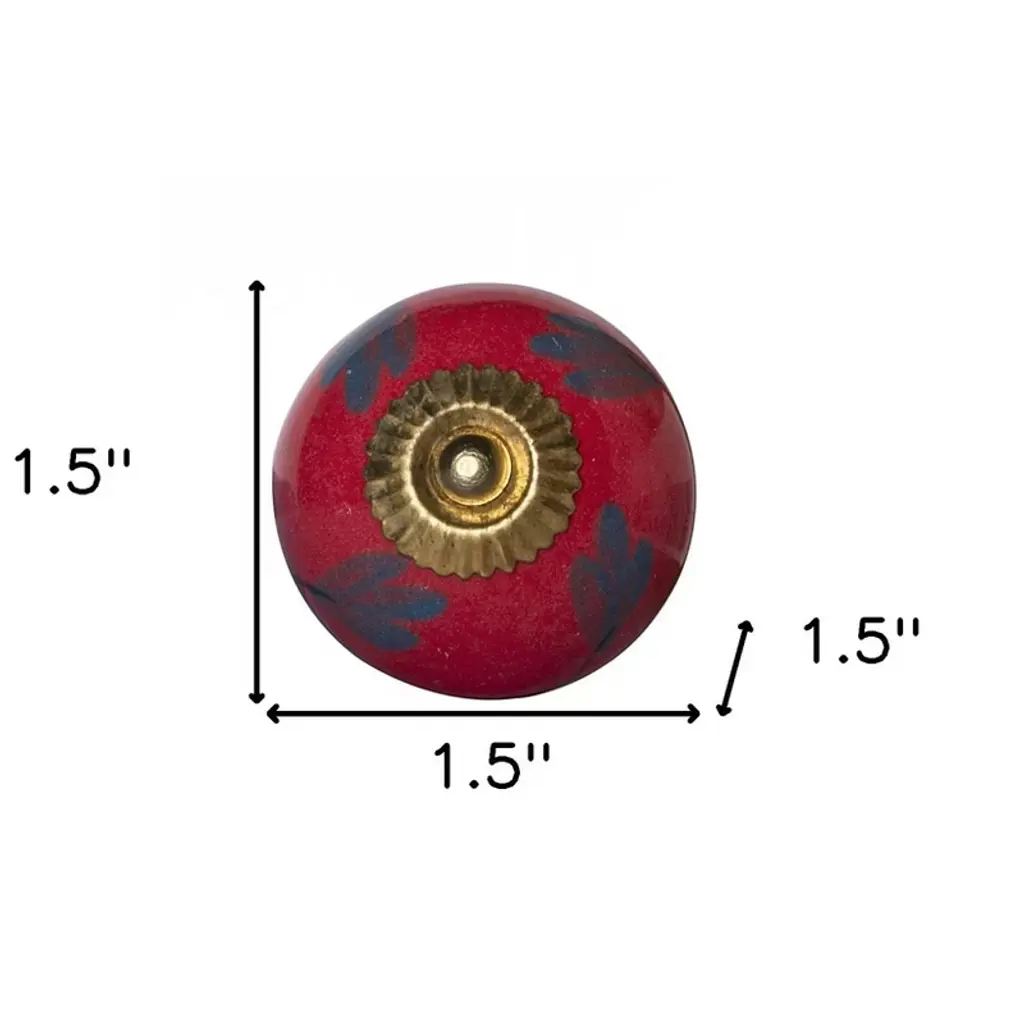 Give your drawers or cabinets a facelift with this set of eight blue and red ceramic and metal drawer pull knobs. A favorite of designers and diyer's alike, these high quality round knob traditional style knobs are versatile in use and will change up the look of your existing furniture and cabinetry in a snap. Hand-painted by talented artisans, these knobs will add a touch of artisanal design. 1.5-inch h x 1.5-inch w x 1.5-inch d.