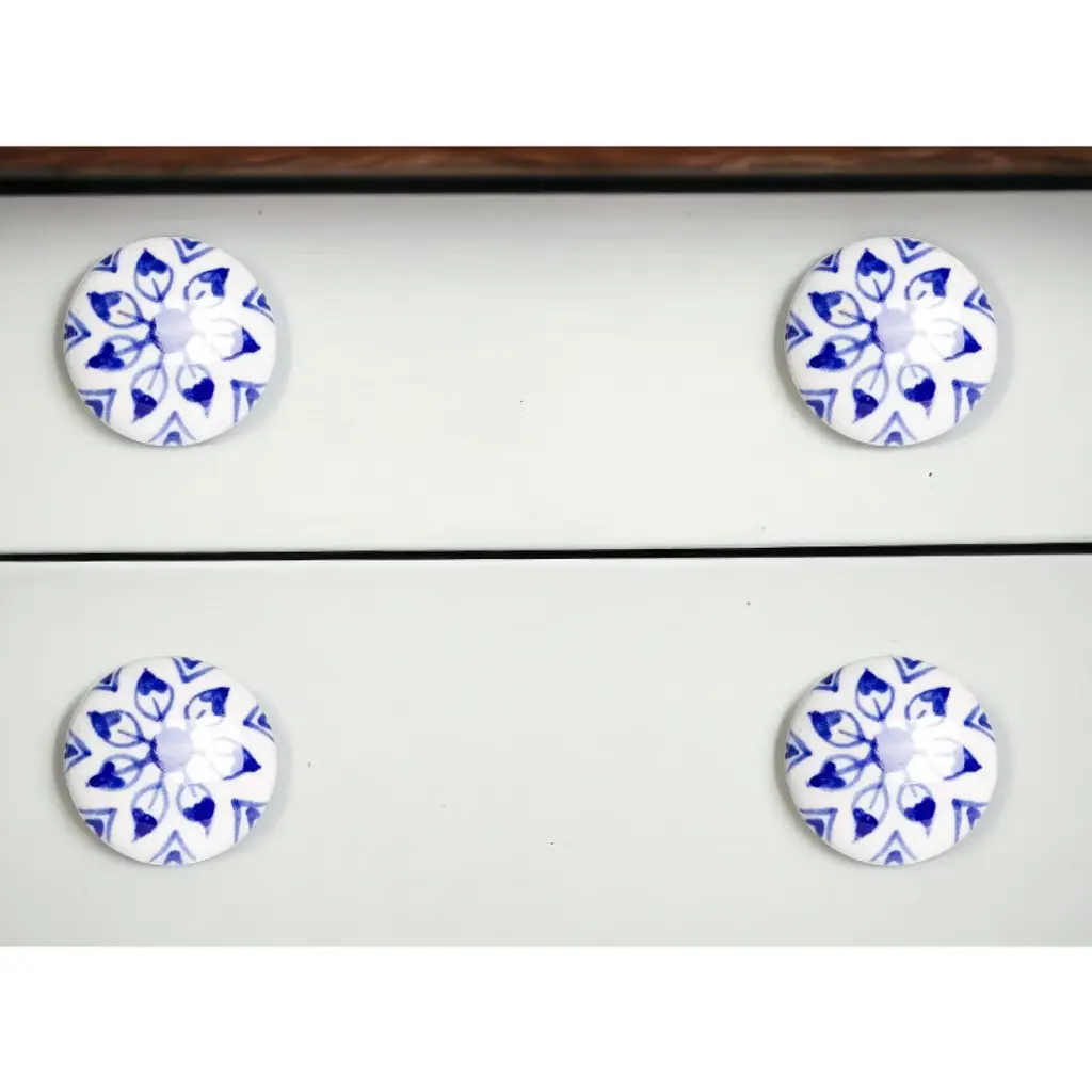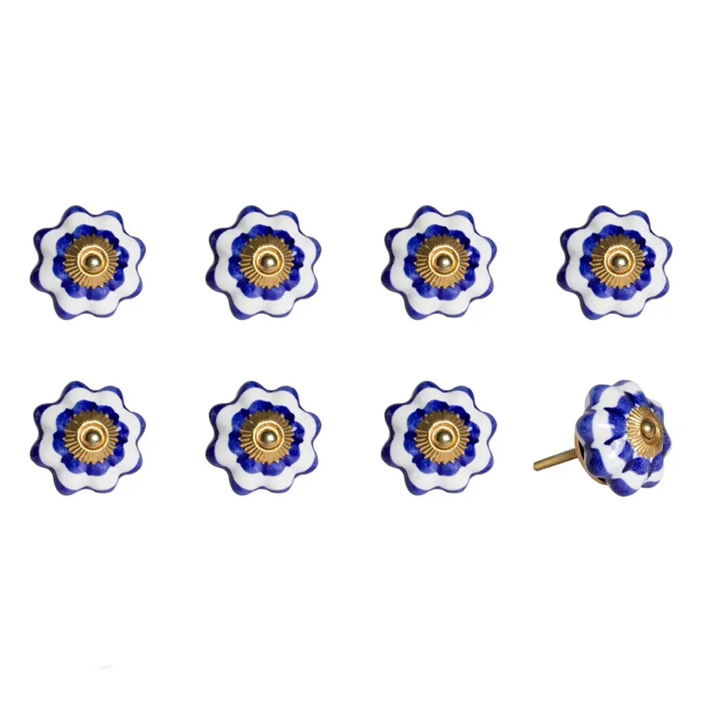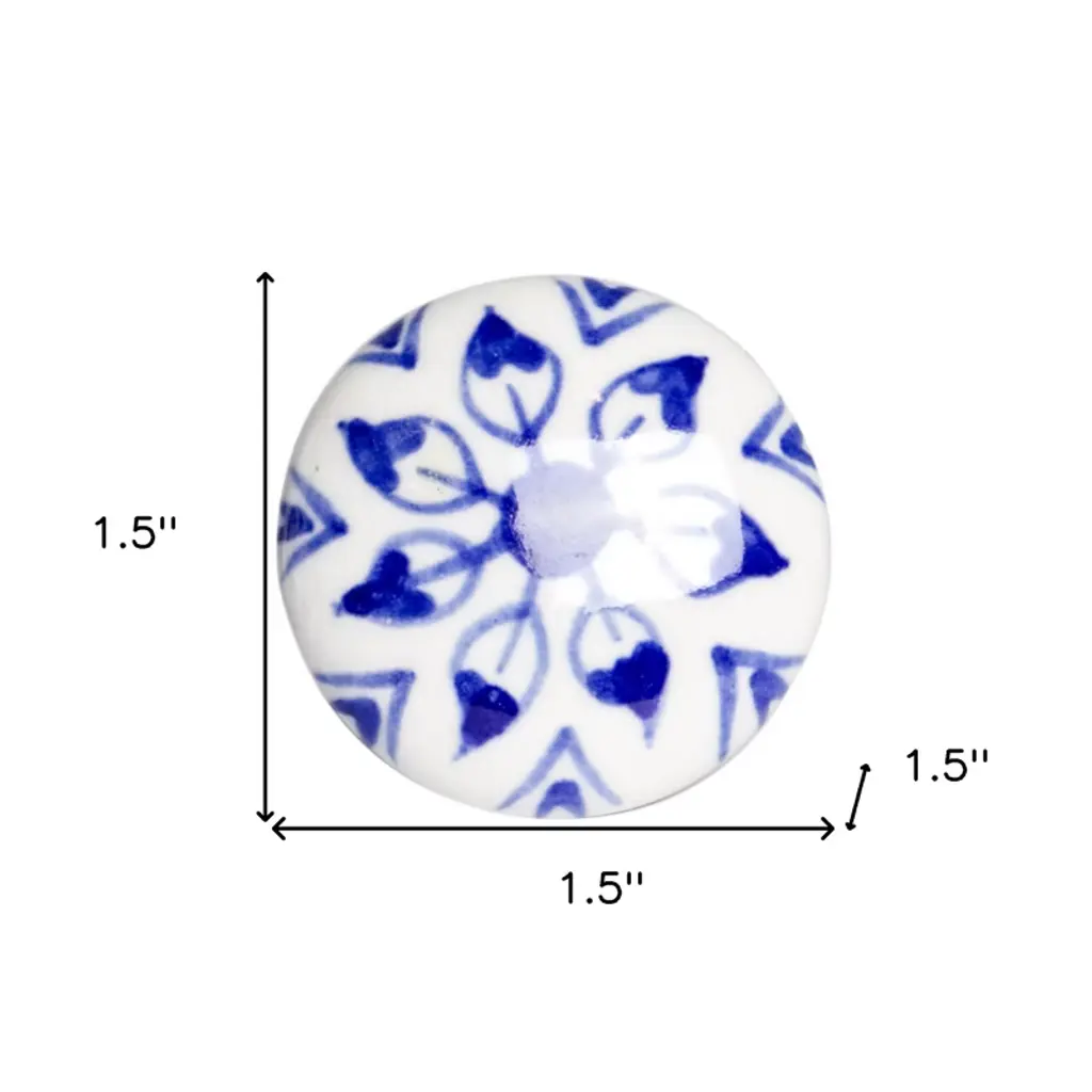 Upgrade your space with a high end look with this set of eight blue and white ceramic and metal drawer pull knobs. A favorite of designers and diyer's alike, these high quality round knob traditional style knobs are versatile in use and will change up the look of your existing furniture and cabinetry in a snap. Hand-painted by talented artisans, these knobs will add a touch of artisanal design. 1.5-inch h x 1.5-inch w x 1.5-inch d.