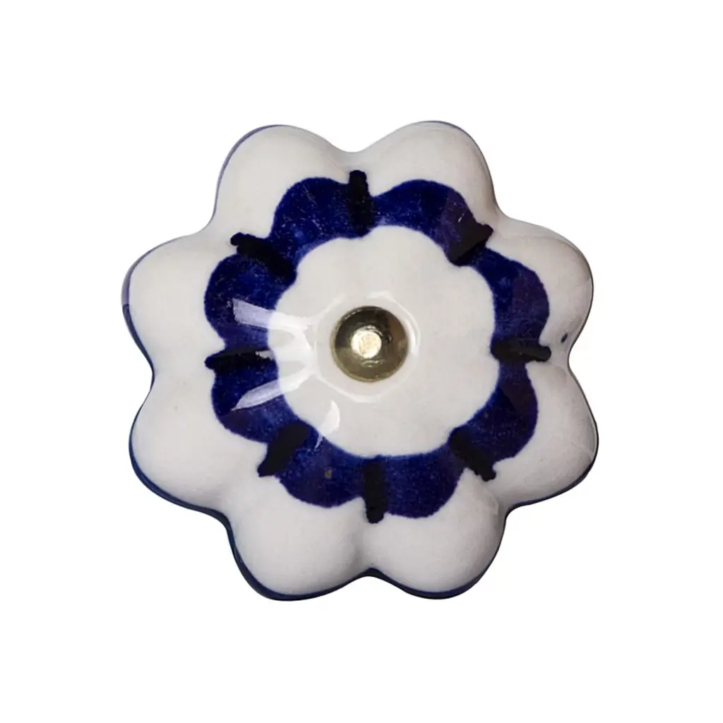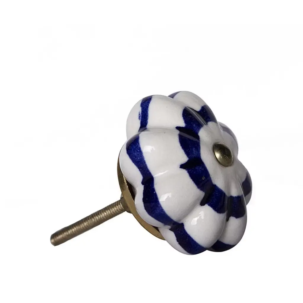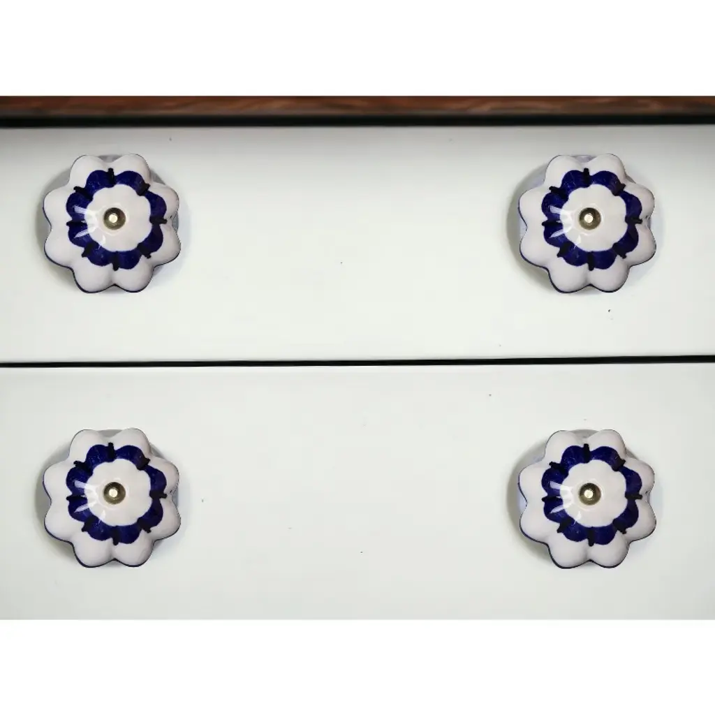 Upgrade your space with a high end look with this set of eight blue and white ceramic and metal drawer pull knobs. A favorite of designers and diyer's alike, these high quality round knob traditional style knobs are versatile in use and will change up the look of your existing furniture and cabinetry in a snap. Hand-painted by talented artisans, these knobs will add a touch of artisanal design. 1.5-inch h x 1.5-inch w x 1.5-inch d.