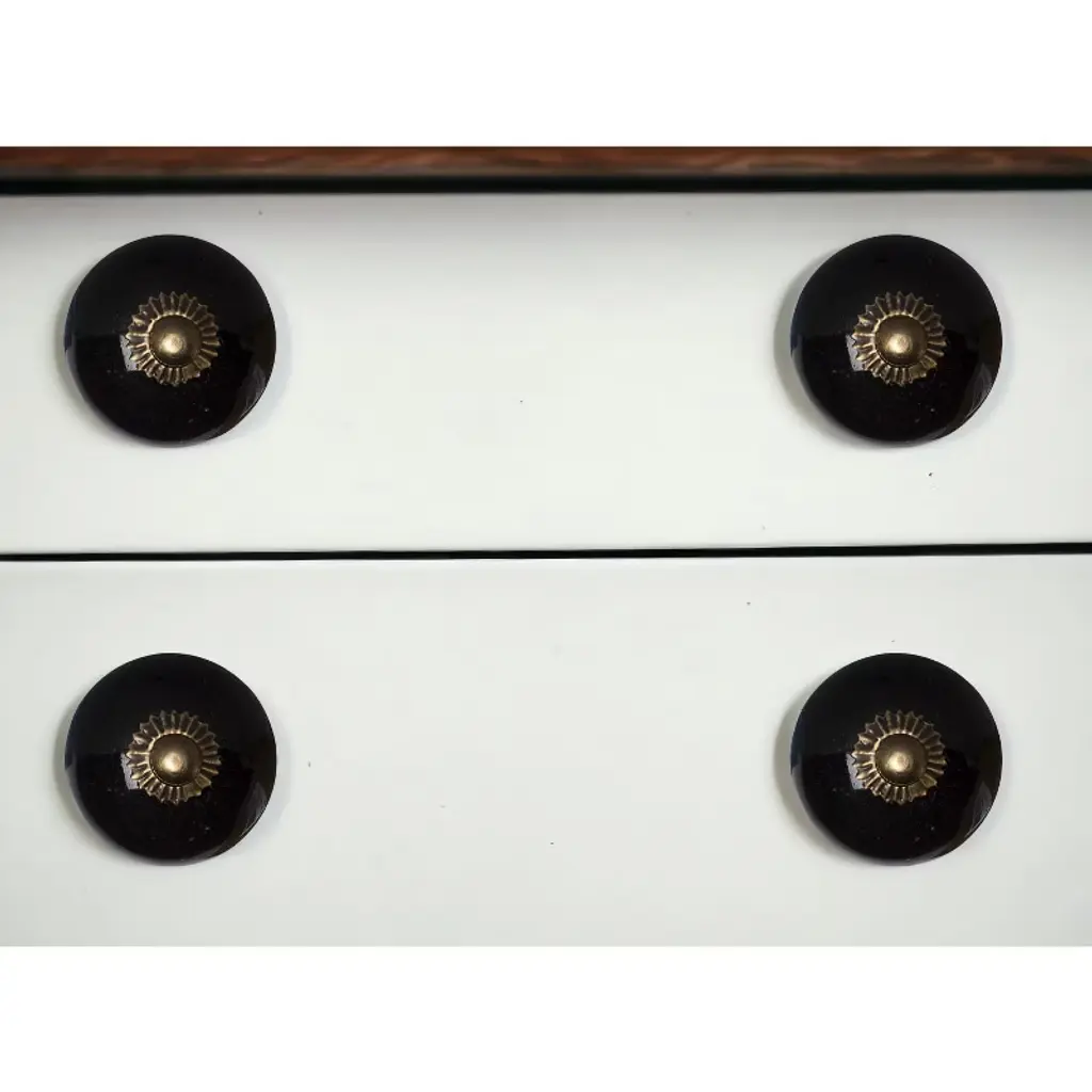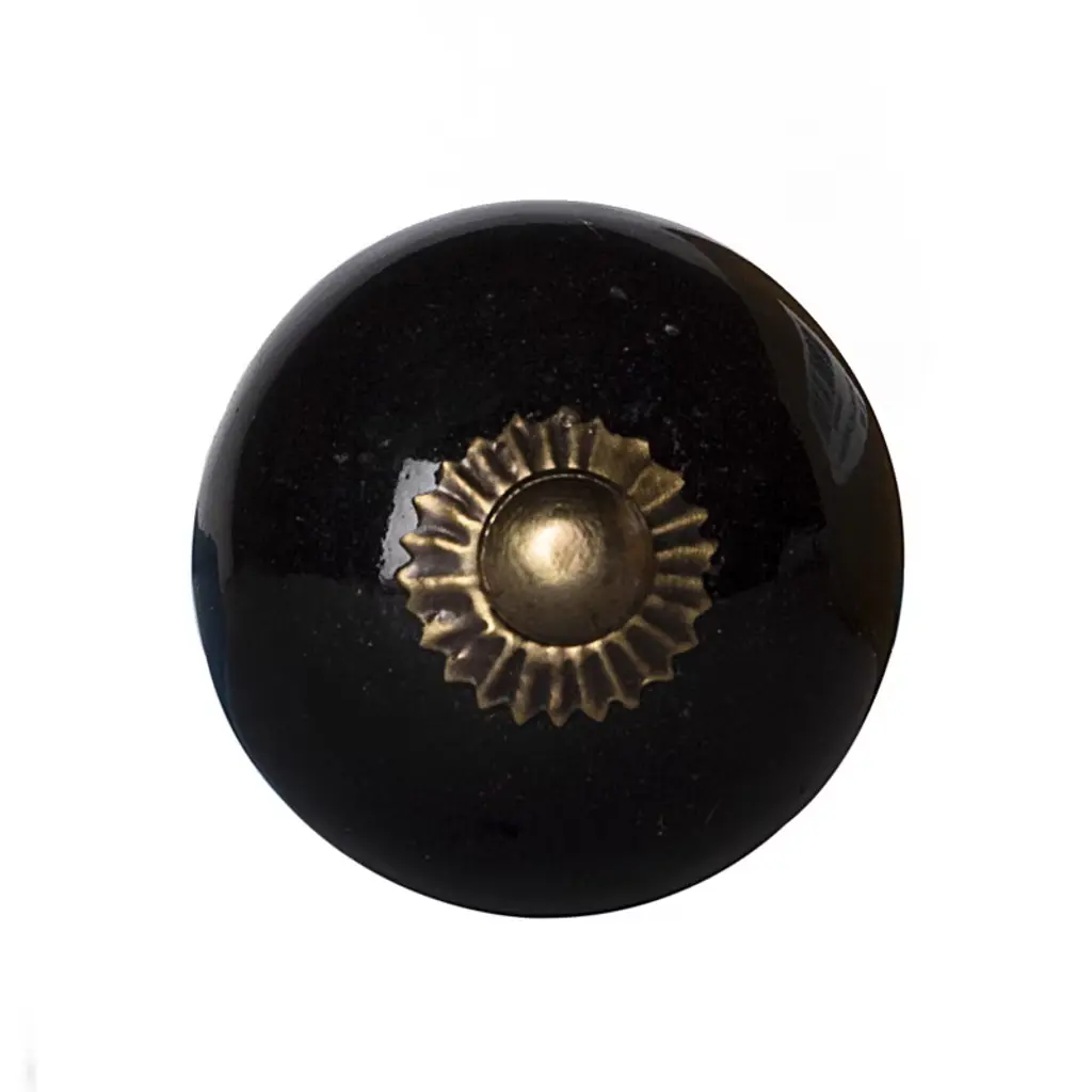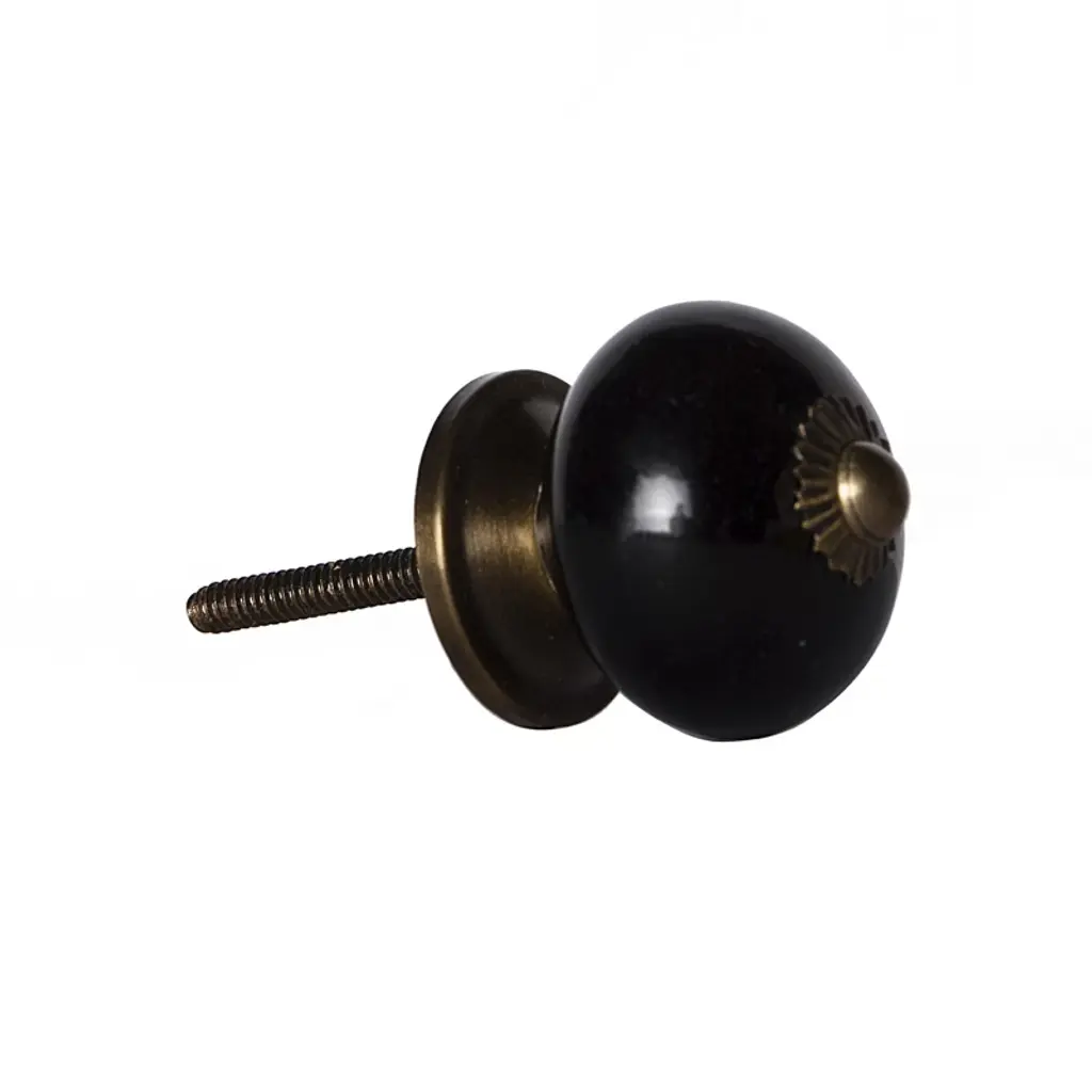 Upgrade your space with a high end look with this set of eight brown and black ceramic and metal drawer pull knobs. A favorite of designers and diyer's alike, these high quality round knob traditional style knobs are versatile in use and will change up the look of your existing furniture and cabinetry in a snap. Hand-painted by talented artisans, these knobs will add a touch of artisanal design. 1.5-inch h x 1.5-inch w x 1.5-inch d.
