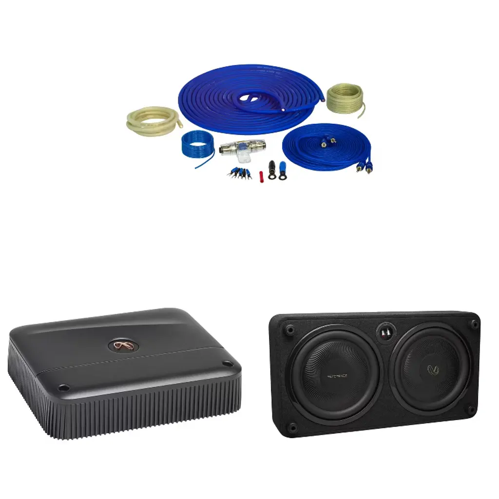 Get ready to upgrade your car audio system with this premium bundle that includes the following: 1x Stinger SS1200XS 4GA Copper 1200W Complete Wiring Kit - (SS1200XS) - Full copper construction for excellent current transfer - Quality twisted pair interconnects for noise-free signal transfer - Ultra-flexible speaker wire, remote turn-on, and water-resistant high current fuse holder - Dimensions: Complete installation package for your next 2 channel amplifier 1x Infinity REFERENCE1000SSL SINGLE 10" THIN enclosure with Passive Radiator - (REFERENCE1000SSL) - Features a down-firing sealed enclosure with a passive radiator - Removable feet and logo badge for flexible placement and customization - Sturdy medium-density fiberboard construction with black carpet covering - Dimensions: 334mmD x 630mmW x 115mmH (13-1/8"D x 24-7/8"W x 4-1/2"H) 1x Infinity Reference-6001A Reference Series Mono, 600w X 1 Amplifier With Bass Knob - (Reference-6001A) - High performance 600-Watt Mono Subwoofer amplifier - Class D design for minimal strain on your vehicle's electrical system - RBC wired remote for convenient volume adjustment - Compact size with full on-board protection - Dimensions: WxHxD=220mm x 55.5mm x 180mm (8-11/16” x 2-3/16" x 7-1/8”) Upgrade your car audio experience with this powerful bundle that provides premium components for exceptional sound quality and performance. Perfect for enthusiasts looking to enhance their driving experience with deep, accurate bass and reliable power delivery. Transform your vehicle into a mobile concert hall with the Stinger wiring kit, the Infinity subwoofer enclosure, and the Reference Series amplifier. Take your music to the next level and enjoy crystal-clear audio with this all-inclusive bundle designed for audiophiles and car audio lovers.