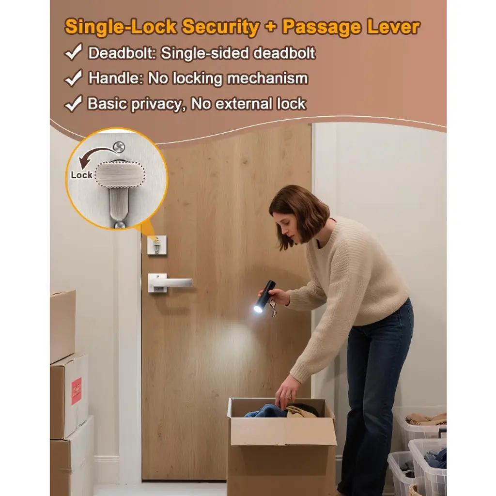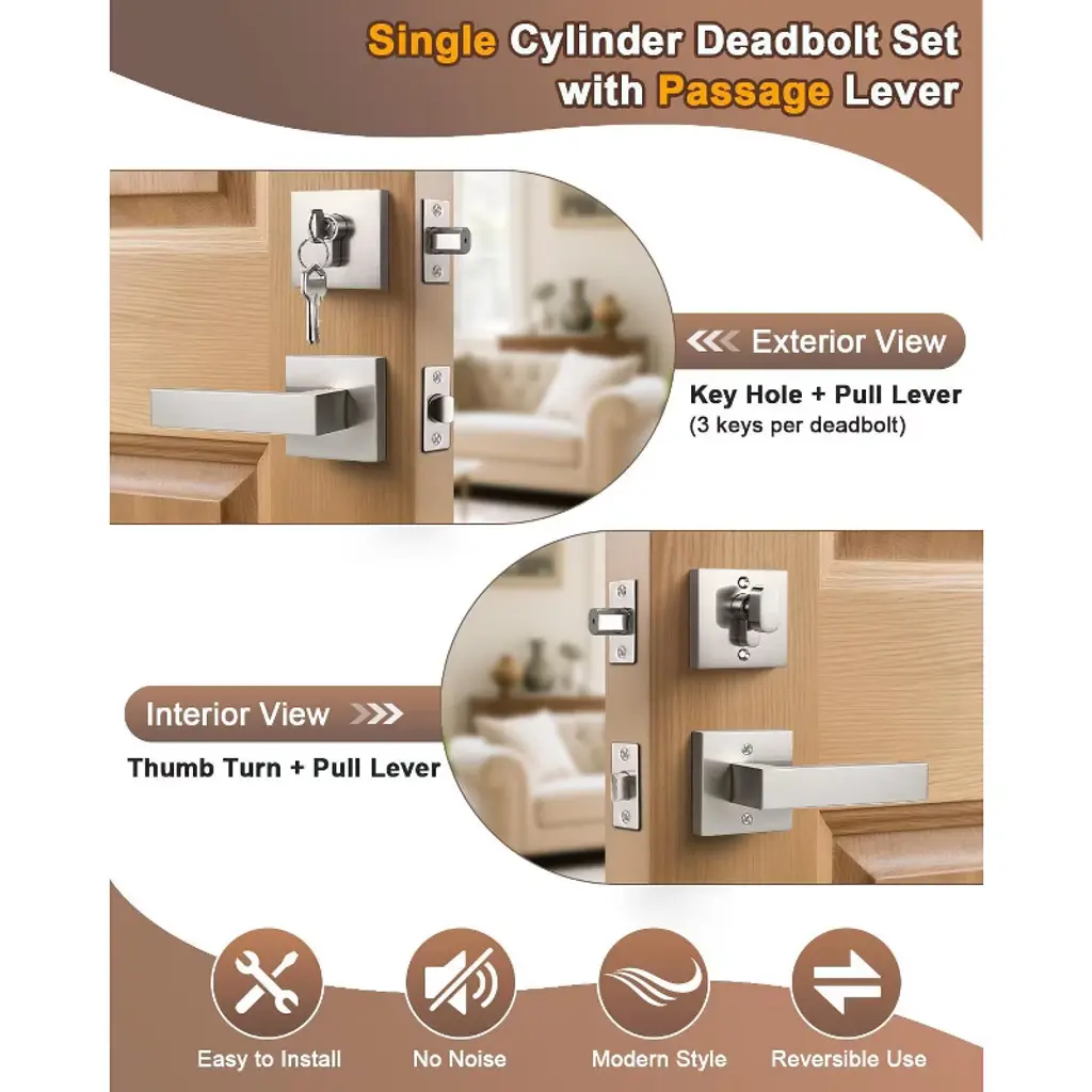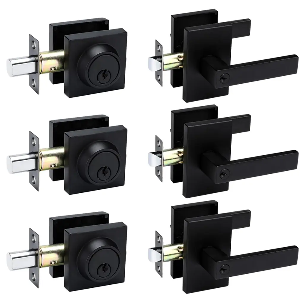 Upgrade your door security with this 3 - pack square door knob and deadbolt set. The set features a single - sided deadbolt with a passage lever. The exterior deadbolt is key - operated for security, while the interior passage lever allows for keyless operation, perfect for interior doors. Each deadbolt comes with 3 identical keys, so one key can open all designated doors, offering great convenience for families and property owners. Made from high - quality zinc alloy, it has passed strict tests and is built to last over 10 years. The adjustable latch fits standard door thicknesses, and installation is a breeze with just a screwdriver and all necessary parts included. Whether it's for your home, private office, or storage room, this lockset provides both security and convenience, suitable for various door styles in residential and commercial applications.