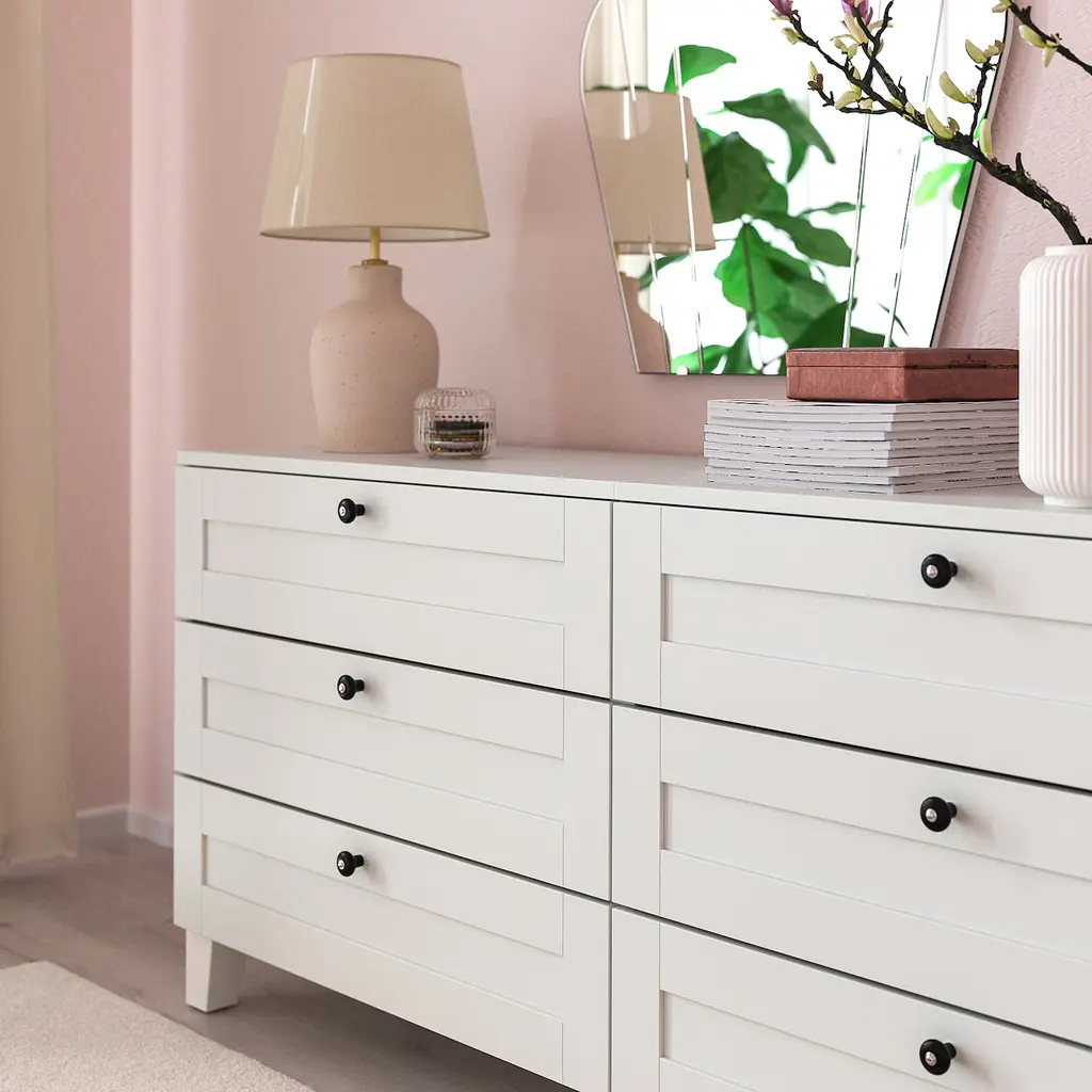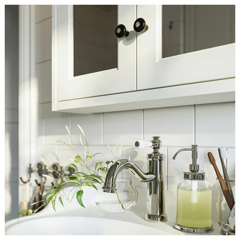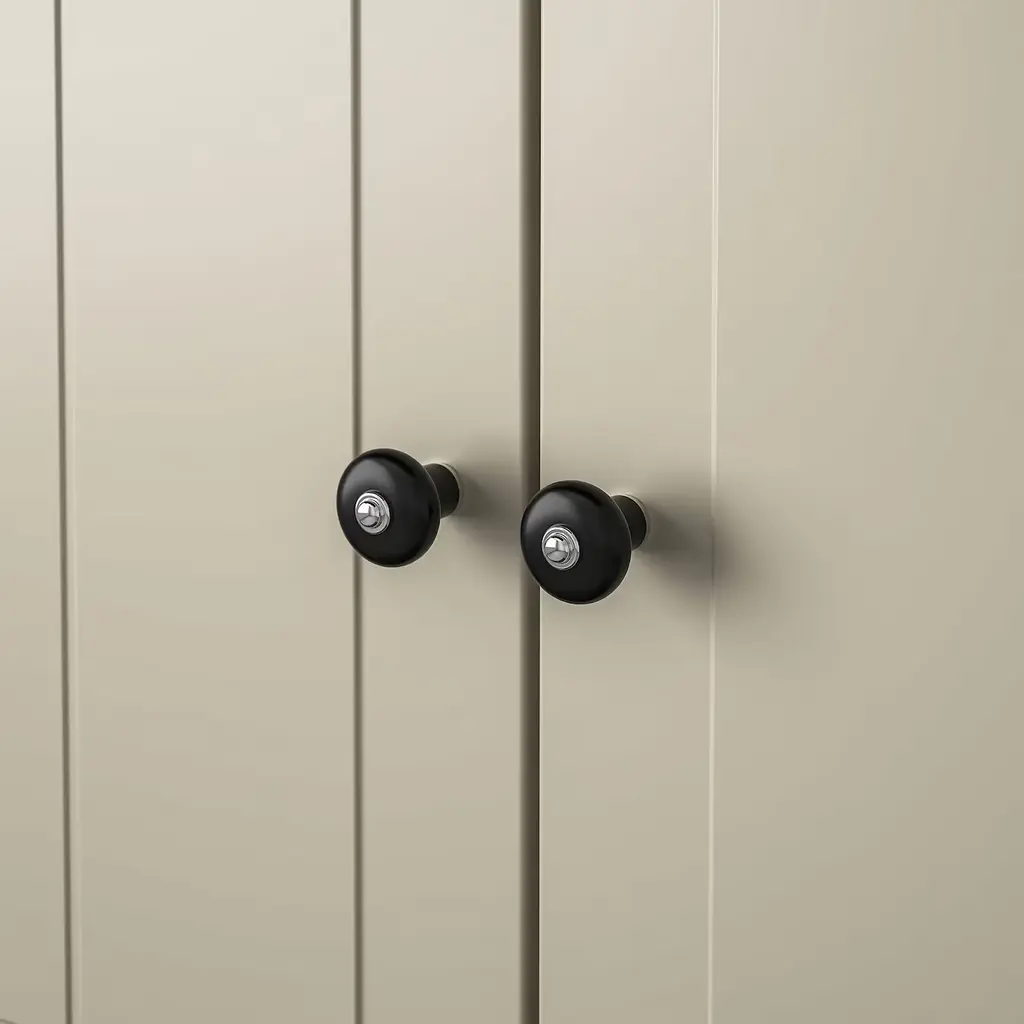 KLINGSTORP Knob - black/chrome plated 1 3/16 ". These matt black porcelain-look knobs give a traditional touch to your kitchen. The knob is wider at the top to ensure easy gripping. Suitable for doors ½"-¾" thick. Screws included.