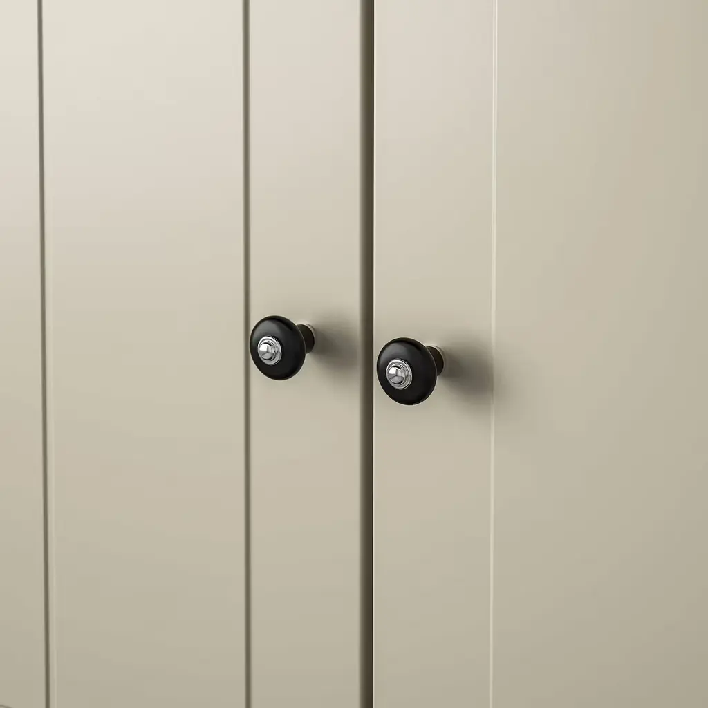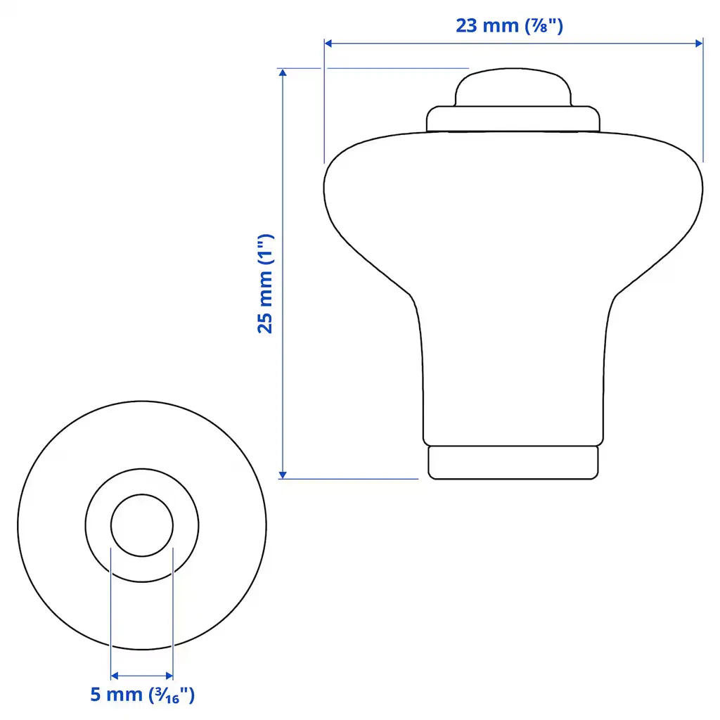 KLINGSTORP Knob - black/chrome plated 7/8 ". These matt black porcelain-look knobs give a traditional touch to your kitchen. The knob is wider at the top to ensure easy gripping. Suitable for doors ½"-¾" thick. Screws included.