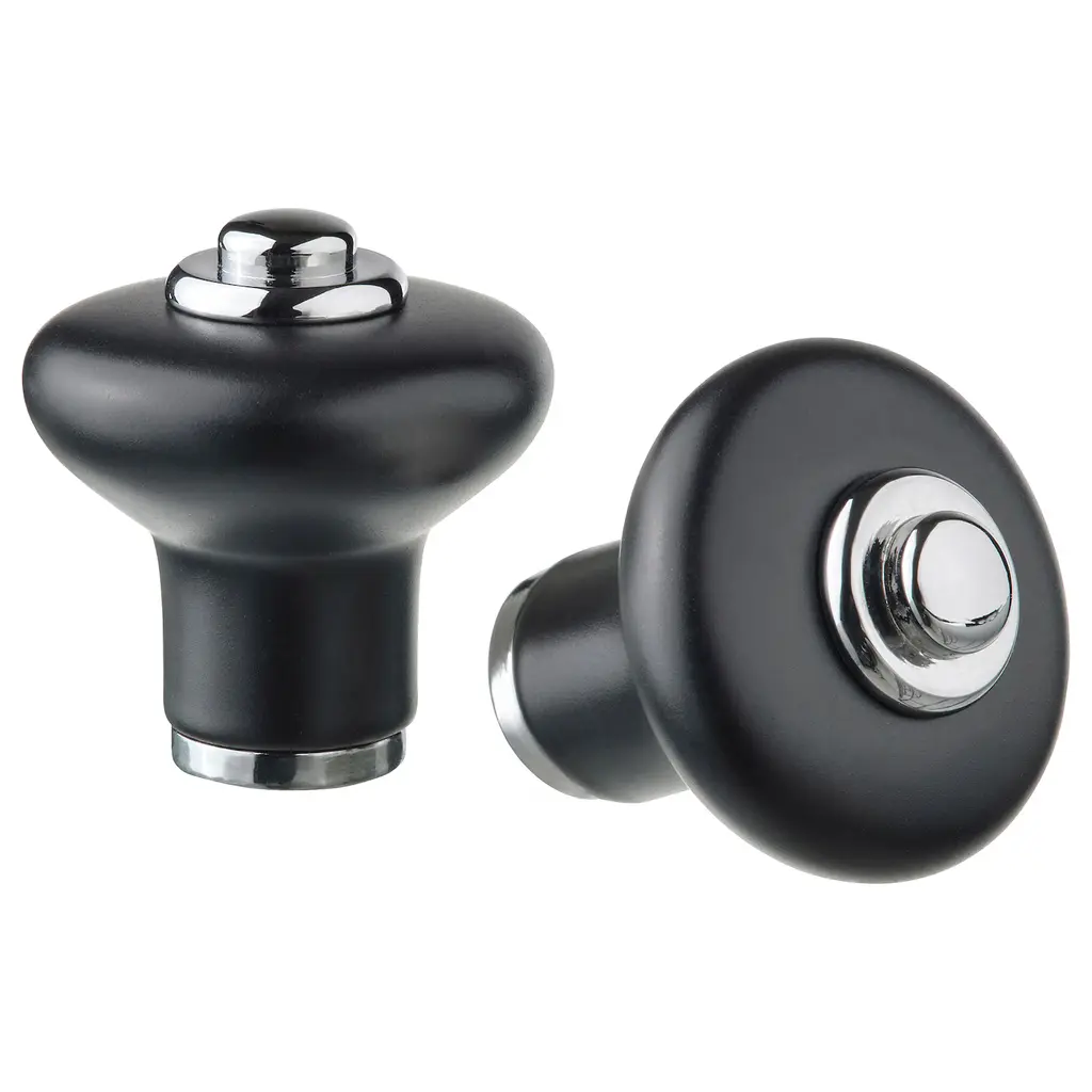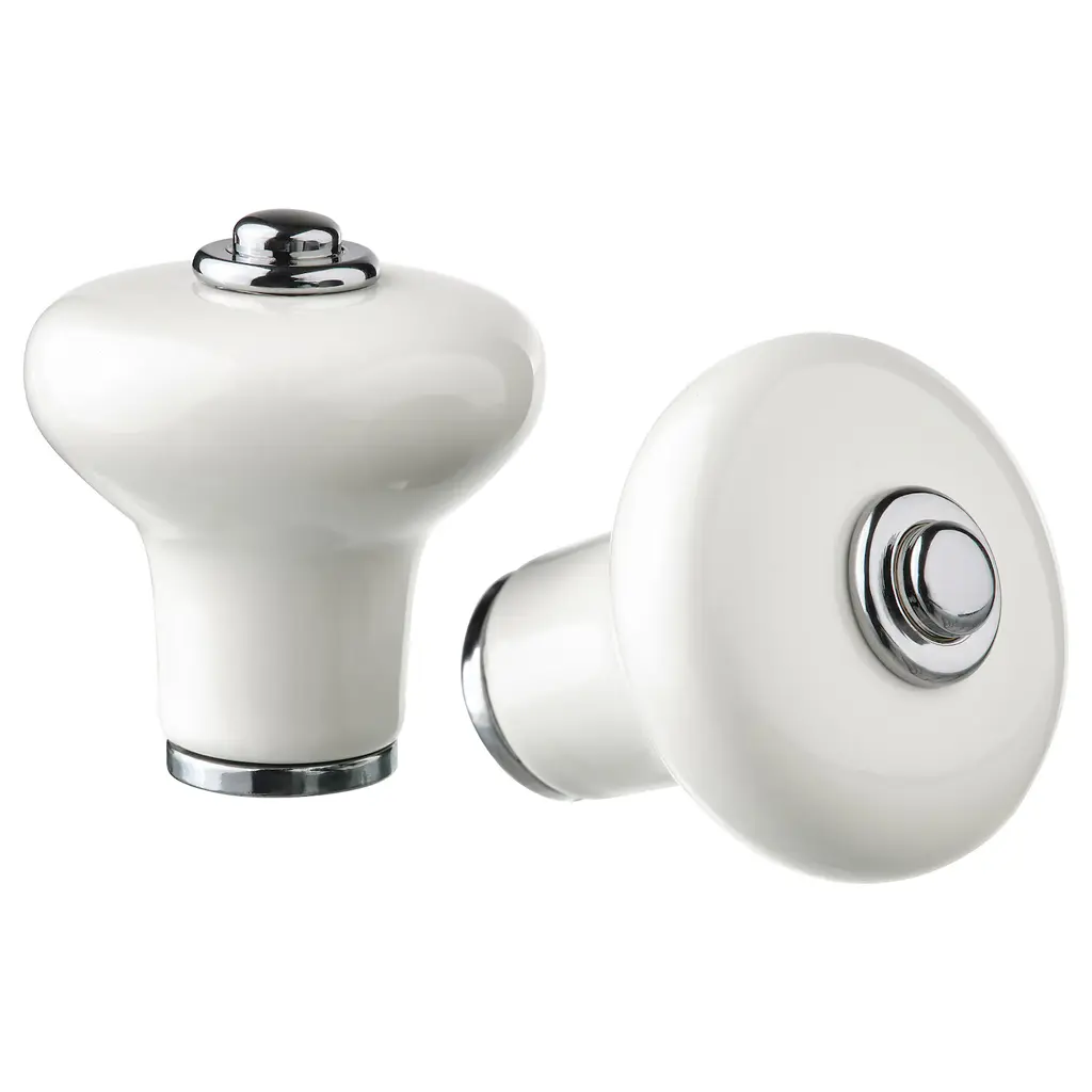 KLINGSTORP Knob - off-white/chrome plated 7/8 ". These white porcelain-look knobs give a traditional touch to your kitchen. The knob is wider at the top to ensure easy gripping. Suitable for doors ½"-¾" thick. Screws included.