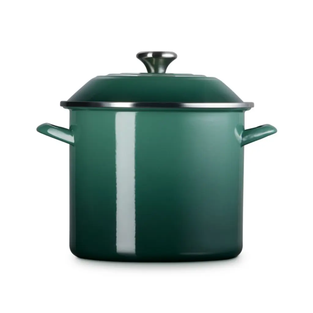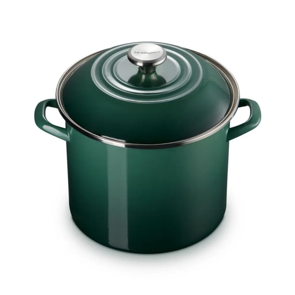 Enamel in a deep, lush green inspired by artichokes coats this versatile stockpot. The stain-resistant porcelain enamel glazes a base of lightweight, fast-heating and responsive carbon steel. Two stainless steel accentsa rim that prevents chipping and a stay-cool knob on the lidadd gleaming highlights. The large-capacity stockpot is fashioned with tall, straight sides, making it ideal for soups, stocks, pasta and seafood boils.Revered by both professional chefs and home cooks since its 1925 debut, Le Creuset's classic French cookware is prized for its utilitarian beauty and performance.