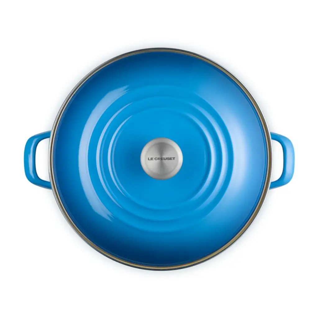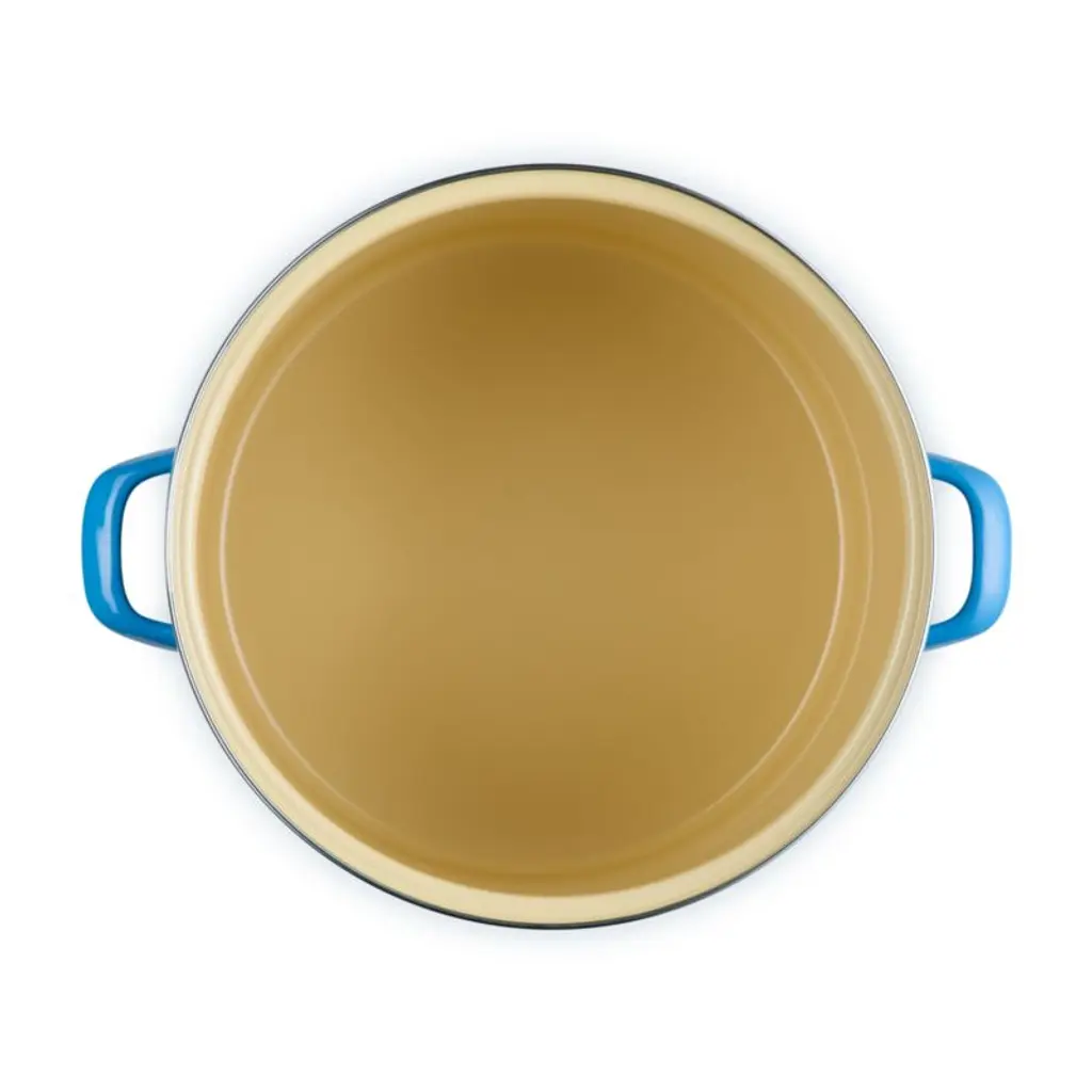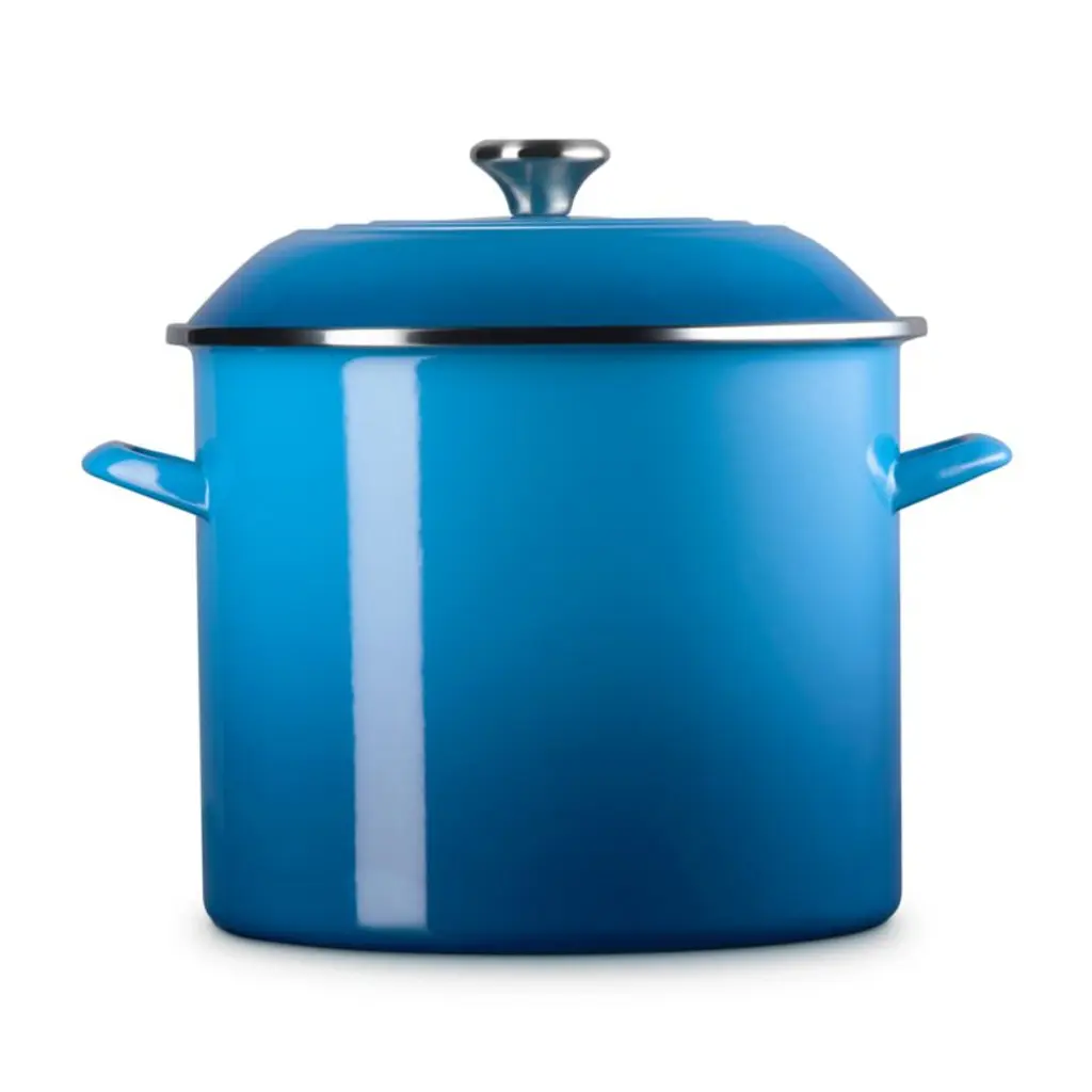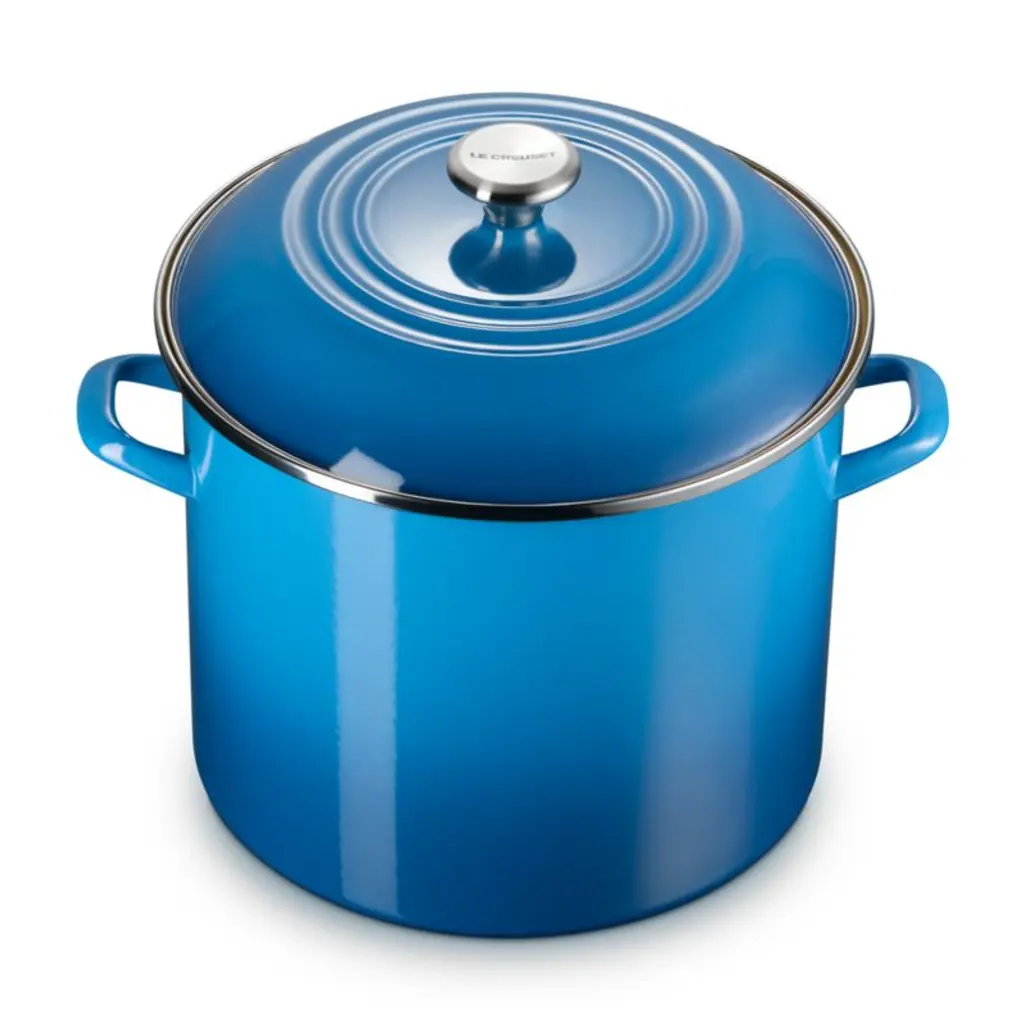 Enamel in a bright ocean blue inspired by the French port city of Marseille coats this versatile stockpot. The stain-resistant porcelain enamel glazes a base of lightweight, fast-heating and responsive carbon steel. Two stainless steel accentsa rim that prevents chipping and a stay-cool knob on the lidadd gleaming highlights. The oversized stockpot is fashioned with tall, straight sides, making it ideal for soups, stocks, pasta and seafood boils.Revered by both professional chefs and home cooks since its 1925 debut, Le Creuset's classic French cookware is prized for its utilitarian beauty and performance.