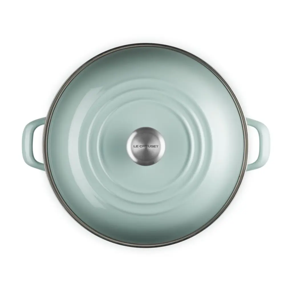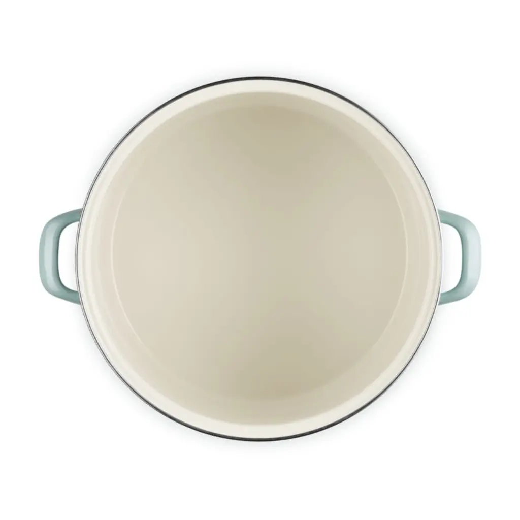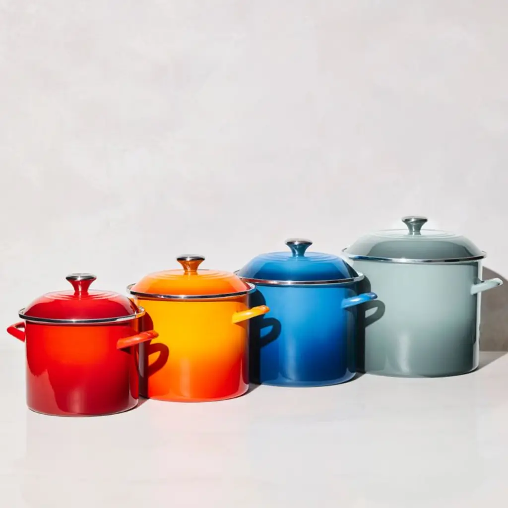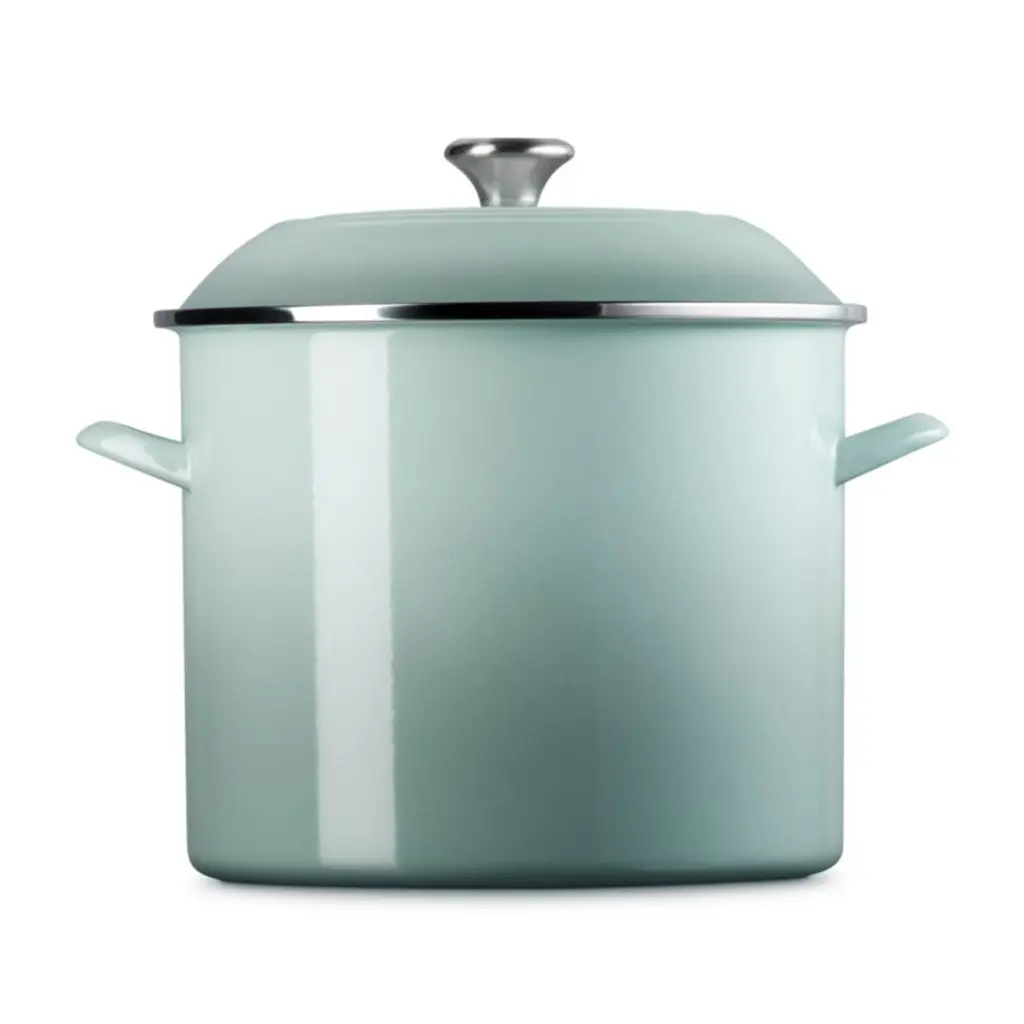 Enamel in a serene blend of grey, green and blue inspired by sea salt coats this versatile stockpot. The stain-resistant porcelain enamel glazes a base of lightweight, fast-heating and responsive carbon steel. Two stainless steel accentsa rim that prevents chipping and a stay-cool knob on the lidadd gleaming highlights. The oversized stockpot is fashioned with tall, straight sides, making it ideal for soups, stocks, pasta and seafood boils.Revered by both professional chefs and home cooks since its 1925 debut, Le Creuset's classic French cookware is prized for its utilitarian beauty and performance.