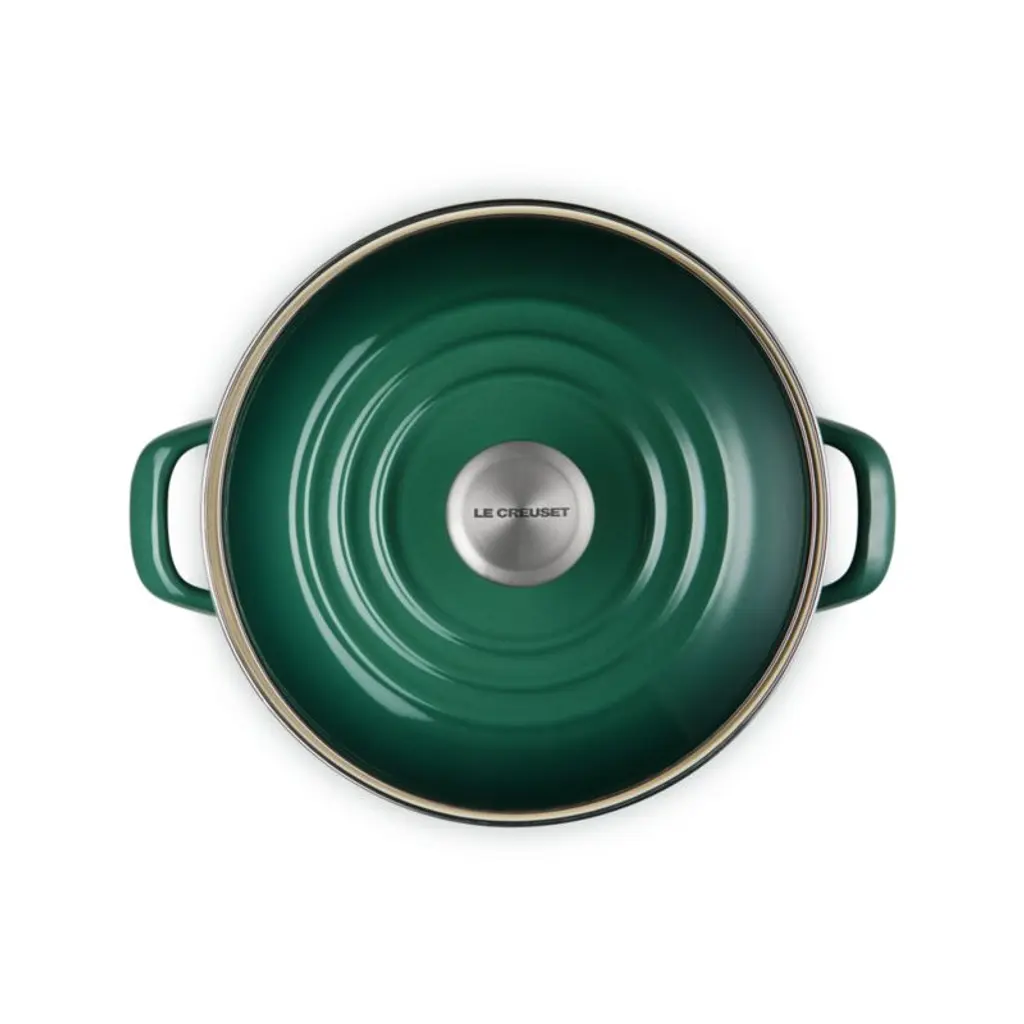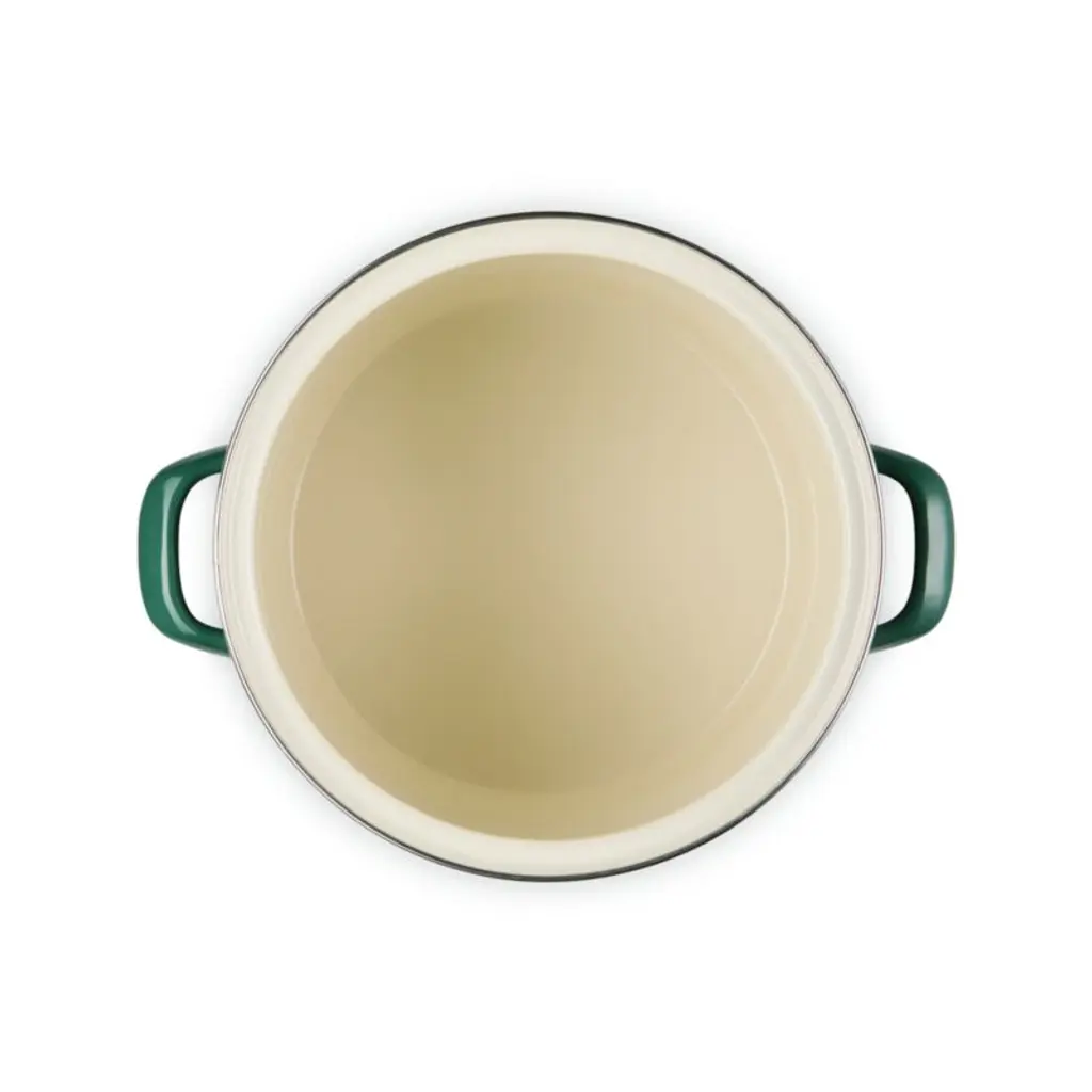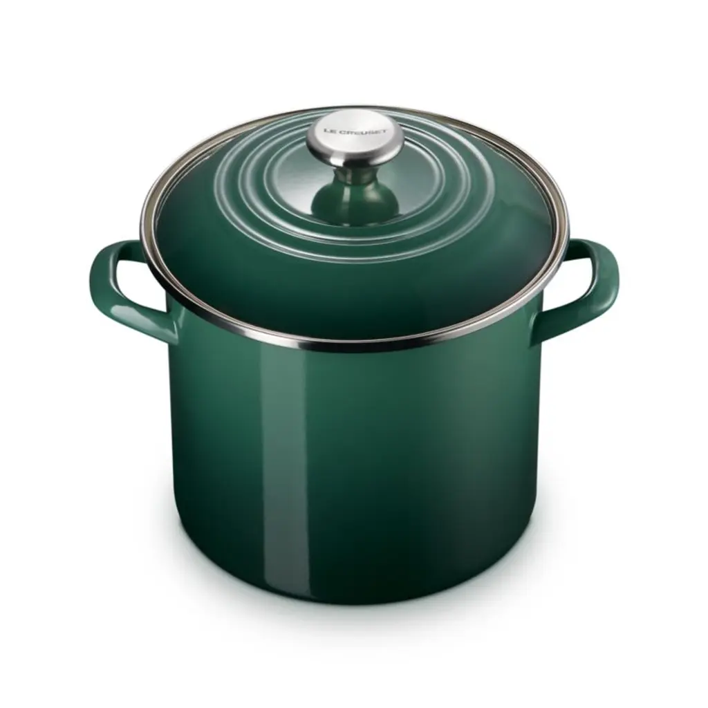 Enamel in a deep, lush green inspired by artichokes coats this versatile stockpot. The stain-resistant porcelain enamel glazes a base of lightweight, fast-heating and responsive carbon steel. Two stainless steel accentsa rim that prevents chipping and a stay-cool knob on the lidadd gleaming highlights. The large-capacity stockpot is fashioned with tall, straight sides, making it ideal for soups, stocks, pasta and seafood boils.Revered by both professional chefs and home cooks since its 1925 debut, Le Creuset's classic French cookware is prized for its utilitarian beauty and performance.