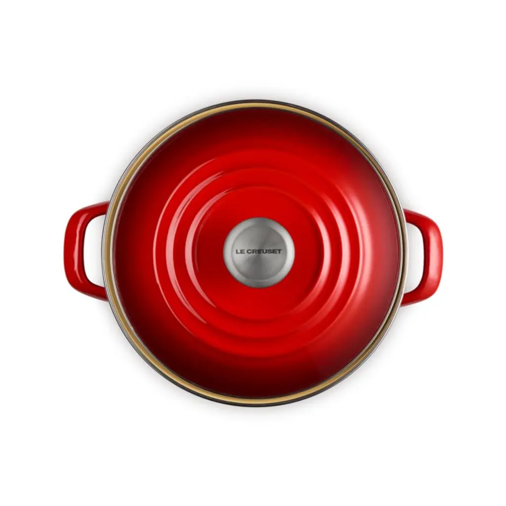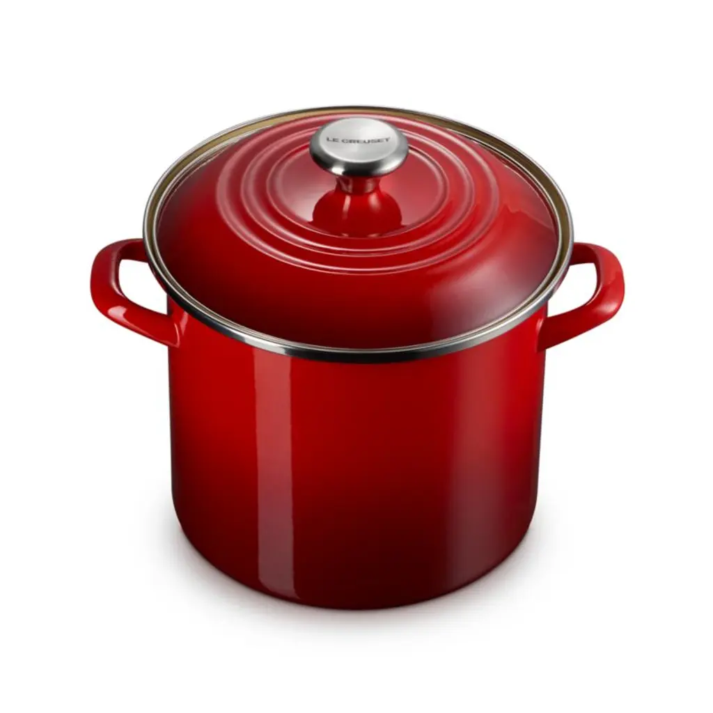 Enamel in a deep, ombre red inspired by cherries coats this versatile stockpot. The stain-resistant porcelain enamel glazes a base of lightweight, fast-heating and responsive carbon steel. Two stainless steel accentsa rim that prevents chipping and a stay-cool knob on the lidadd gleaming highlights. The large-capacity stockpot is fashioned with tall, straight sides, making it ideal for soups, stocks, pasta and seafood boils.Revered by both professional chefs and home cooks since its 1925 debut, Le Creuset's classic French cookware is prized for its utilitarian beauty and performance.