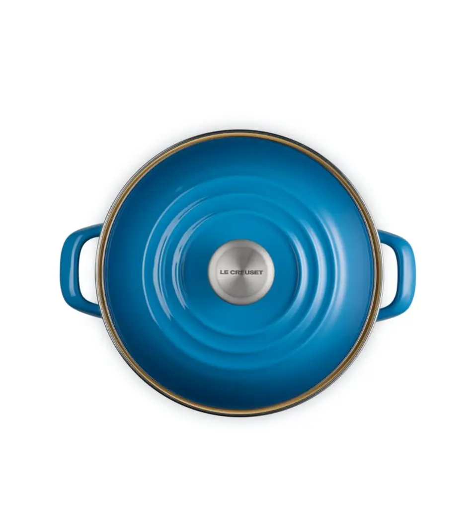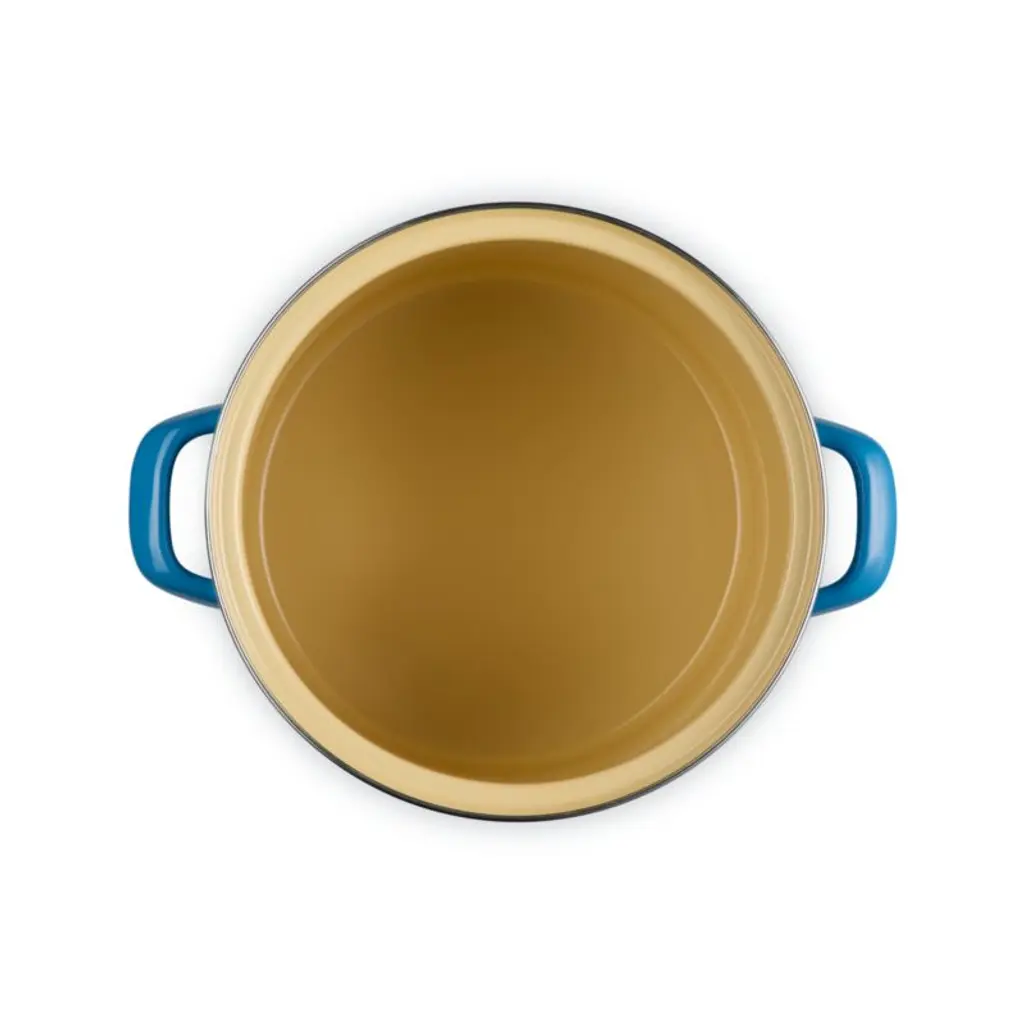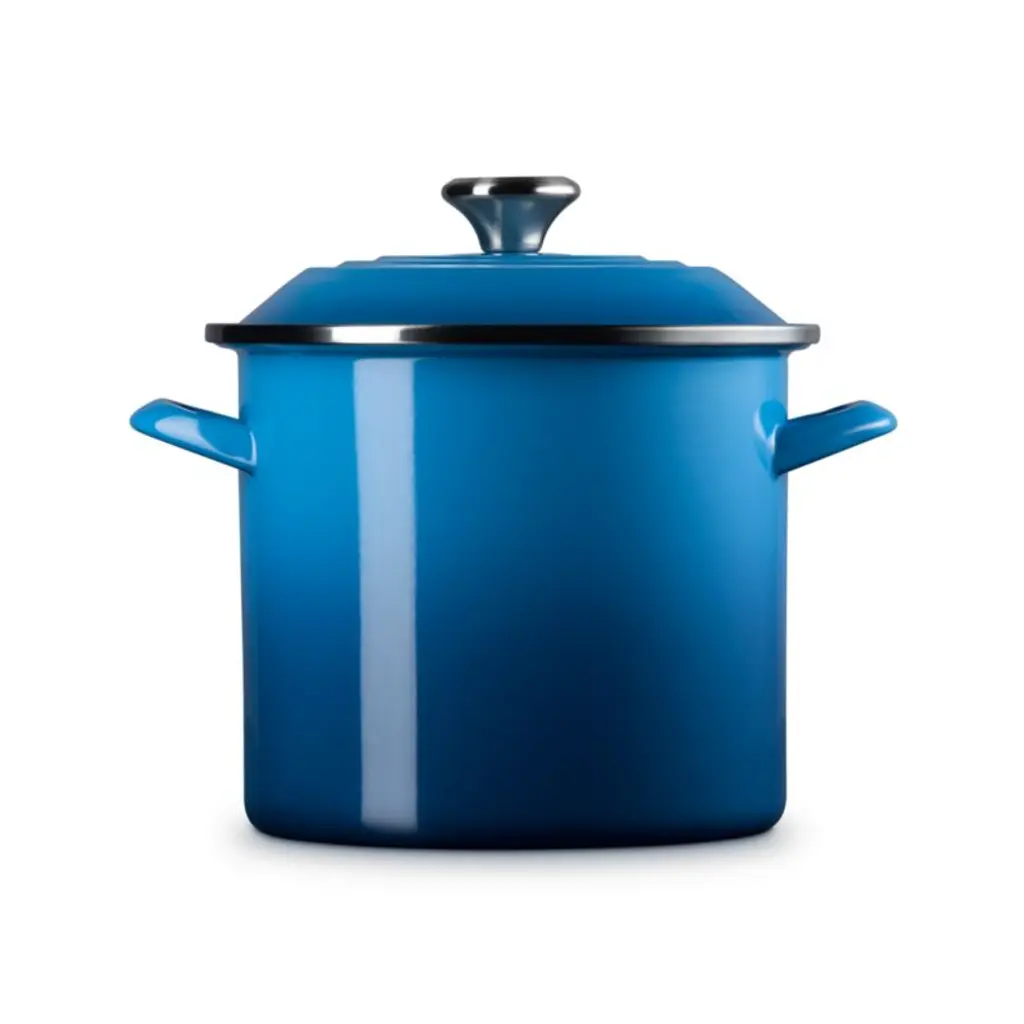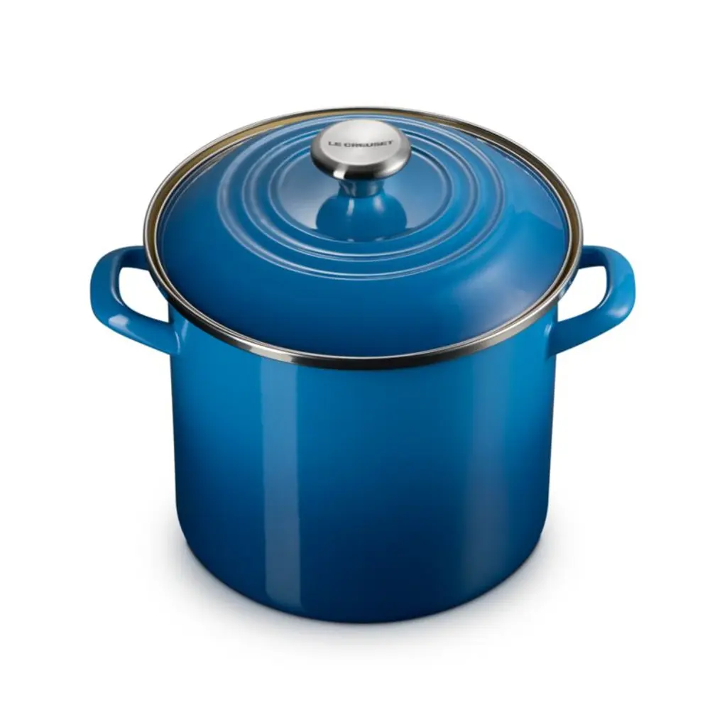 Enamel in a bright ocean blue inspired by the French port city of Marseille coats this versatile stockpot. The stain-resistant porcelain enamel glazes a base of lightweight, fast-heating and responsive carbon steel. Two stainless steel accentsa rim that prevents chipping and a stay-cool knob on the lidadd gleaming highlights. The large-capacity stockpot is fashioned with tall, straight sides, making it ideal for soups, stocks, pasta and seafood boils.Revered by both professional chefs and home cooks since its 1925 debut, Le Creuset's classic French cookware is prized for its utilitarian beauty and performance.