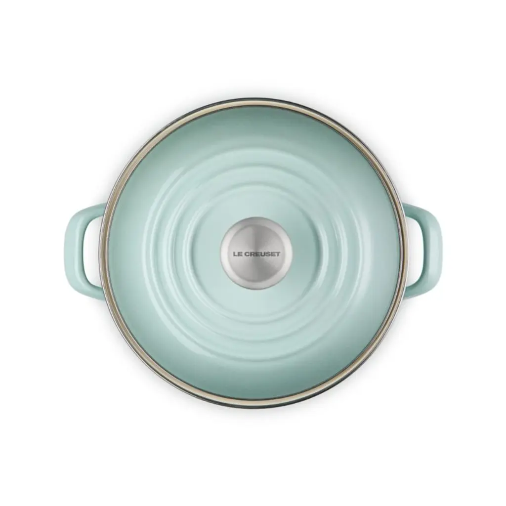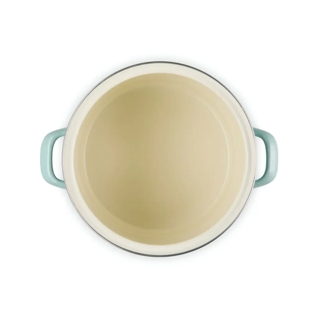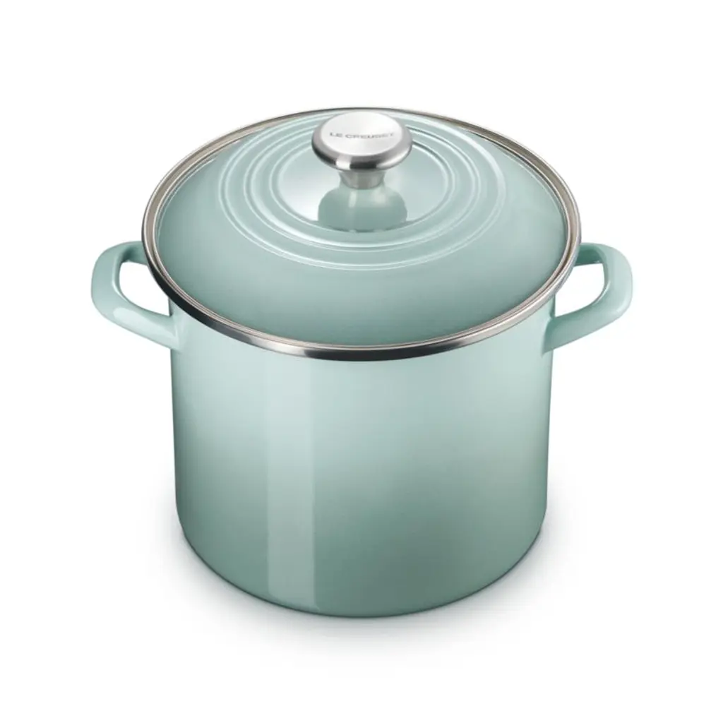 Enamel in a serene blend of grey, green and blue inspired by sea salt coats this versatile stockpot. The stain-resistant porcelain enamel glazes a base of lightweight, fast-heating and responsive carbon steel. Two stainless steel accentsa rim that prevents chipping and a stay-cool knob on the lidadd gleaming highlights. The large-capacity stockpot is fashioned with tall, straight sides, making it ideal for soups, stocks, pasta and seafood boils.Revered by both professional chefs and home cooks since its 1925 debut, Le Creuset's classic French cookware is prized for its utilitarian beauty and performance.