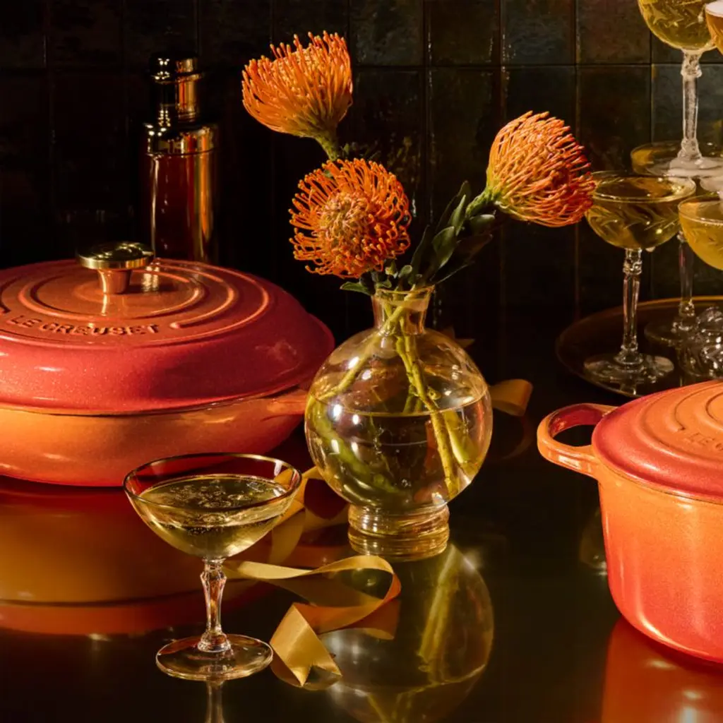 Le Creuset turns up the heat to celebrate its 100th anniversary year with Flamme Doree ("golden flame") a special edition of its iconic Flame cast iron cookware. Adding to the dynamic look of the trademark ombre red-orange enamel finish in fiery shades of molten iron, a gold knob tops the pot lids with a graphic pattern inspired by a crucible gripped by tongs. The braiser pan is crafted with a specially designed "all-round" lip for drip-free pouring with either hand, and the close-fitting lid creates a blanket of heat for even cooking and superb braising.Revered by both professional chefs and home cooks since its 1925 debut, Le Creuset's classic French cookware is prized for its utilitarian beauty and unsurpassed heat retention.
